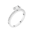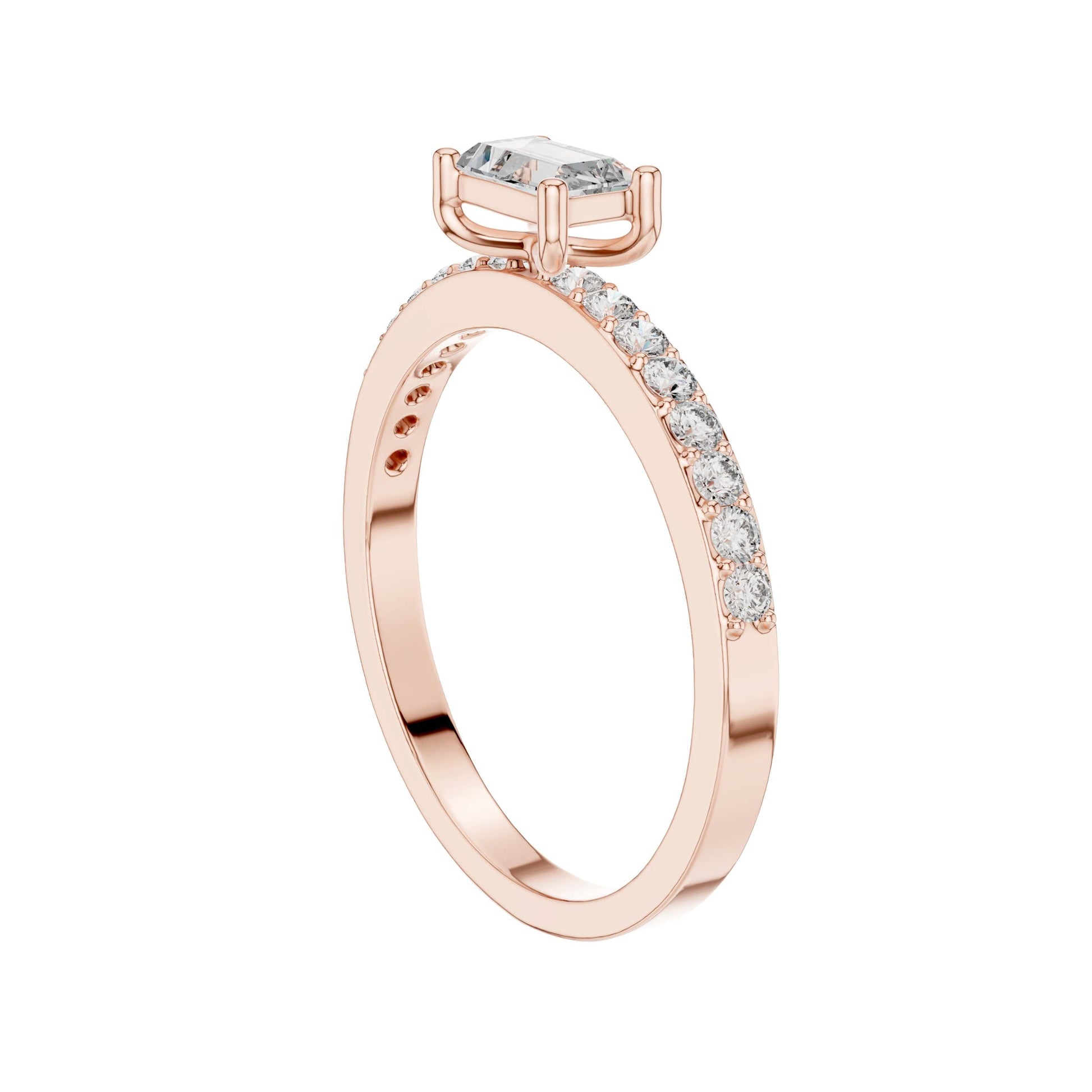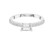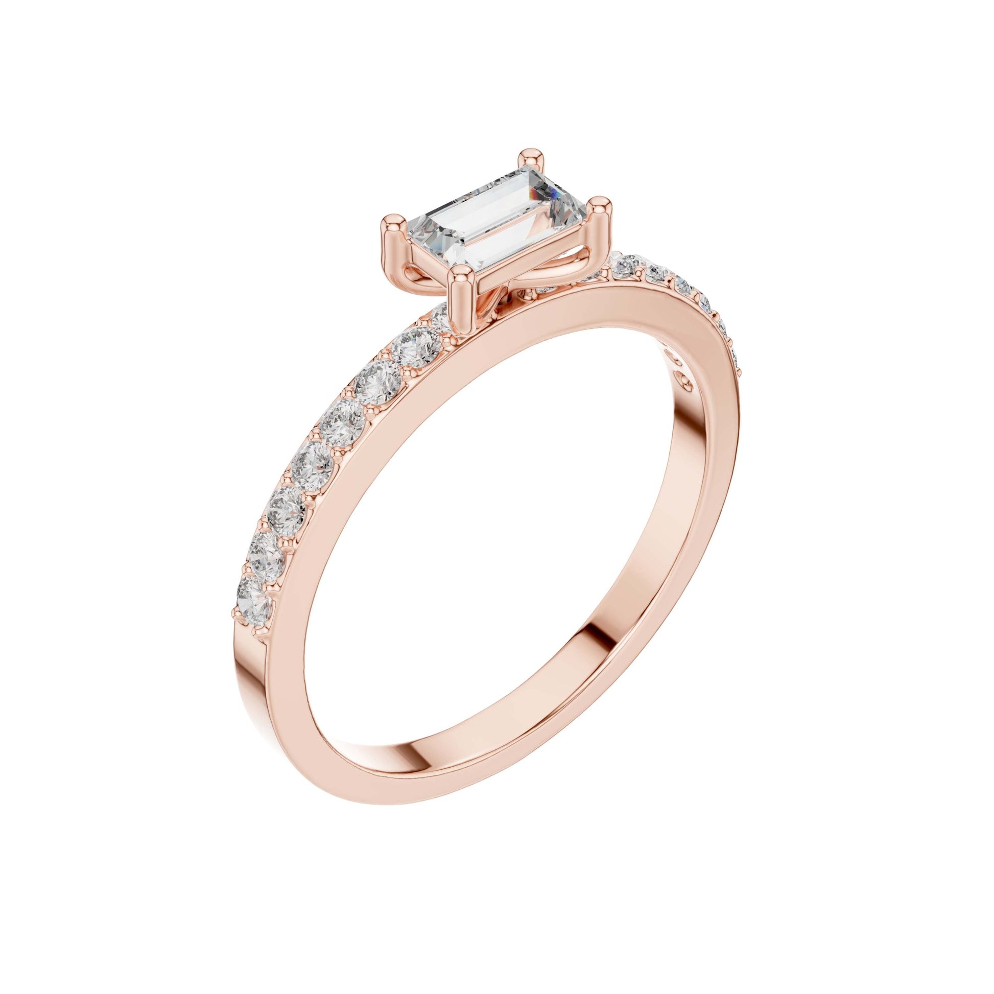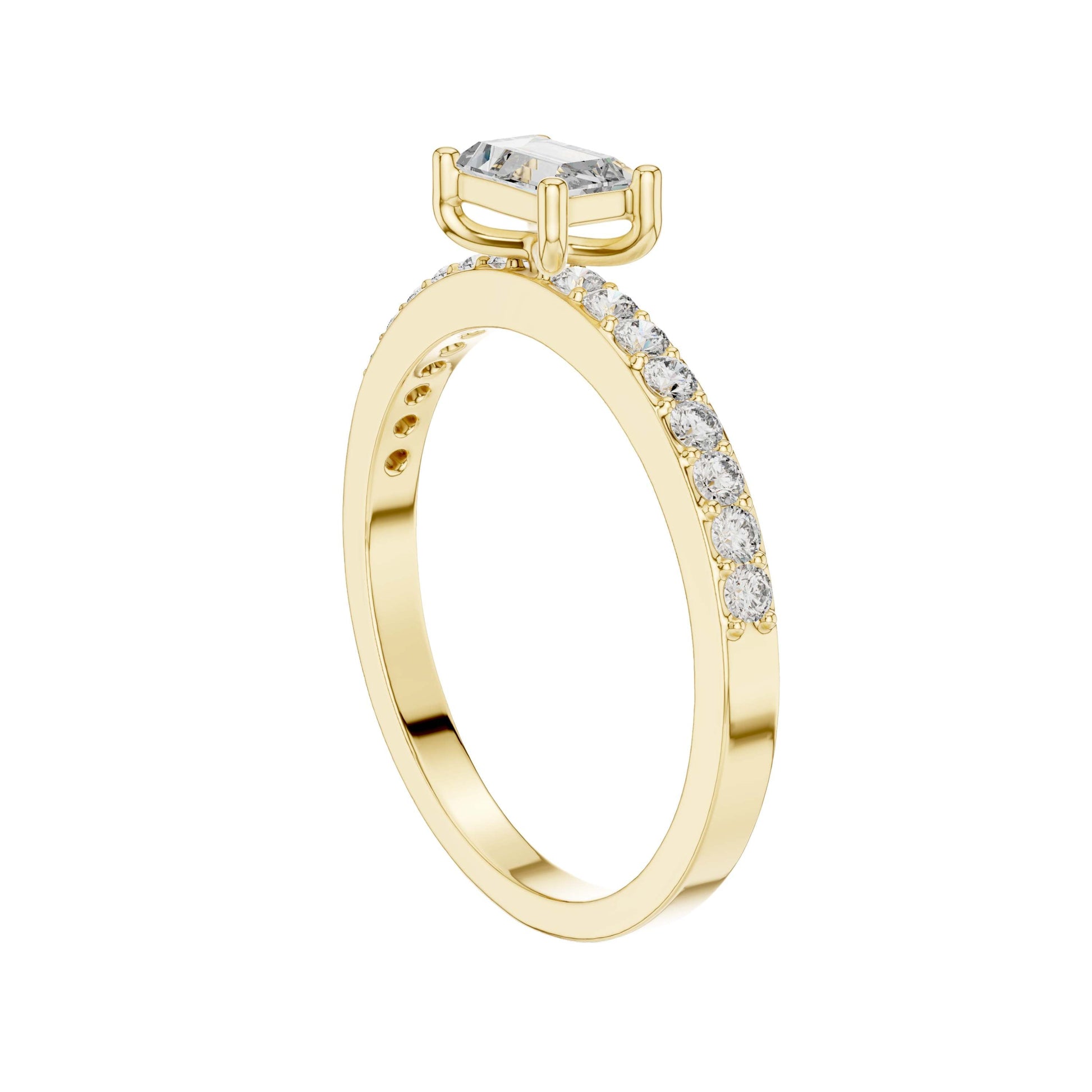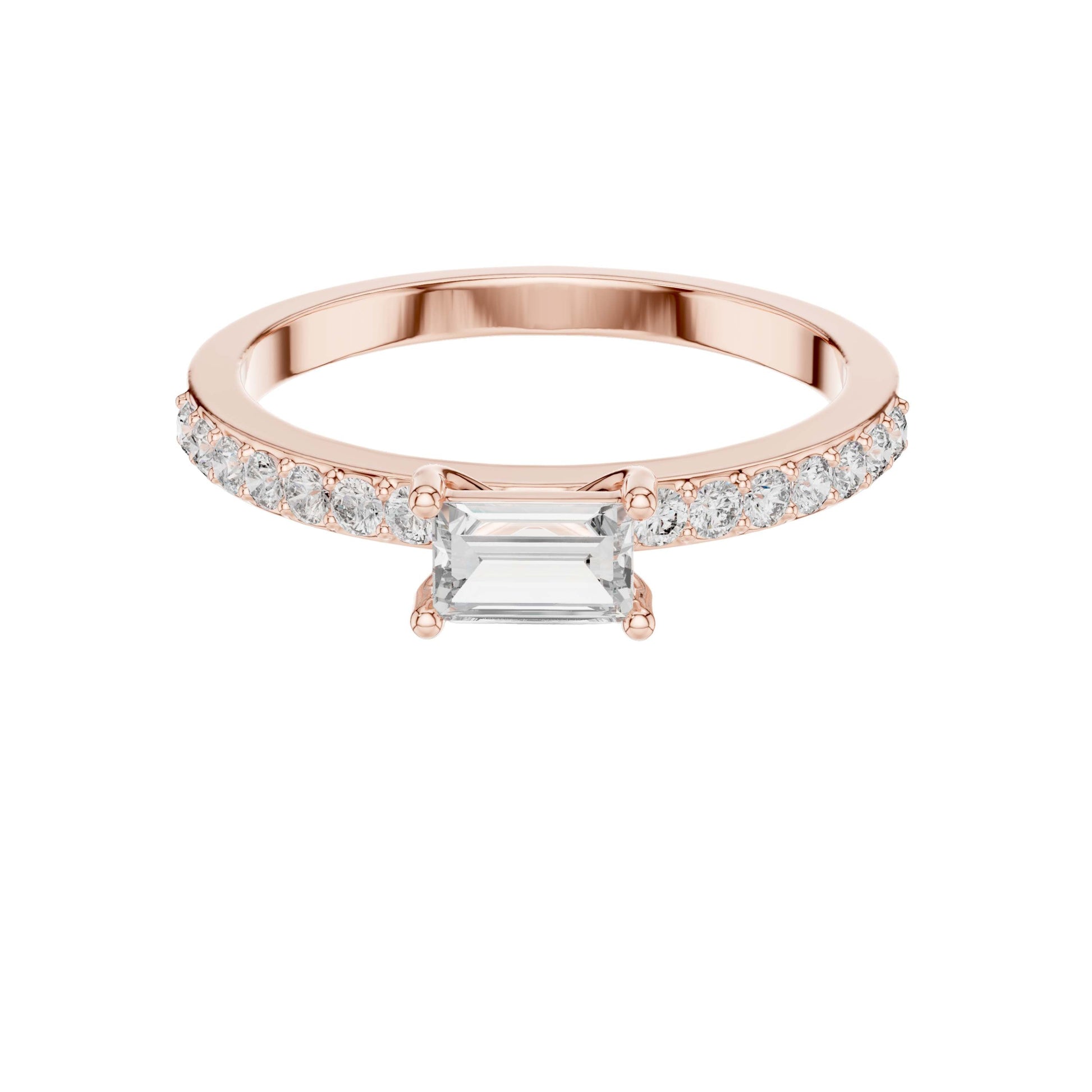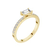 This sophisticated ring features a striking baguette cut center diamond, prized for its clean lines and elegant step-cut brilliance. Set in polished gold, the diamond is secured by refined prongs that highlight its geometric beauty, while a pave-set diamond band adds subtle sparkle and luxurious detail. Modern yet timeless, this design is perfect for those who appreciate understated elegance and contemporary refinement in a classic engagement ring.