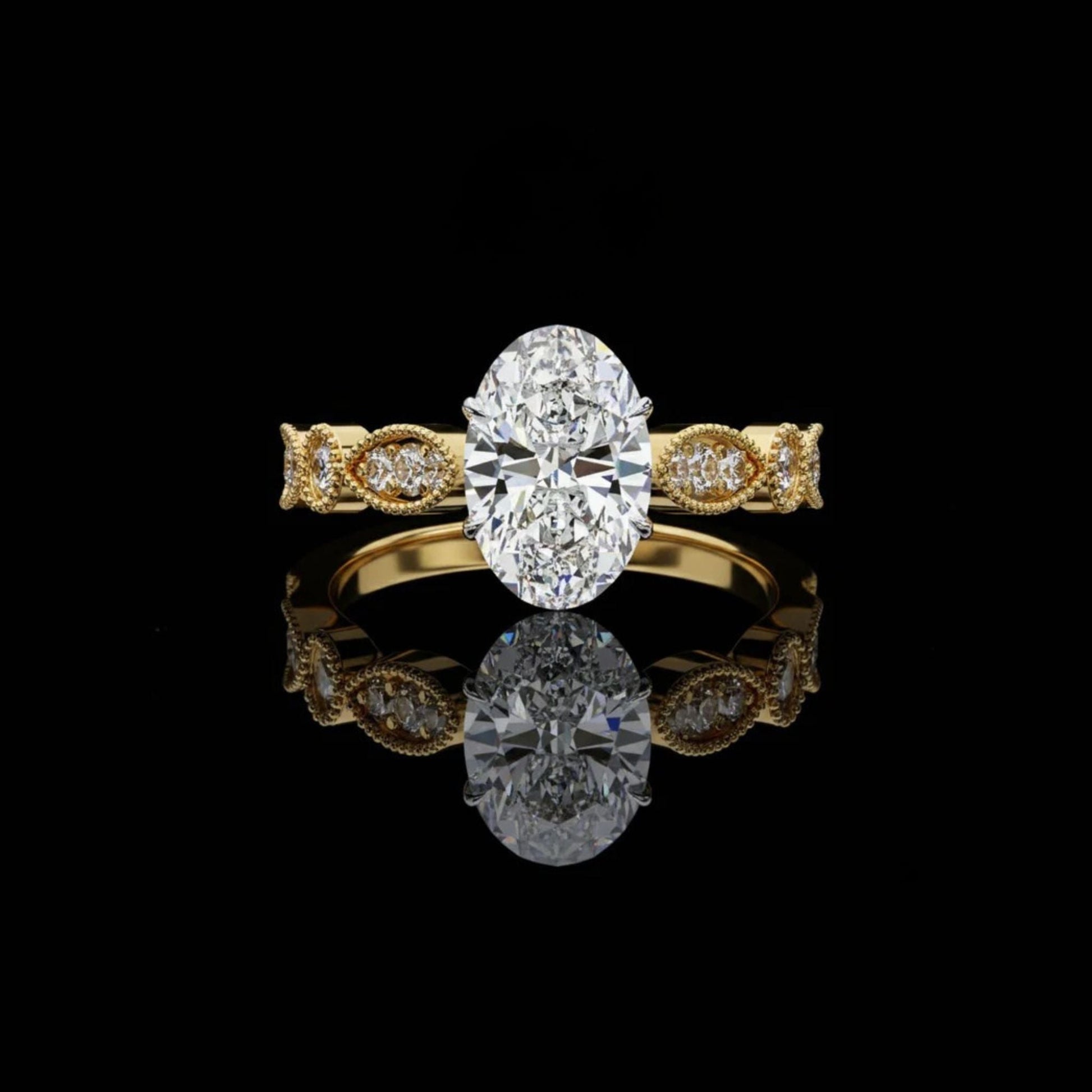 This exquisite piece from Ivevar Luxury features a brilliant oval-cut center stone set upon a vintage-inspired gold band adorned with marquise-shaped accents and delicate milgrain detailing. Each curve and shimmer reflects refined craftsmanship, creating a timeless balance of elegance and artistry. Designed for those who adore heirloom-style beauty, this ring offers a bold yet graceful sparkle perfect for engagements, anniversaries, or luxury gifting