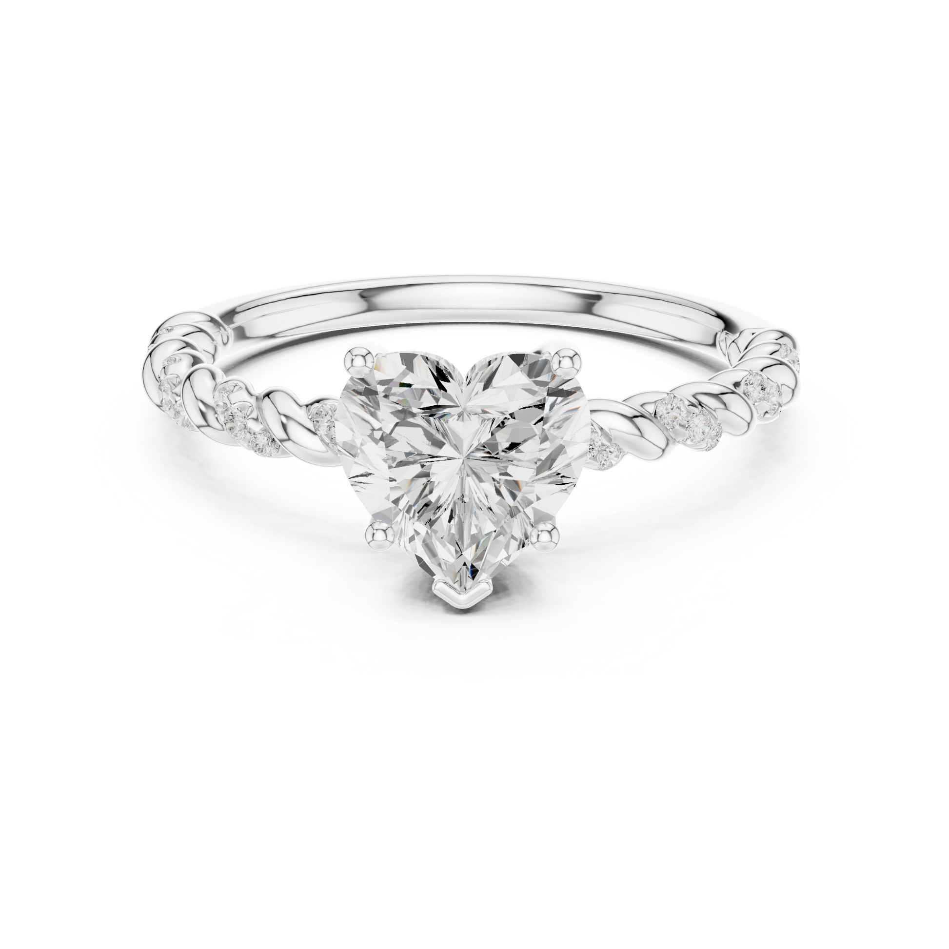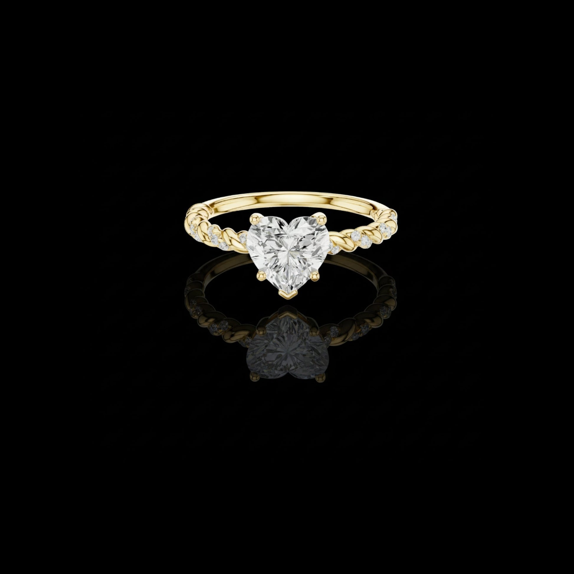 Celebrate love with this enchanting heart-shaped diamond ring, crafted in warm gold. The brilliant heart-cut center stone is securely held by elegant prongs, while the band features a graceful twisted vine design accented with shimmering pave diamonds. Delicate yet eye-catching, this ring blends romance with modern craftsmanship, making it a perfect choice for proposals, anniversaries, or a meaningful gift that speaks straight from the heart.