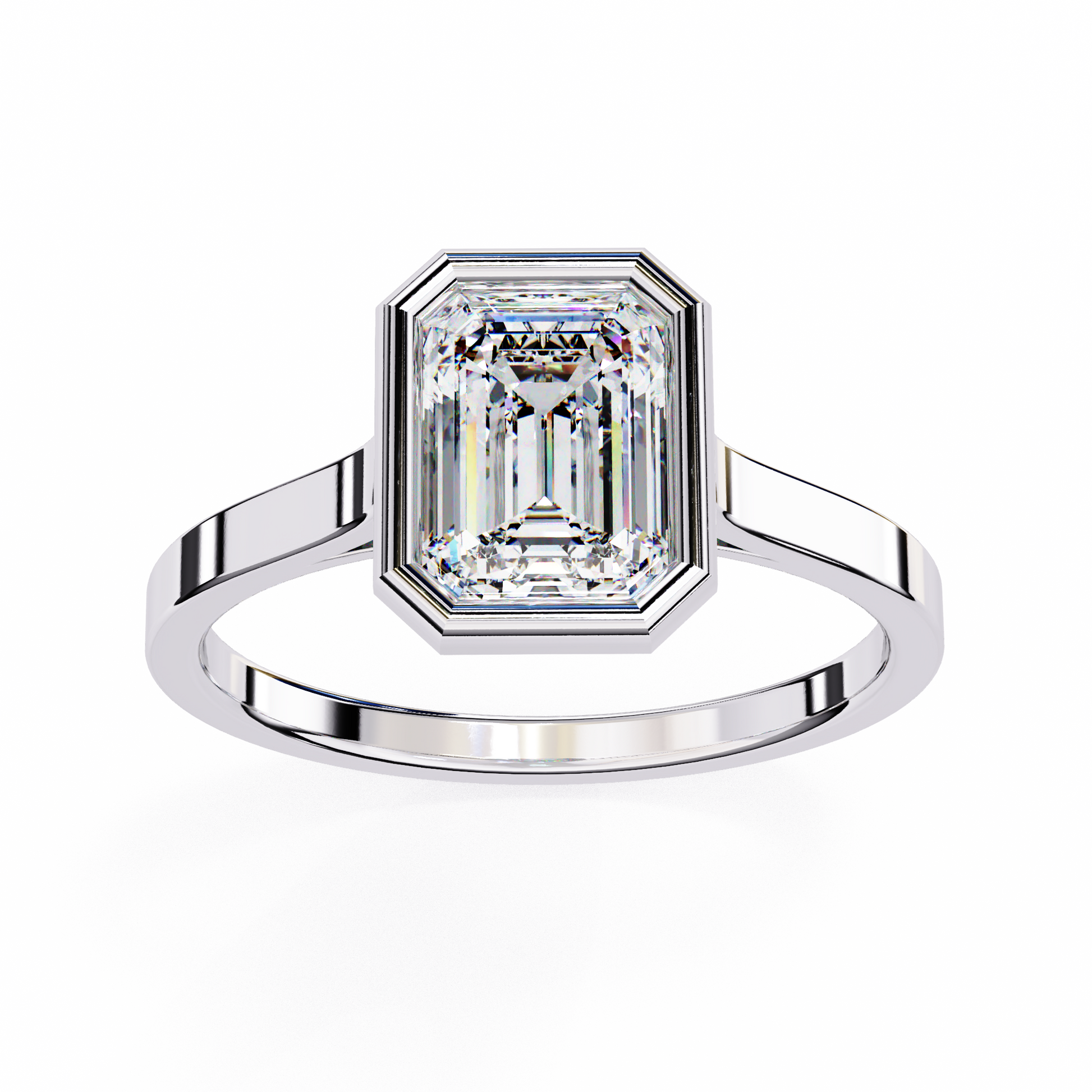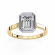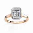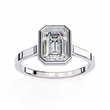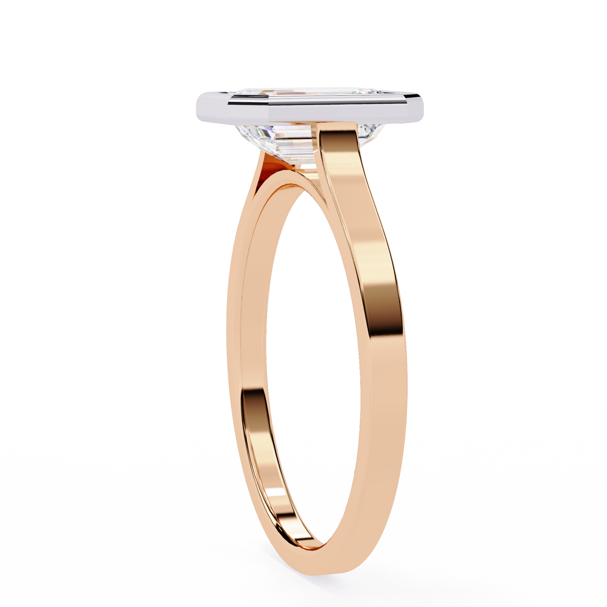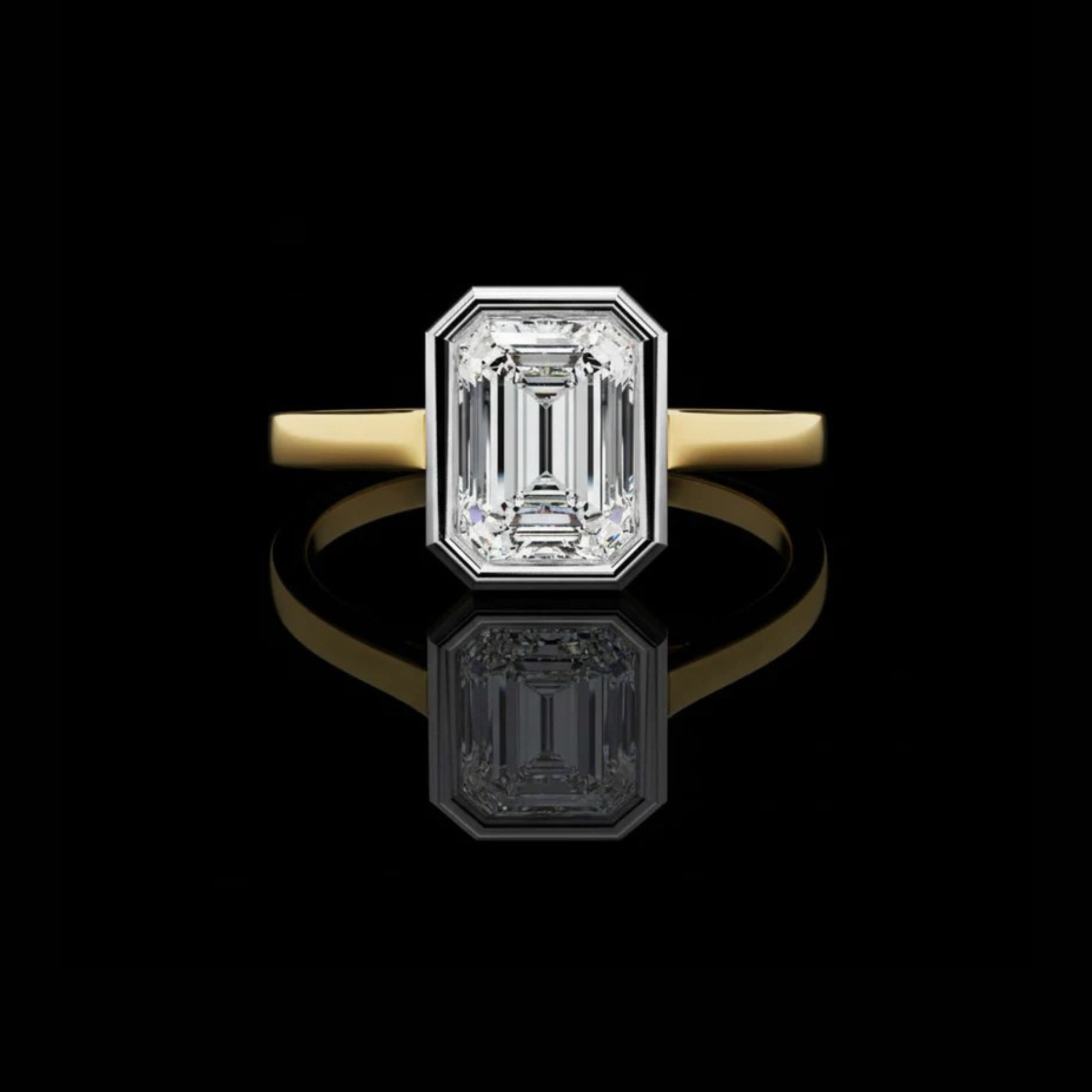 This sophisticated ring features a striking emerald-cut diamond showcased within a bold geometric bezel setting that highlights the stone’s crisp facets and exceptional clarity. The contrast of the bezel against the warm band creates a stunning, modern aesthetic. Designed for those who appreciate minimalist elegance, precision craftsmanship, and luxury jewelry that makes a refined statement.