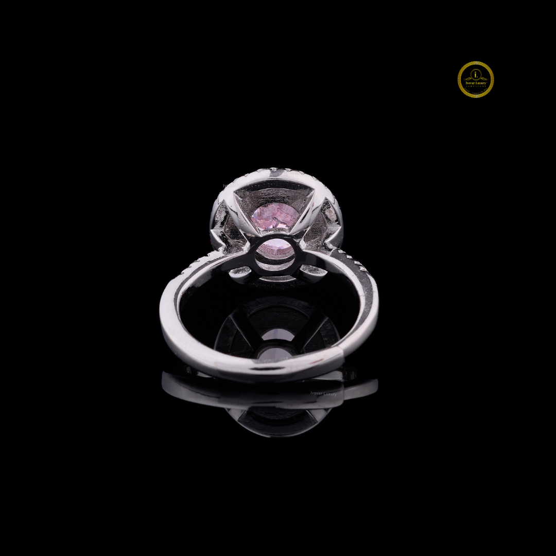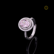 This exquisite pink diamond ring features a stunning oval-cut center stone surrounded by a double halo of brilliant white diamonds. Set in a luxurious white gold band, the ring showcases intricate pavé detailing that enhances its brilliance and sophistication. Perfect for those who appreciate refined elegance, this piece radiates romance, luxury, and timeless beauty.
