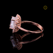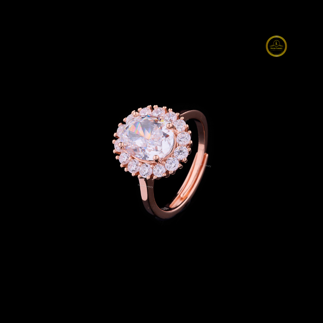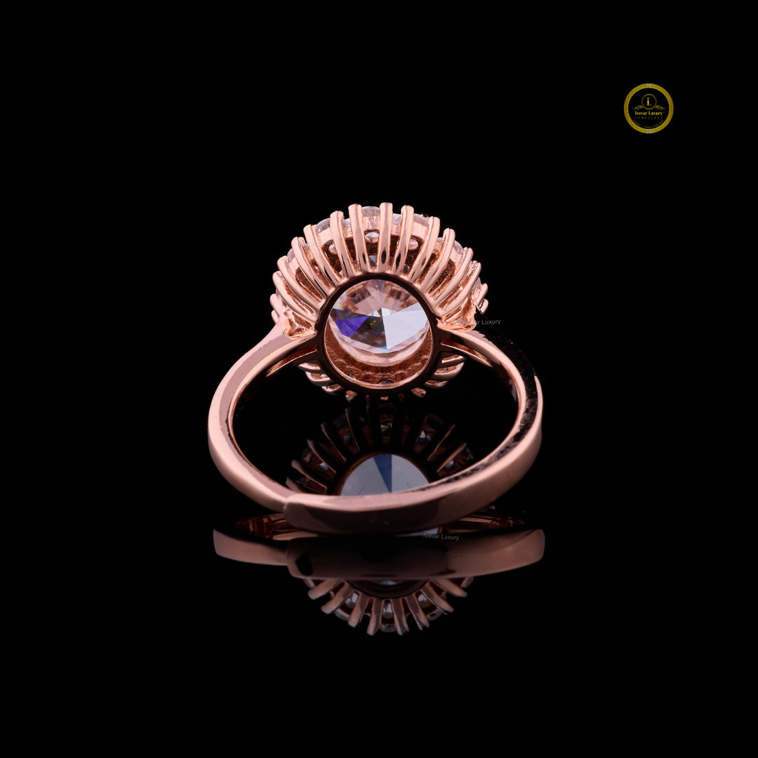 This breathtaking oval-cut diamond ring is surrounded by a brilliant halo of round white diamonds, amplifying its sparkle and fire. The rose gold band adds a touch of warmth and romantic charm, perfectly complementing the dazzling centerpiece. Surrounding it is a halo of perfectly matched round diamonds arranged in a floral-inspired pattern, amplifying the ring’s sparkle from every angle. Crafted with precision and elegance, this ring embodies luxury, timeless beauty, and refined sophistication.