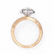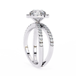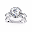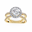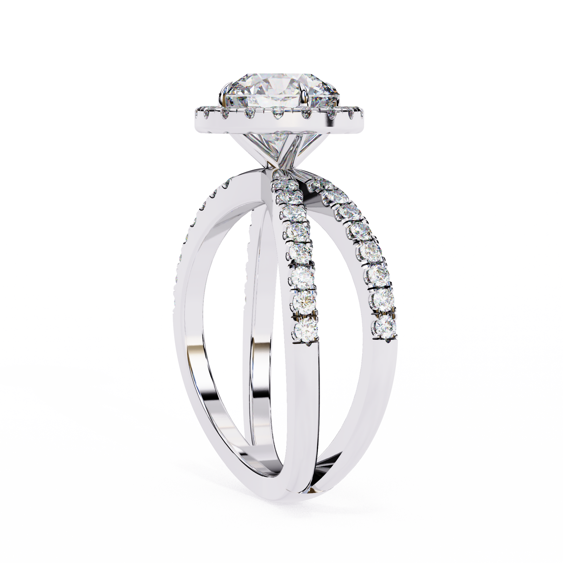 This stunning ring features a dazzling round-cut central diamond surrounded by a sparkling halo of smaller diamonds, enhancing its brilliance and fire. The band is uniquely designed with a graceful crisscross pattern, each strand adorned with a row of shimmering diamonds, adding depth and sophistication. Crafted in polished gold, this ring effortlessly combines classic elegance with modern flair, making it a perfect statement piece for those who appreciate luxury and timeless beauty by Ivevar.