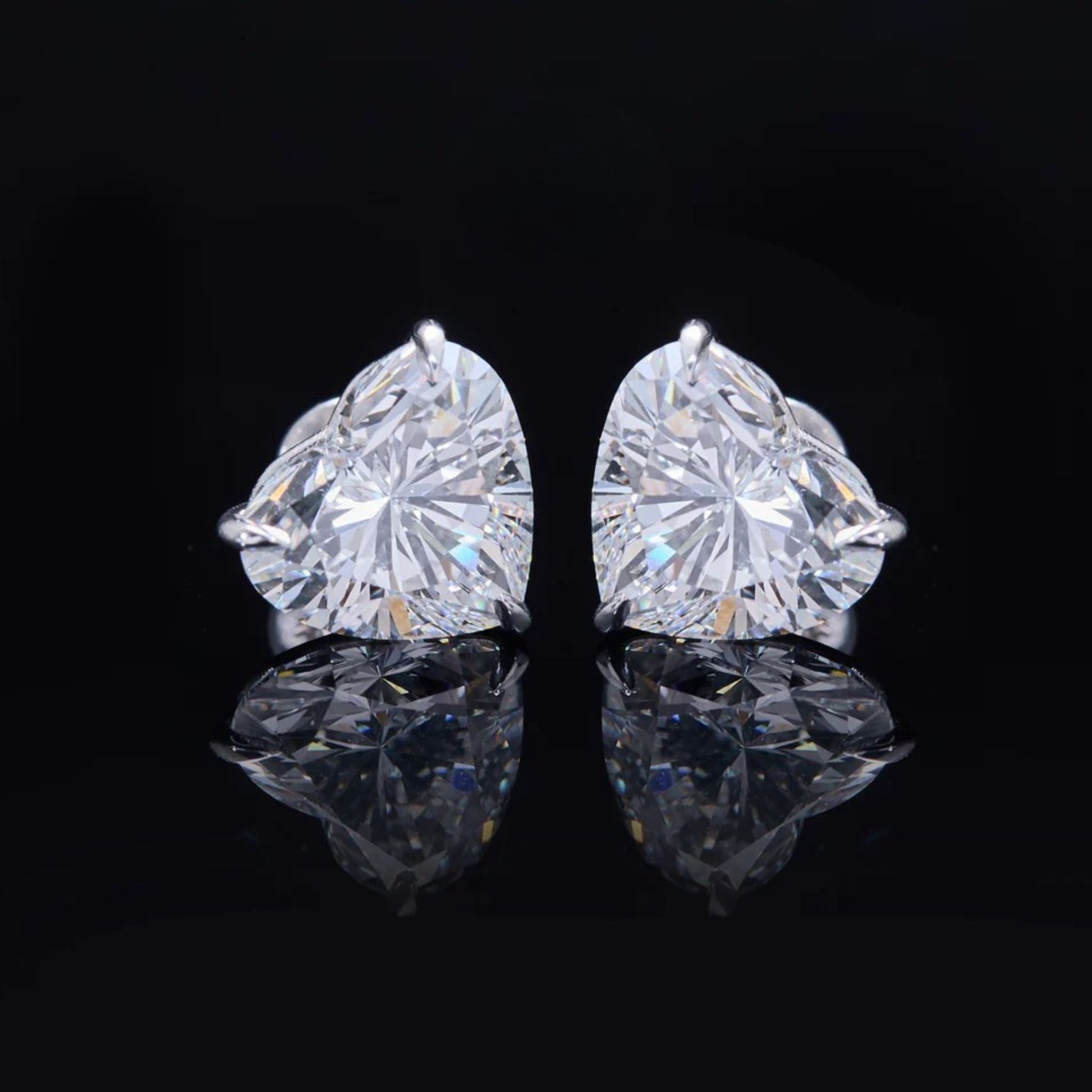 These elegant stud earrings feature stunning heart-shaped gemstones set in a sleek, polished metal prong setting that enhances their brilliance. Each stone is intricately faceted, creating a dazzling display of light and sparkle against the deep black background. The mirrored reflection beneath the studs adds a luxurious touch, emphasizing their clarity and precision-cut design. Perfect for both everyday sophistication and special occasions, these earrings embody timeless romance and refined style.