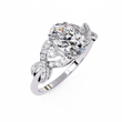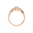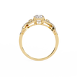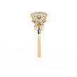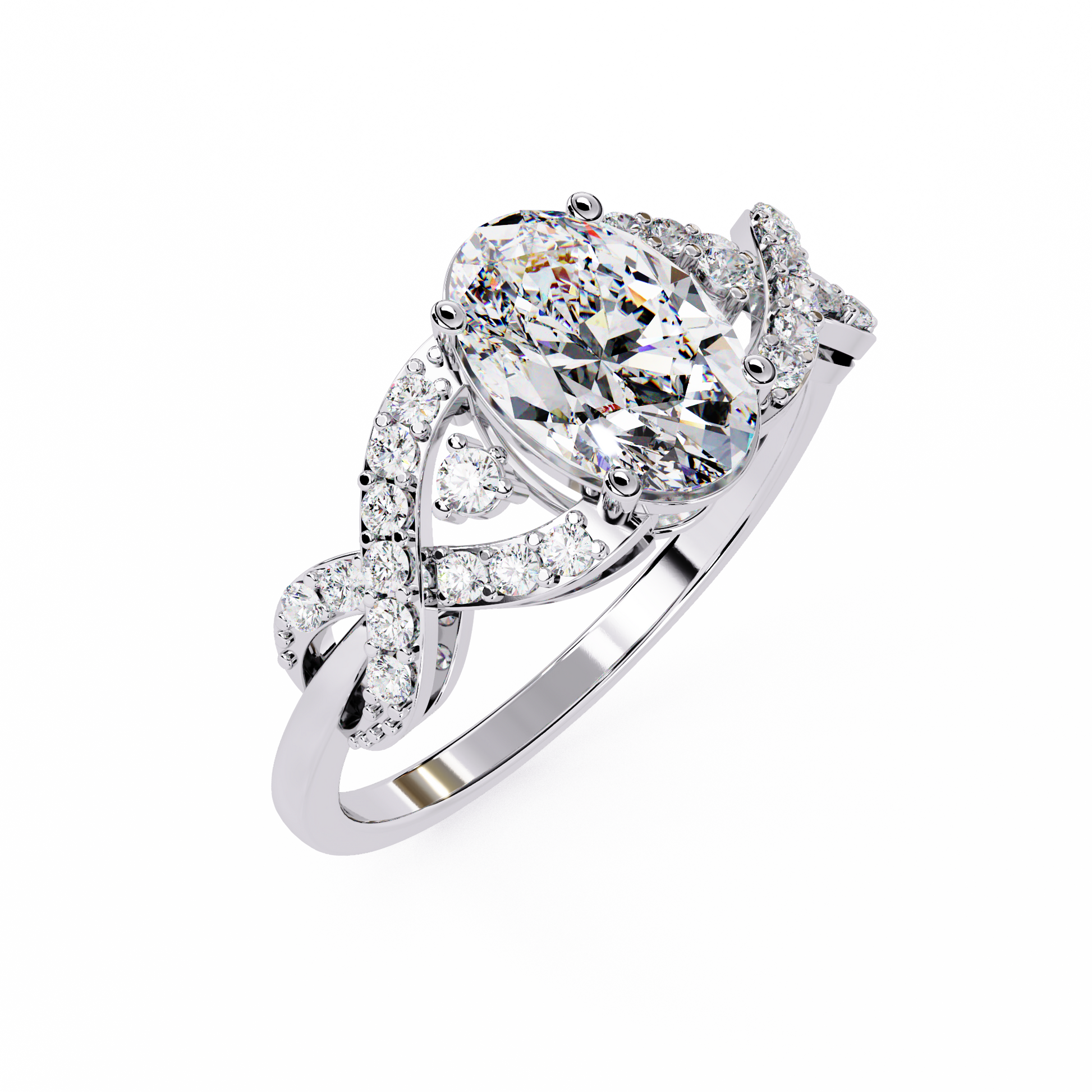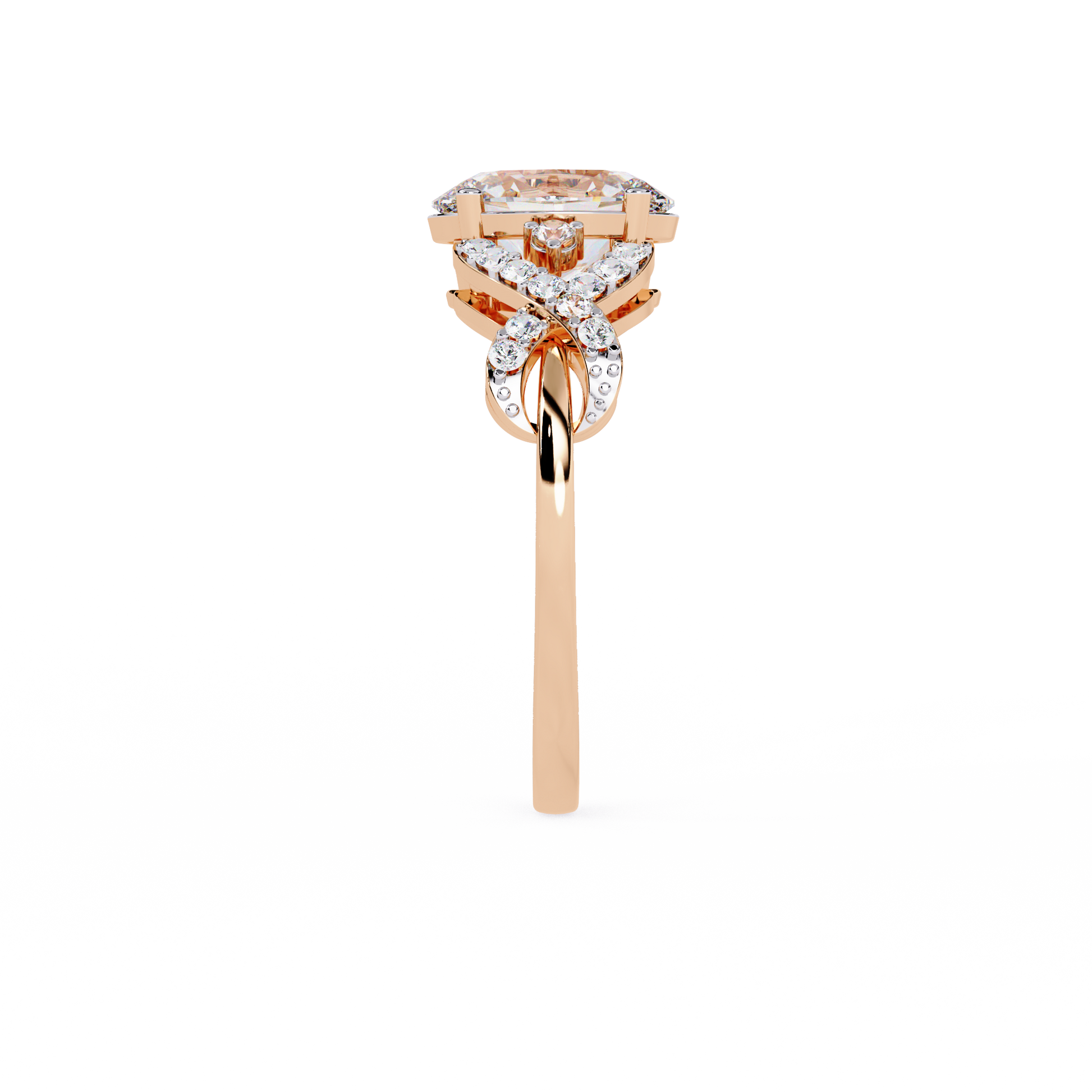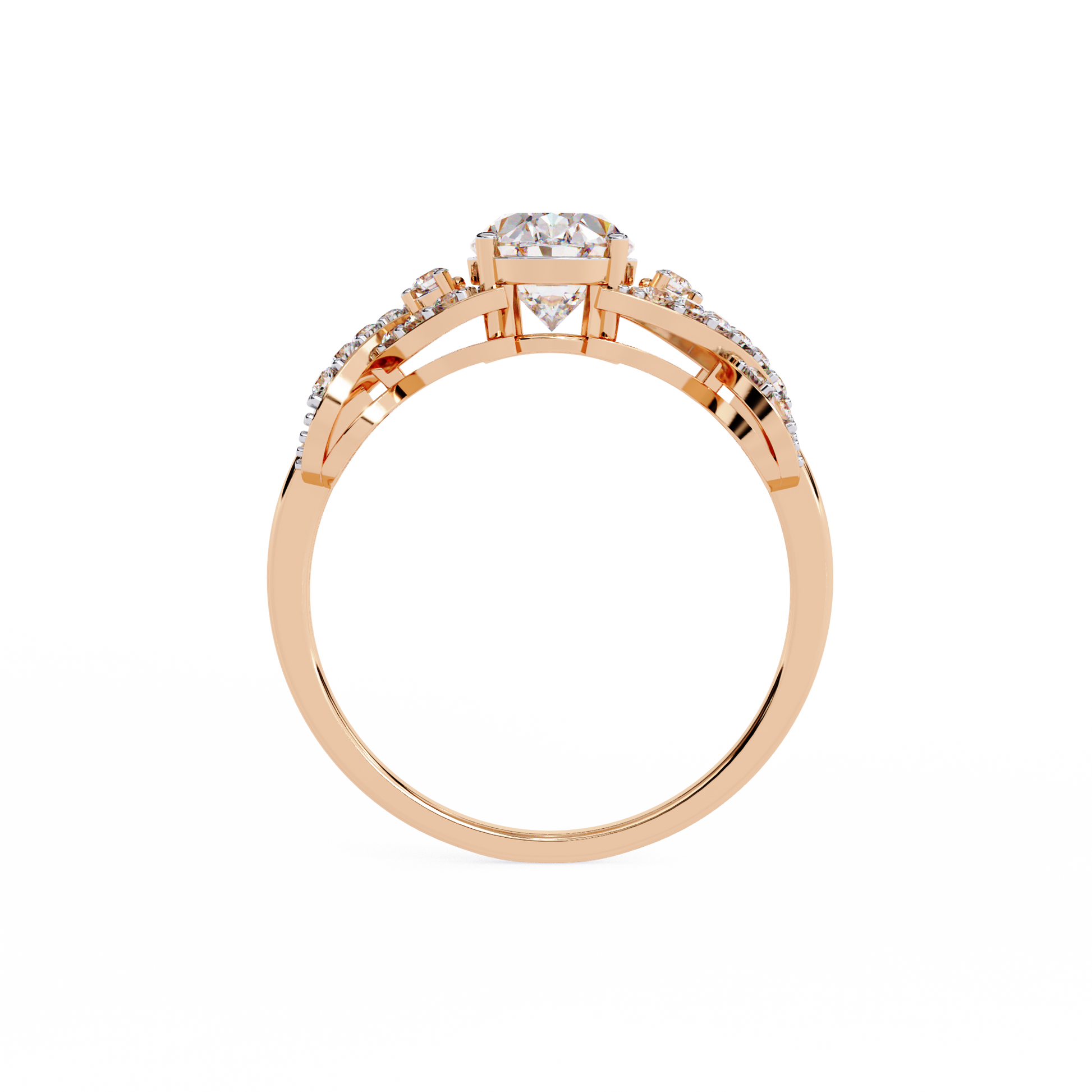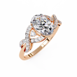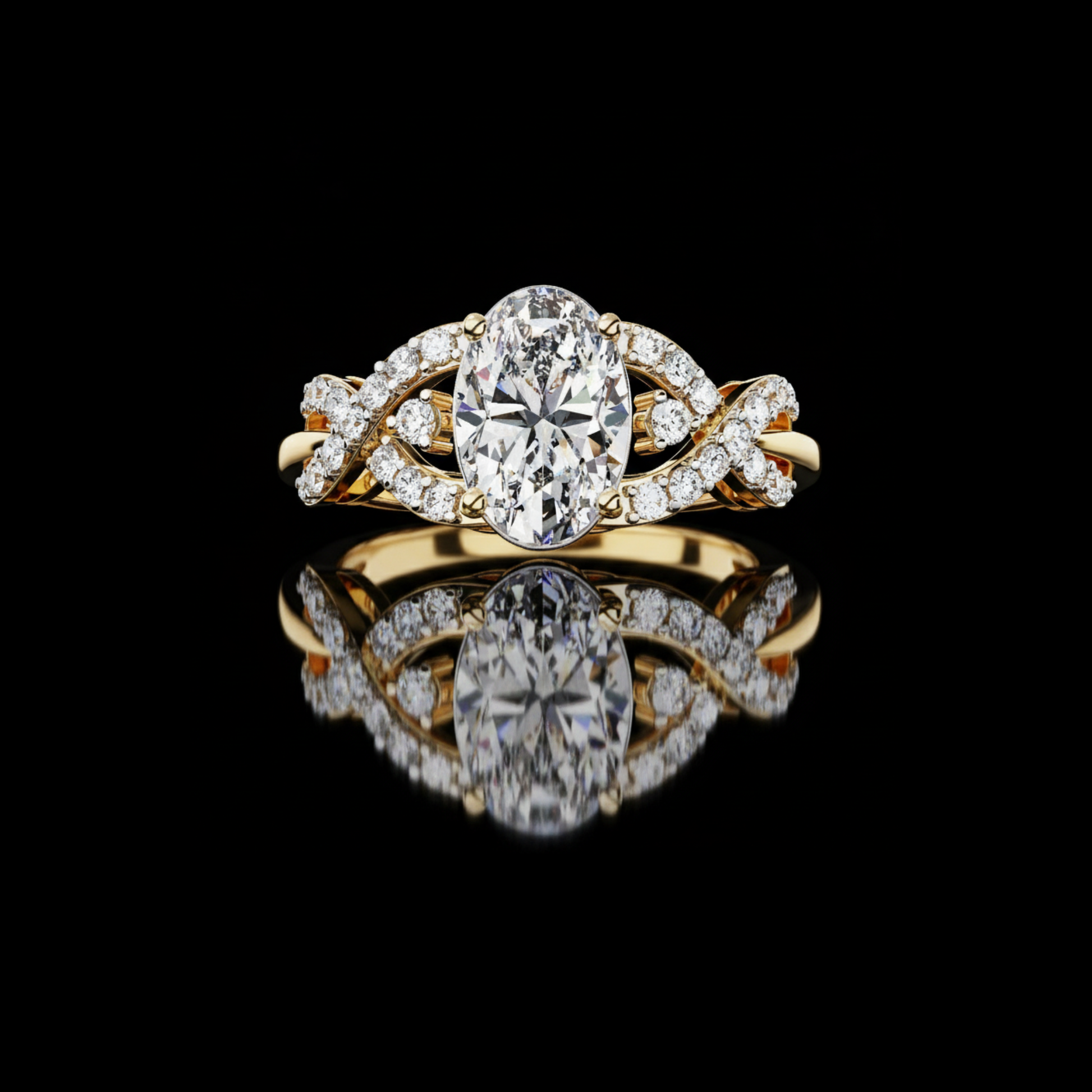 This elegant ring features a stunning oval-cut center diamond set in a warm gold band, beautifully accented by an intricate twisting design of pavé-set diamonds that add brilliance and dimension; its symmetrical, intertwining motif enhances the ring’s romantic and luxurious appeal, creating a timeless piece that sparkles from every angle by Ivevar Luxury.