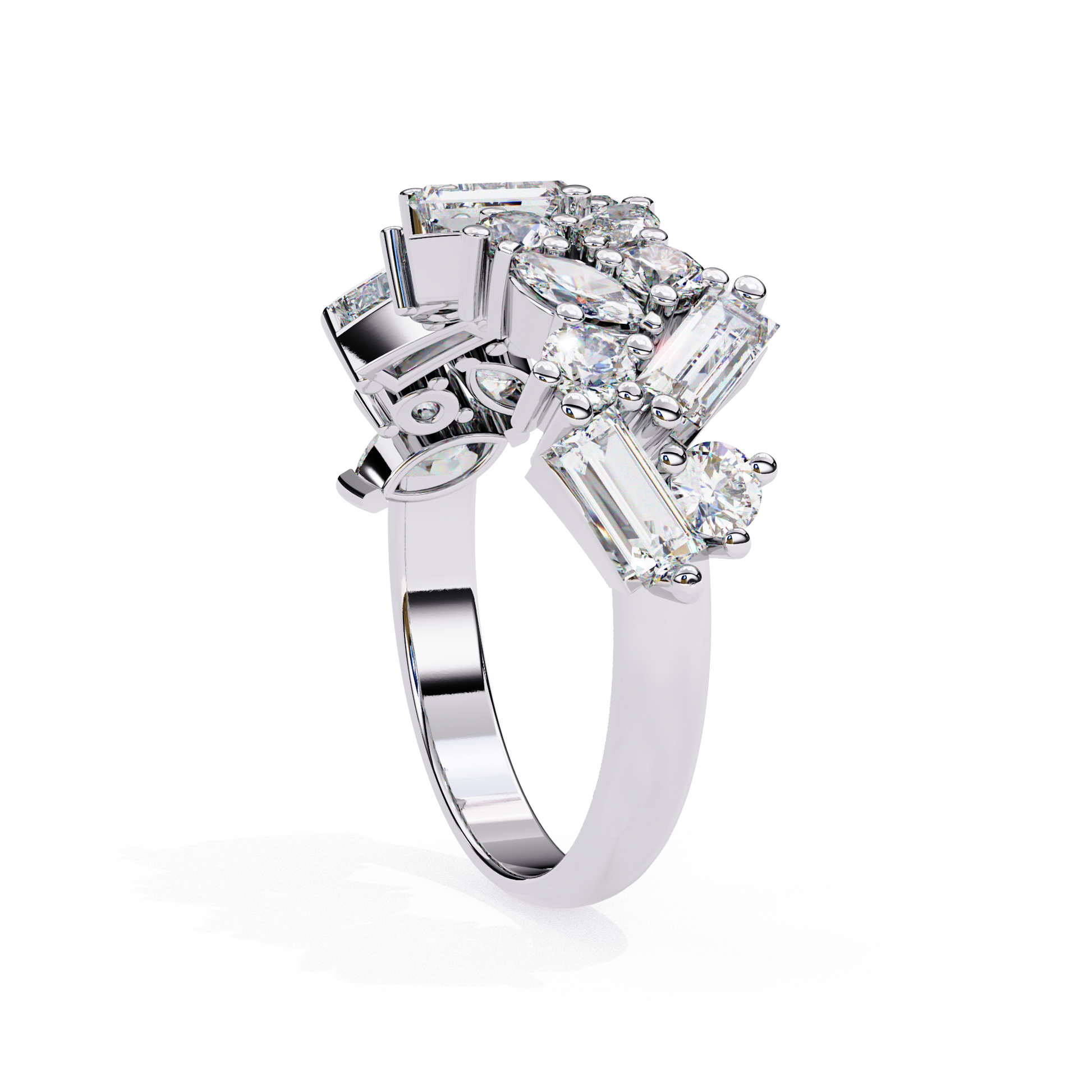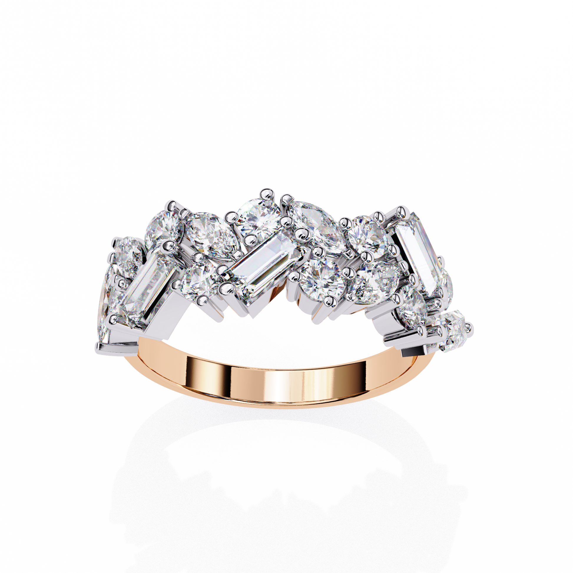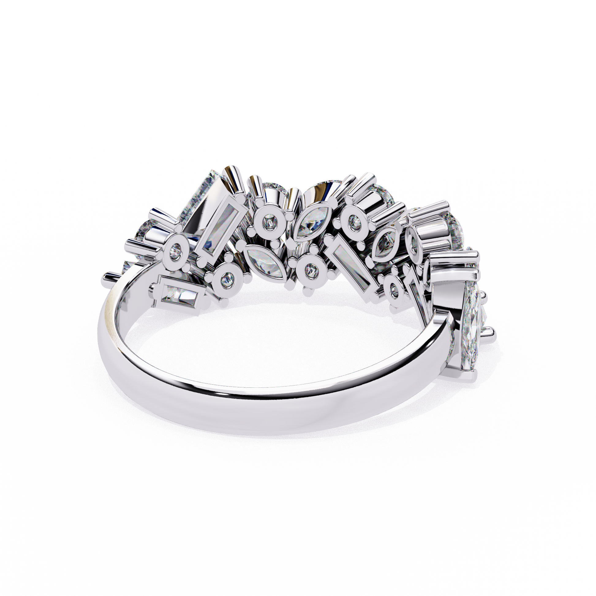 Experience unmatched brilliance with this exquisite mixed-cut diamond cluster band, featuring a striking blend of marquise, round, and baguette diamonds meticulously arranged to create a bold, multidimensional sparkle; a luxurious statement piece that unites modern artistry with timeless elegance, perfect for special occasions, anniversaries, or elevating everyday sophistication.