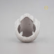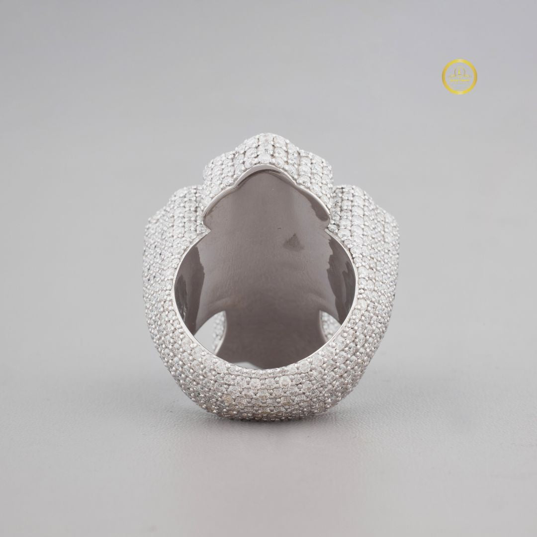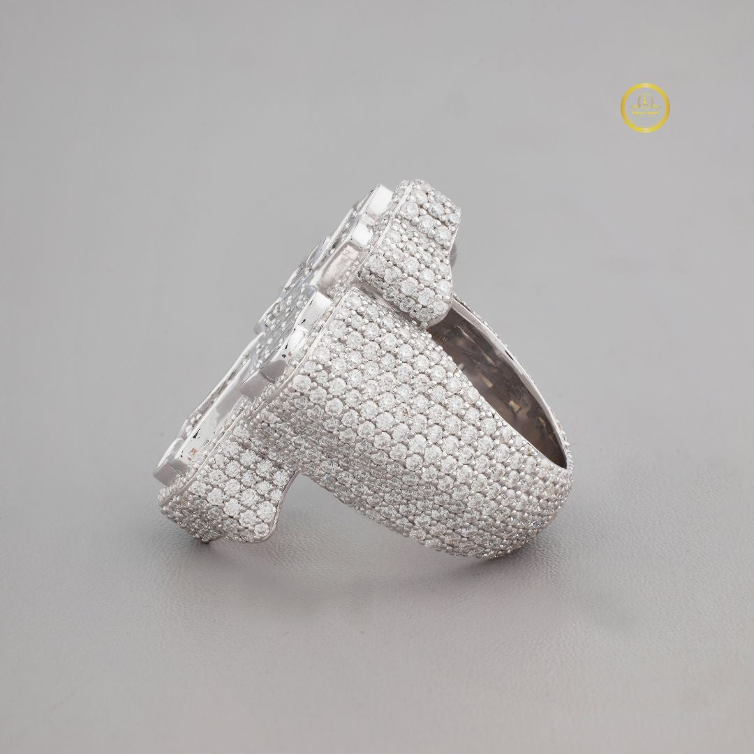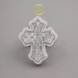 This exquisite ring features an ornate cross-shaped design crafted from meticulously arranged baguette-cut diamonds, each aligned to create a shimmering, textured pattern that captures light from every angle. The center arrangement is framed by a delicate halo of round brilliant diamonds, enhancing its luminous presence and adding depth to the intricate silhouette. Set in a polished white metal, the piece exudes elegance and symbolic significance, making it a standout statement of both craftsmanship and devotion.