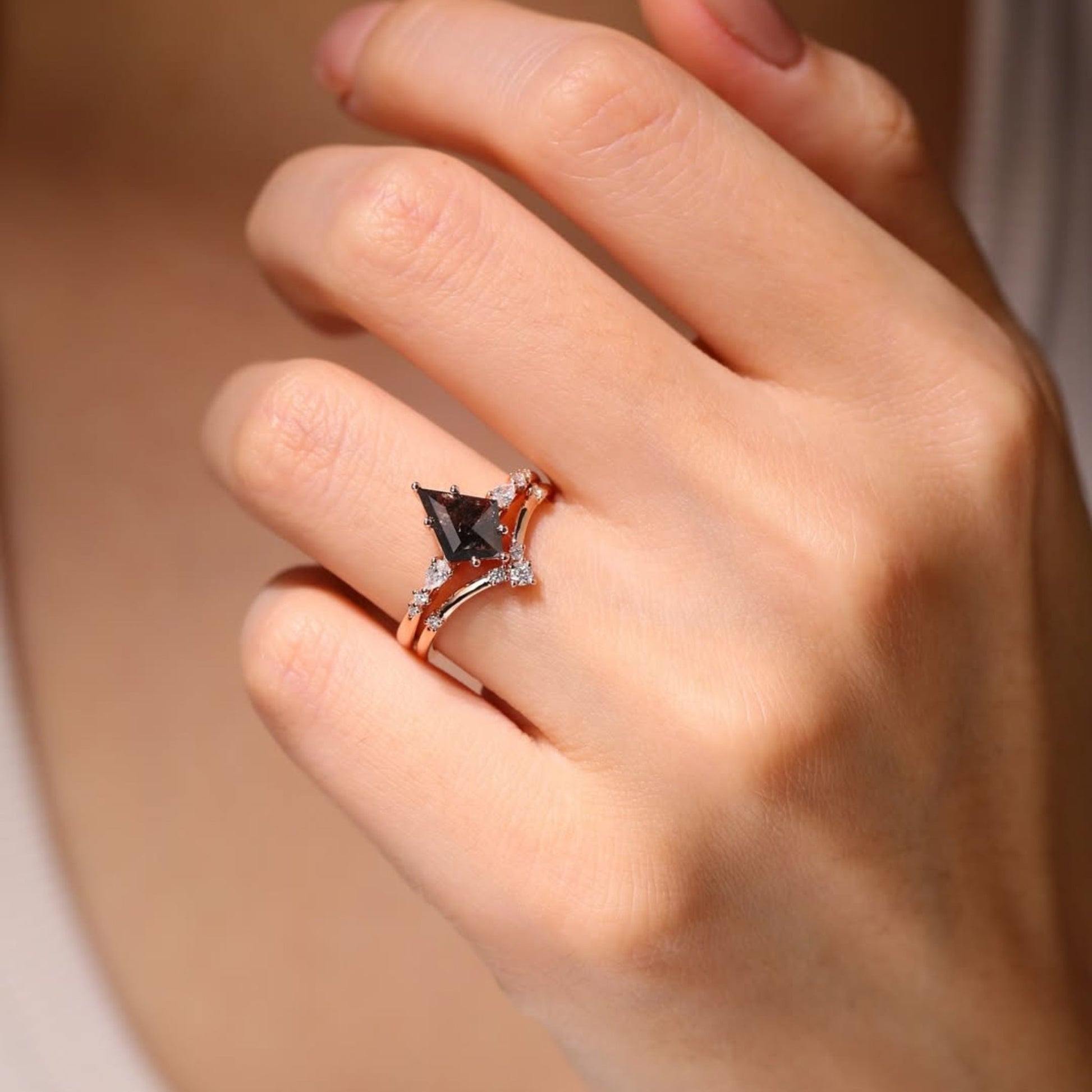 This stunning ring features a bold black Antique-cut diamond as the centerpiece, beautifully contrasted by sparkling white diamond accents. Set in warm gold, the design blends modern elegance with timeless romance. The elevated setting enhances brilliance, while the curved band adds a unique, graceful touch. Perfect for an engagement, promise ring, or a meaningful anniversary gift, this ring is designed for those who love distinctive and sophisticated jewelry.