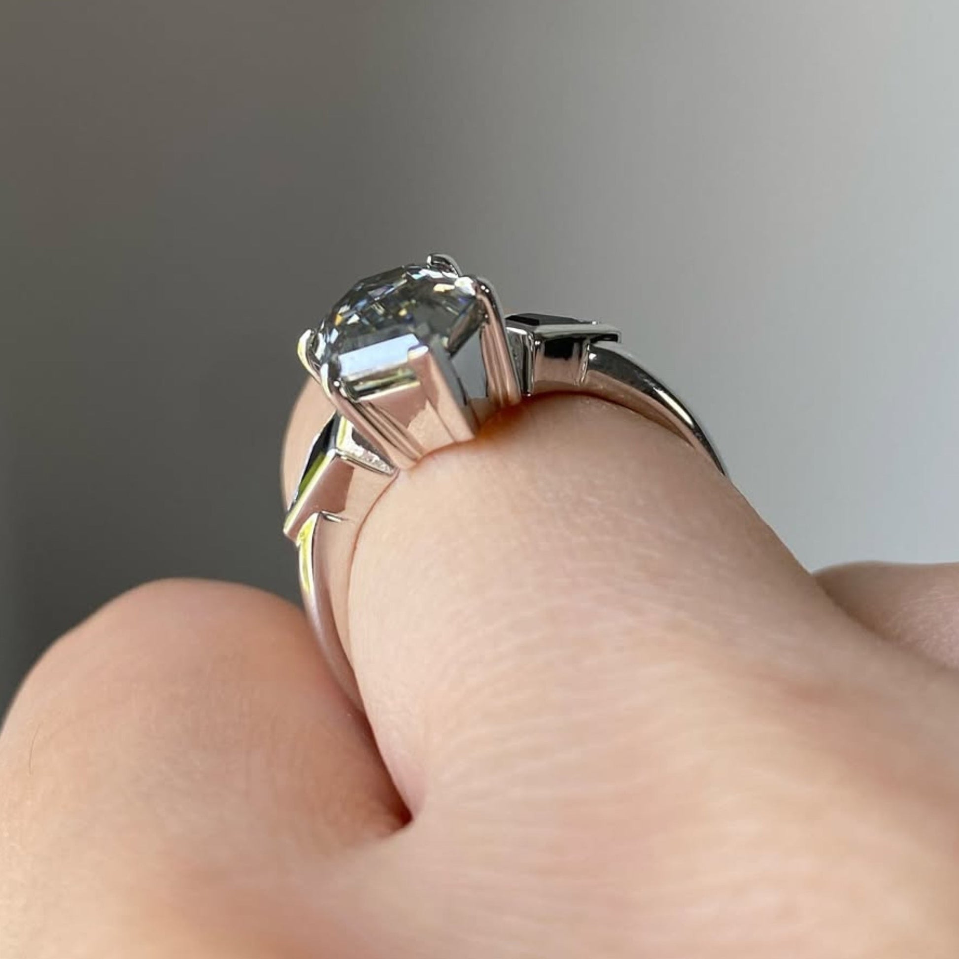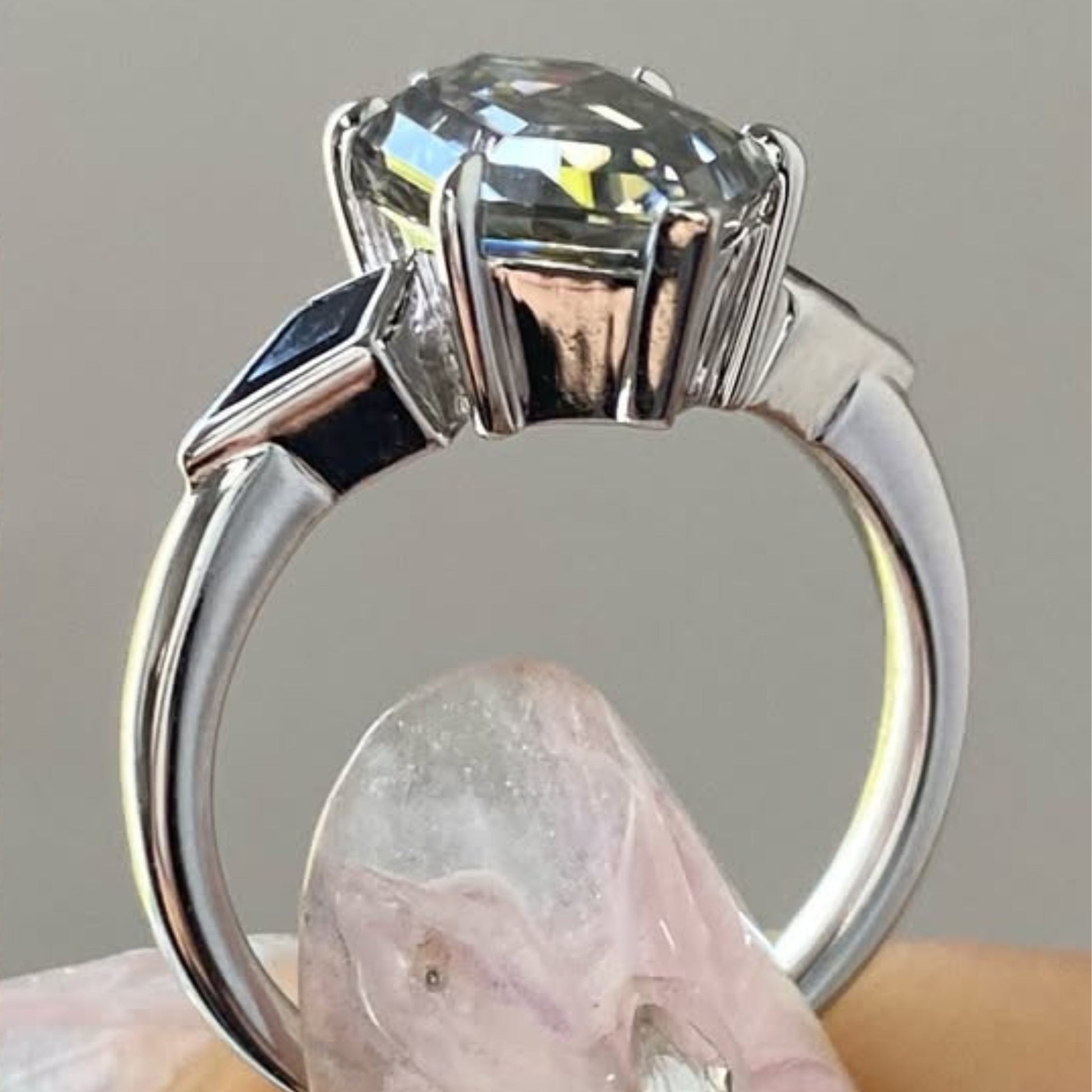 This bold antique cut diamond ring is a true symbol of modern luxury and fearless design. The clean, mirror-like facets of the emerald-cut diamond are enhanced by sleek black geometric side accents, creating a powerful and architectural look. Crafted for those who love unique statement jewelry, this ring delivers strong presence, sharp elegance, and unmatched diamond brilliance. Perfect for collectors of designer rings, high-fashion jewelry lovers, or anyone seeking a luxury piece that stands apart.