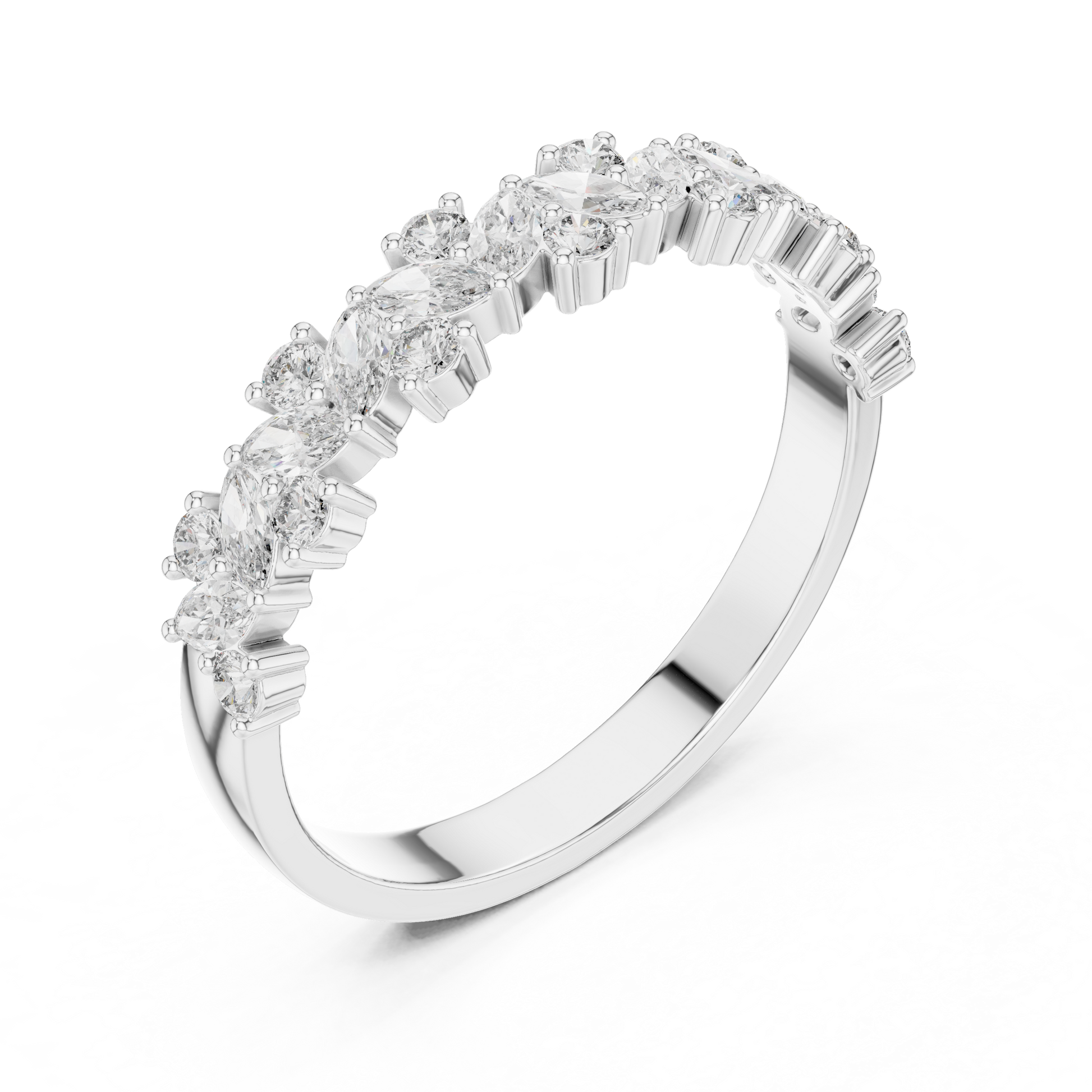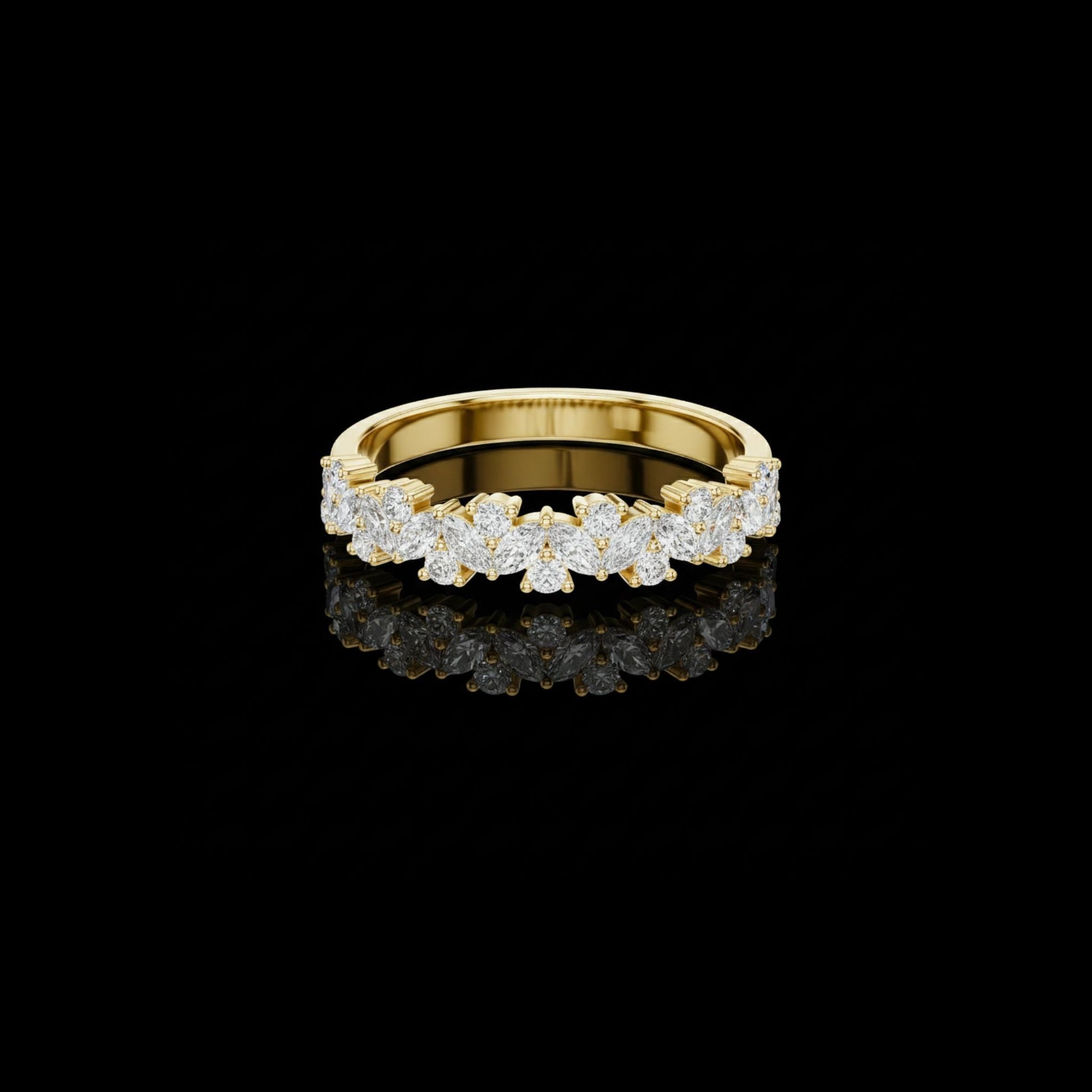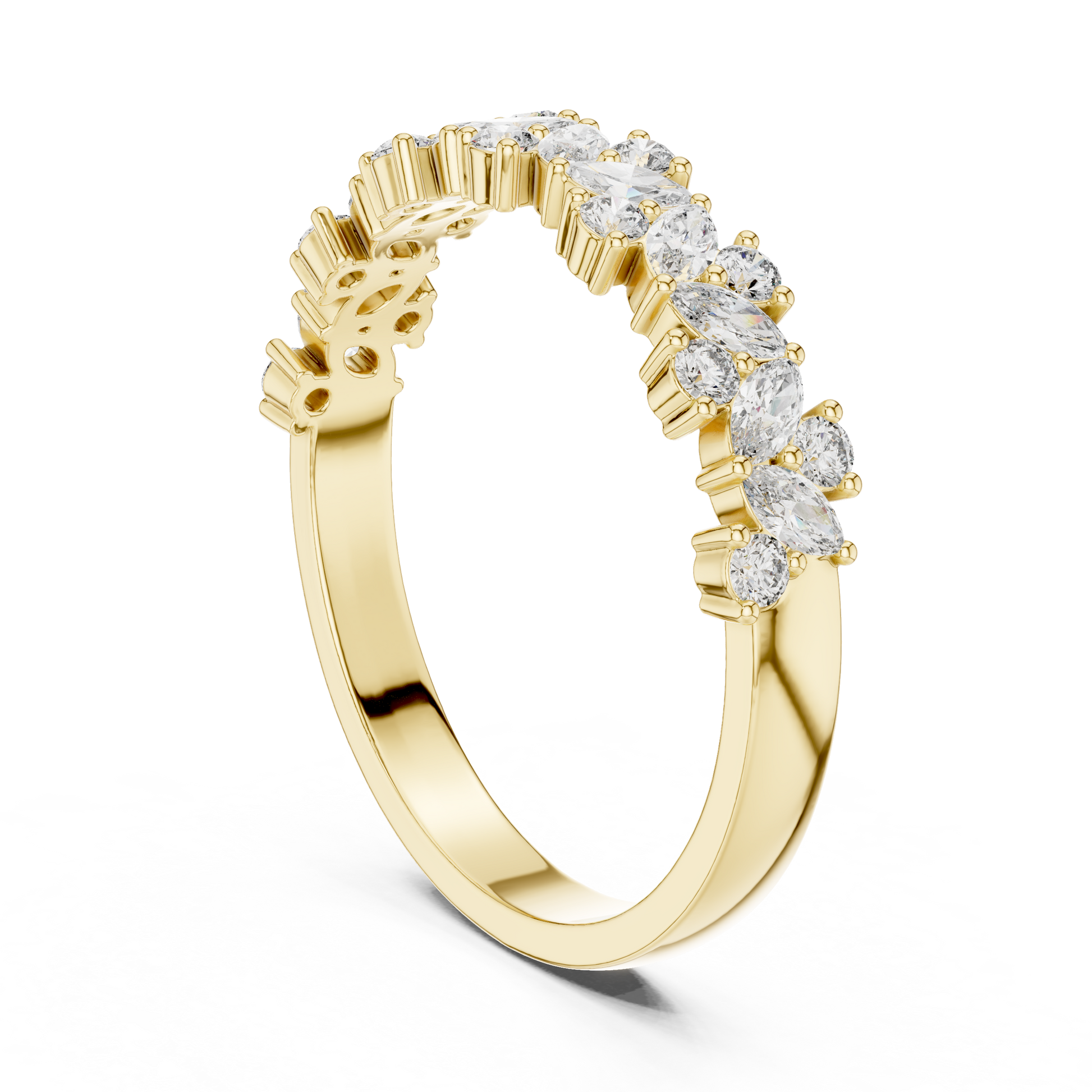 This refined gold band showcases a striking pattern of alternating marquise and round diamonds, creating graceful movement and exceptional sparkle. Crafted with precision prong settings, the half-eternity design balances luxury with everyday comfort. Ideal as a wedding band, anniversary ring, or stacking statement, this piece delivers timeless brilliance with a modern edge.