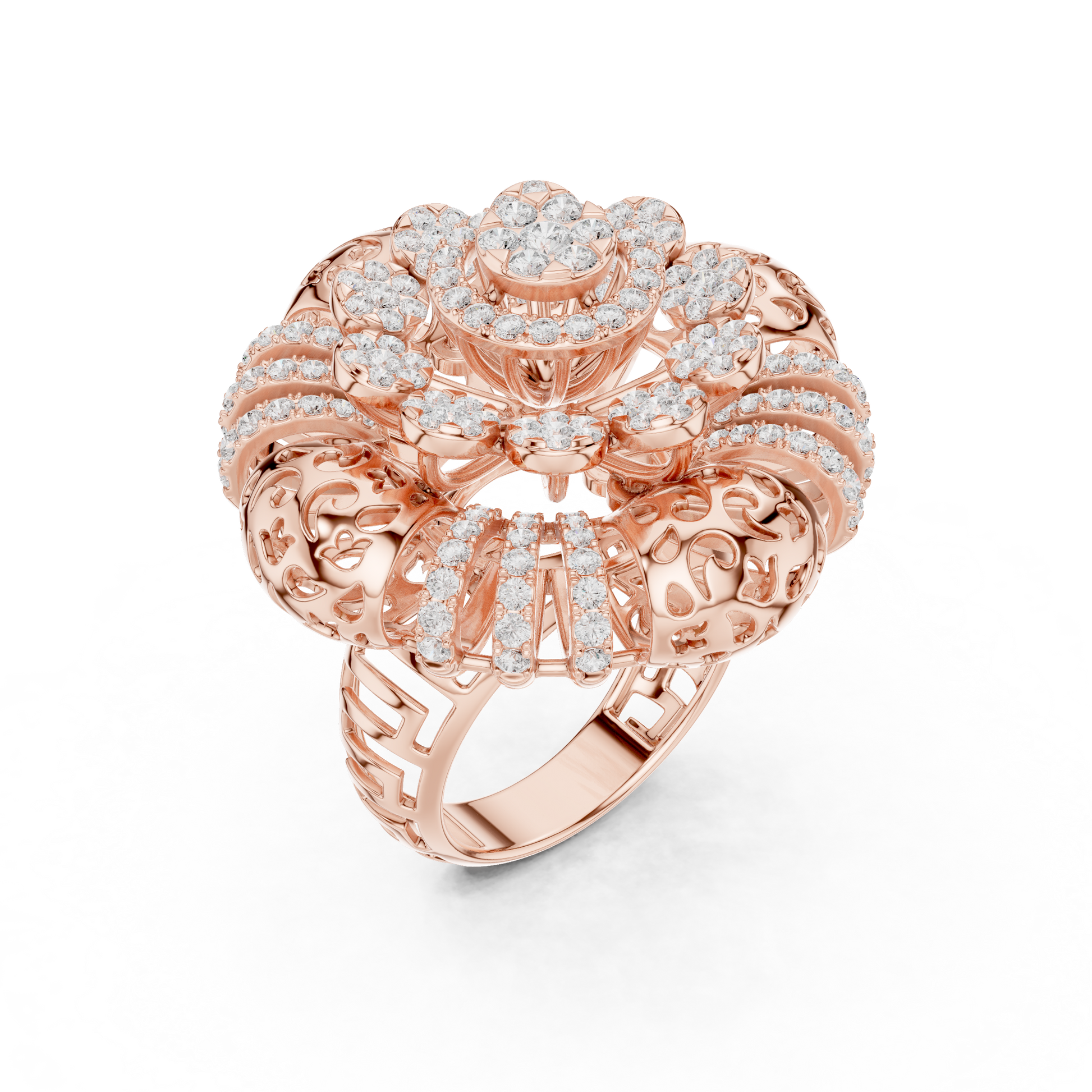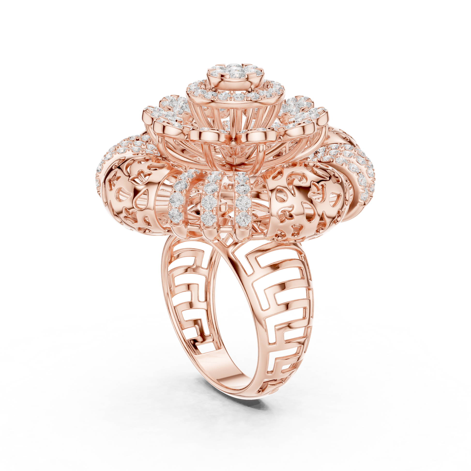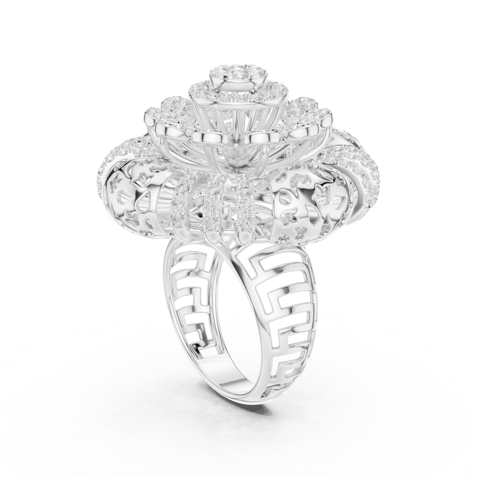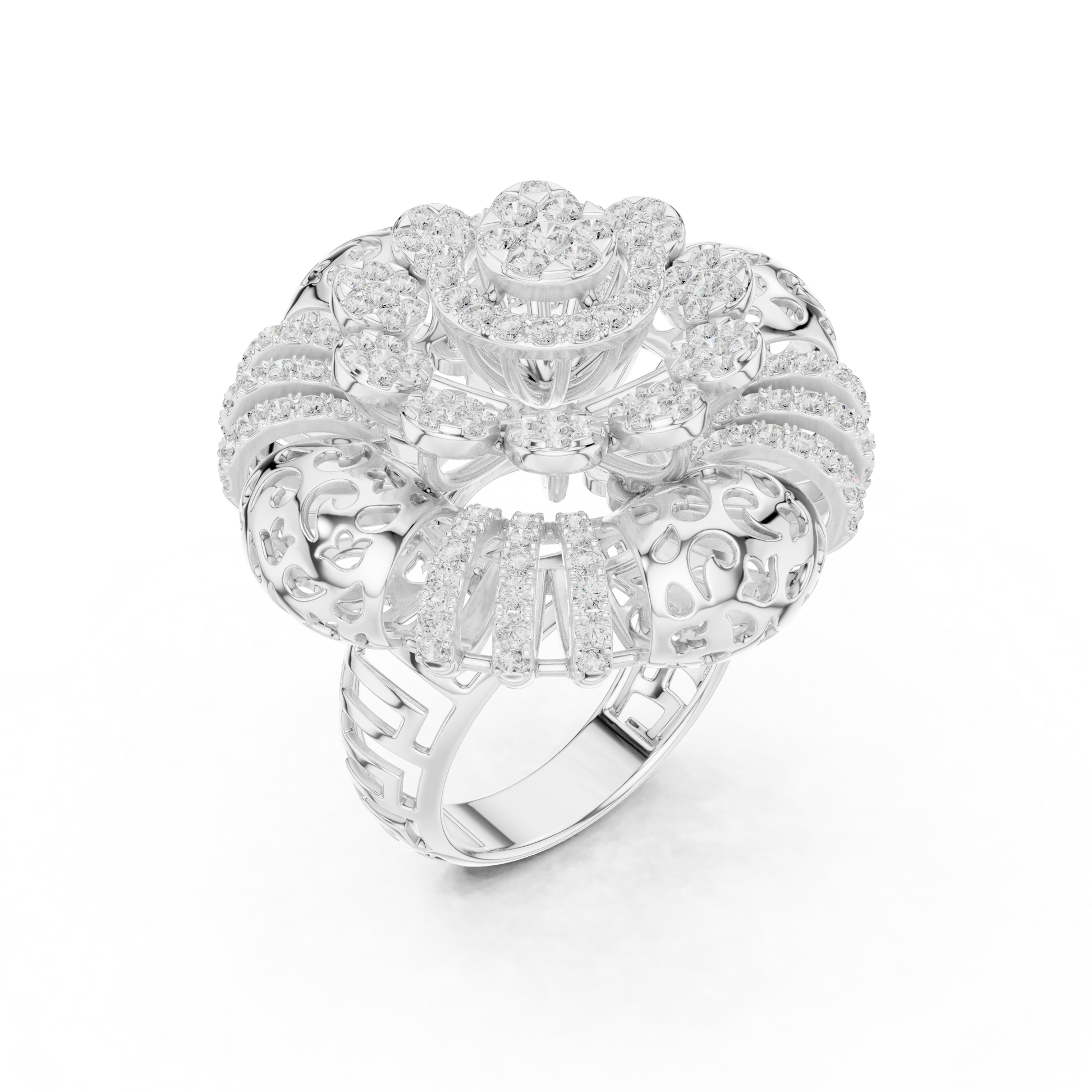 This magnificent ring showcases a breathtaking floral-inspired design, masterfully arranged with clusters of brilliant round cut diamonds that create a dazzling bloom at the center. The structure radiates outward with symmetrical diamond petals, giving the ring an extraordinary sense of depth, brilliance, and artistry.