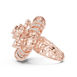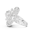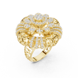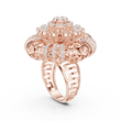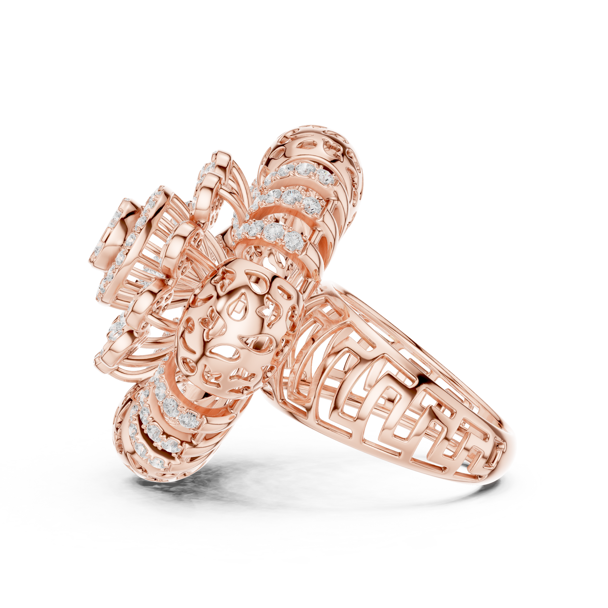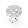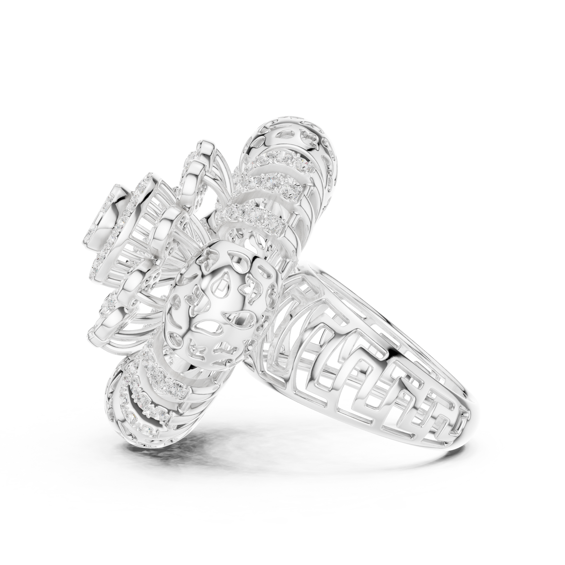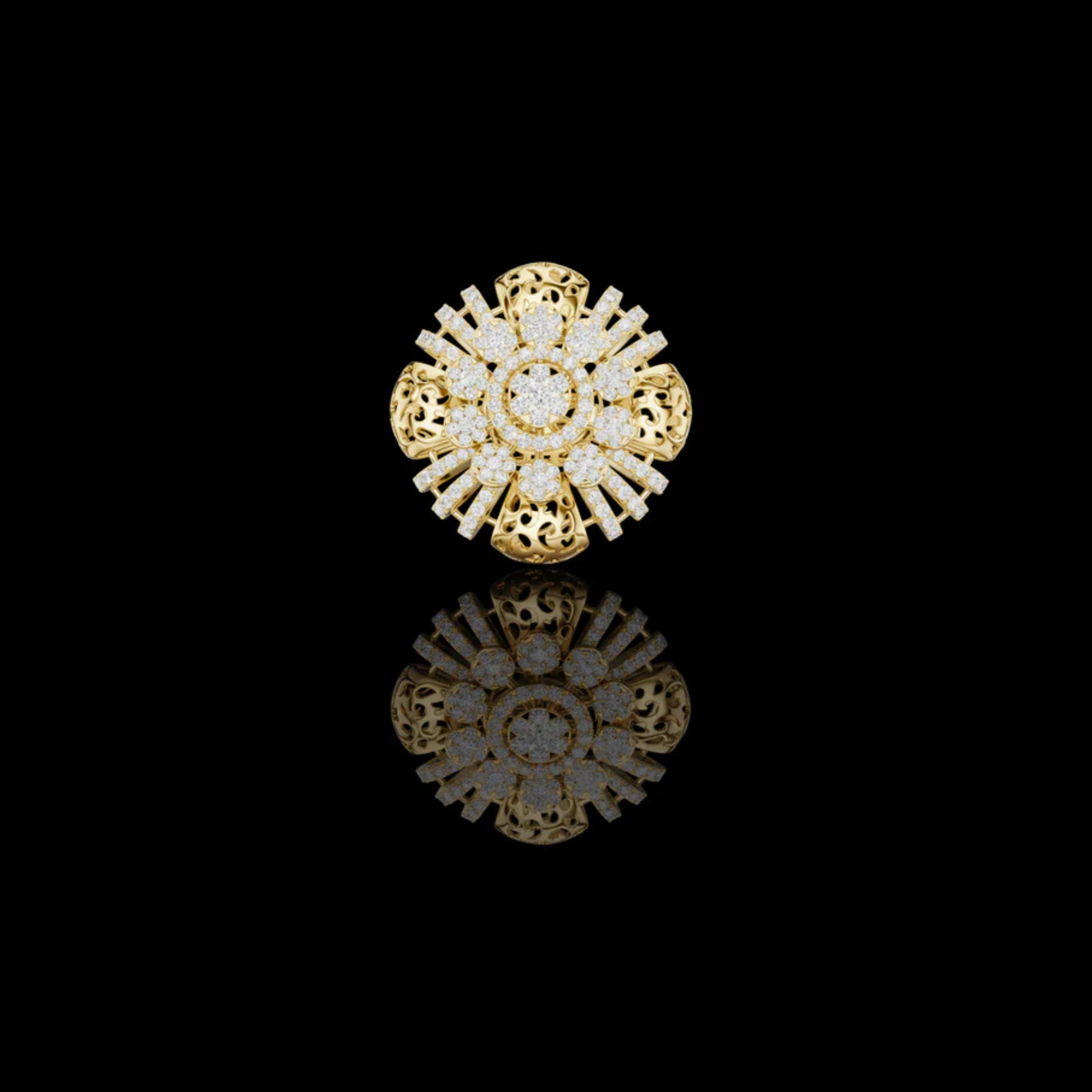 This magnificent ring showcases a breathtaking floral-inspired design, masterfully arranged with clusters of brilliant round cut diamonds that create a dazzling bloom at the center. The structure radiates outward with symmetrical diamond petals, giving the ring an extraordinary sense of depth, brilliance, and artistry.