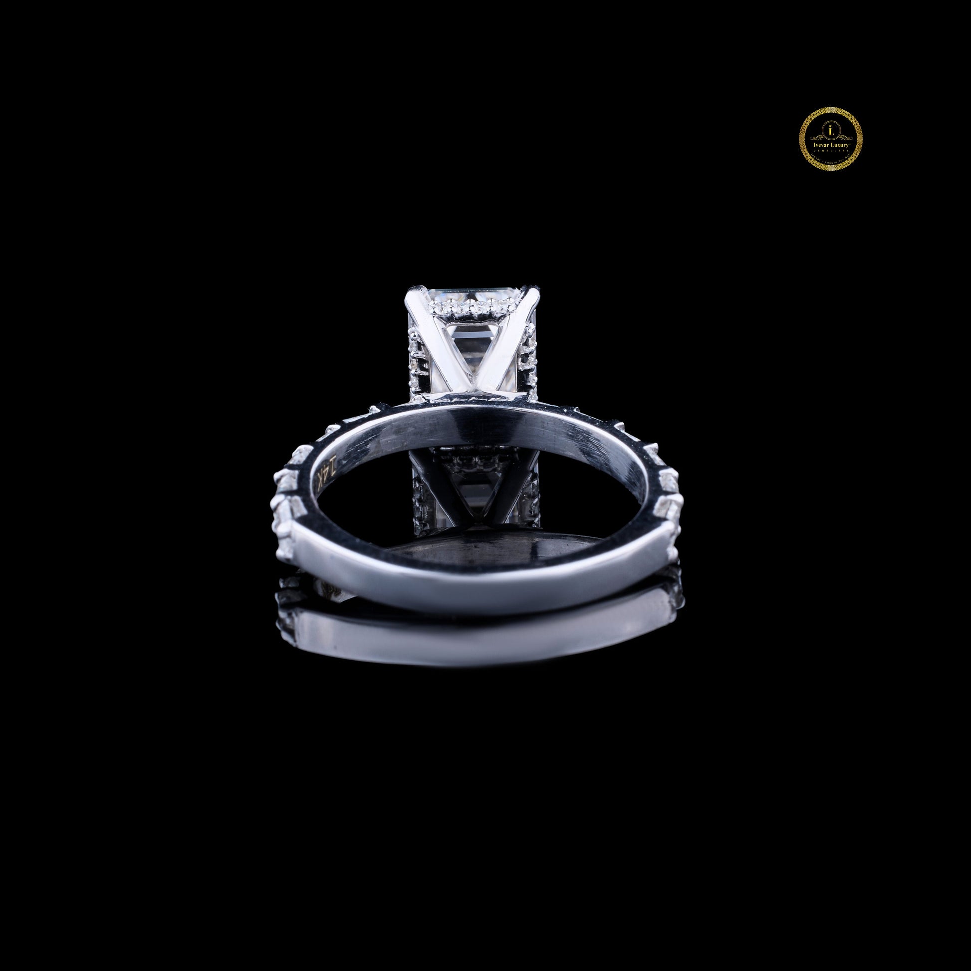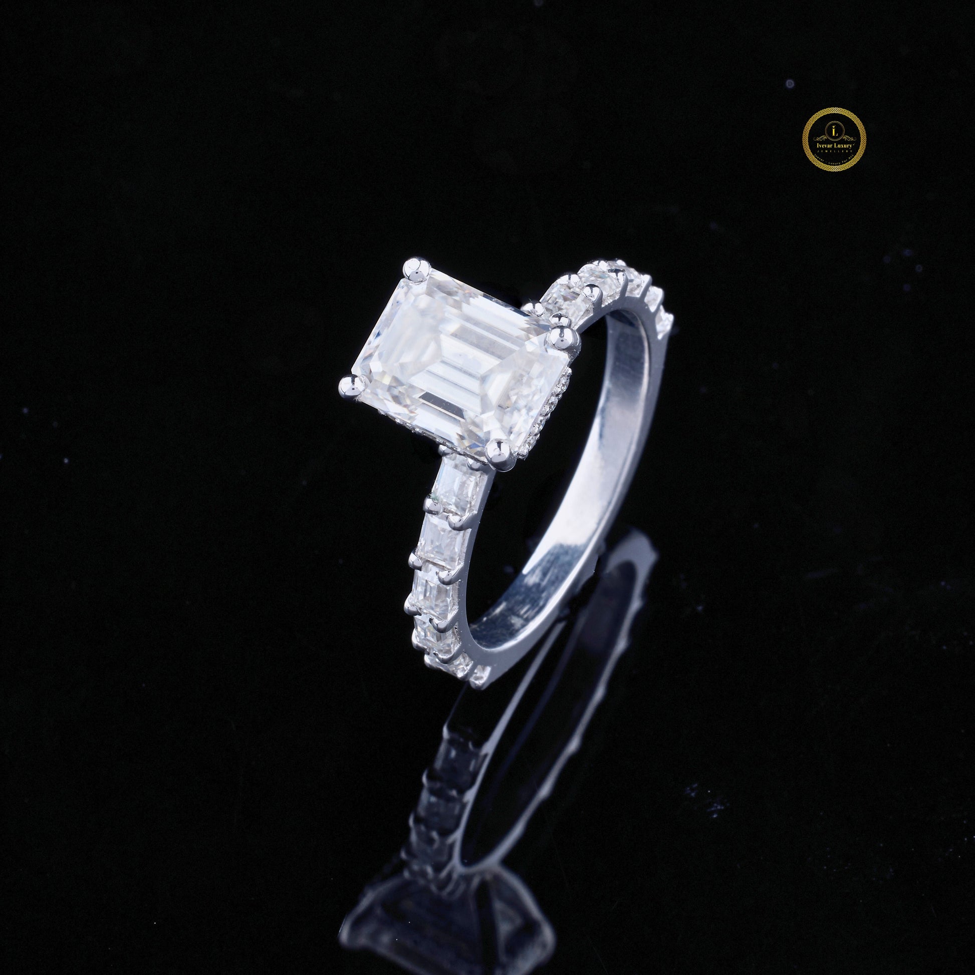 Step into timeless sophistication with this emerald cut diamond ring from Ivevar Luxury. The captivating rectangular center stone is set in a sleek, high-polish ring, adorned with round-side diamonds and also baguette that enhance its brilliance and depth. Designed for those who appreciate modern elegance and luxurious shine, this ring is a statement of refined beauty and eternal love.