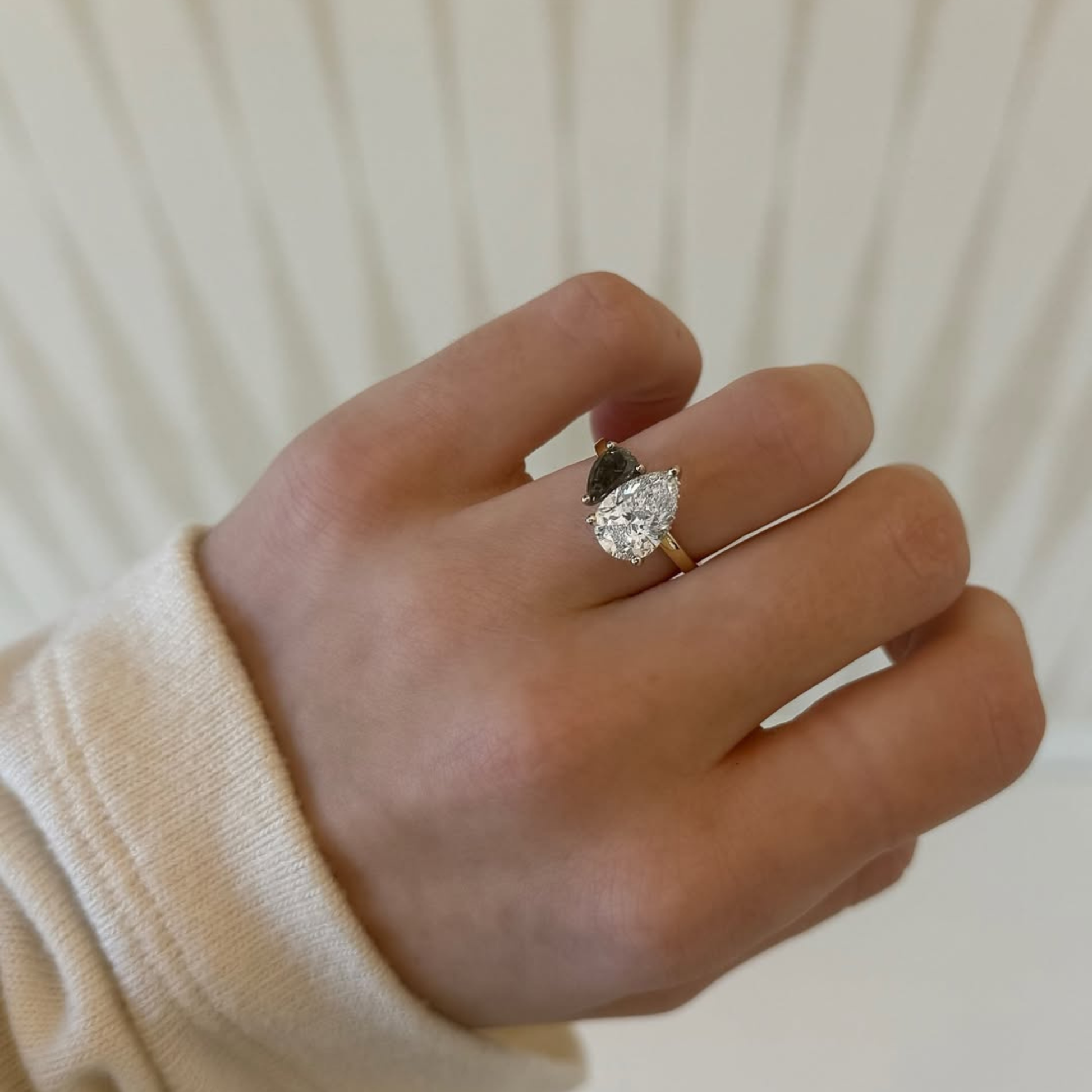 Ivevar Luxury introduces a refined Toi et Moi diamond ring showcasing a captivating balance of contrast and elegance. This design features two pear-cut diamonds—one brilliant white diamond and one mysterious black diamond—set side by side in polished gold. The asymmetrical composition symbolizes unity and individuality, while the elongated pear shapes enhance finger length and brilliance. Crafted with precision and modern sophistication, this ring is a perfect choice for engagements, anniversaries, or a bold luxury statement.