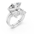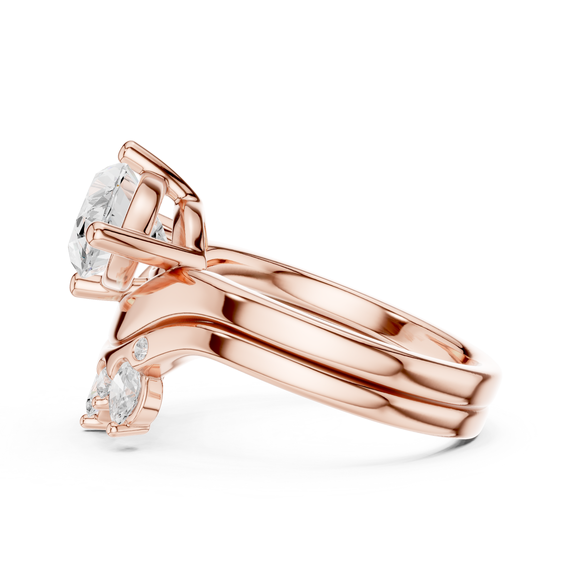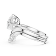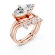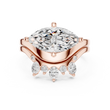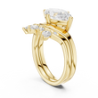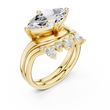 This stunning ring set features a bold marquise-cut diamond centerpiece, elegantly secured by a gold band that embraces the stone with smooth, flowing curves. Complementing the engagement ring is a scalloped accent band adorned with alternating oval and round brilliant diamonds, creating a crown-like effect that adds royal sophistication and intricate sparkle. The combination of sleek gold, unique stone shapes, and artistic design evokes a modern yet majestic style, perfect for someone seeking a statement piece with timeless elegance and refined luxury.