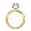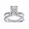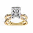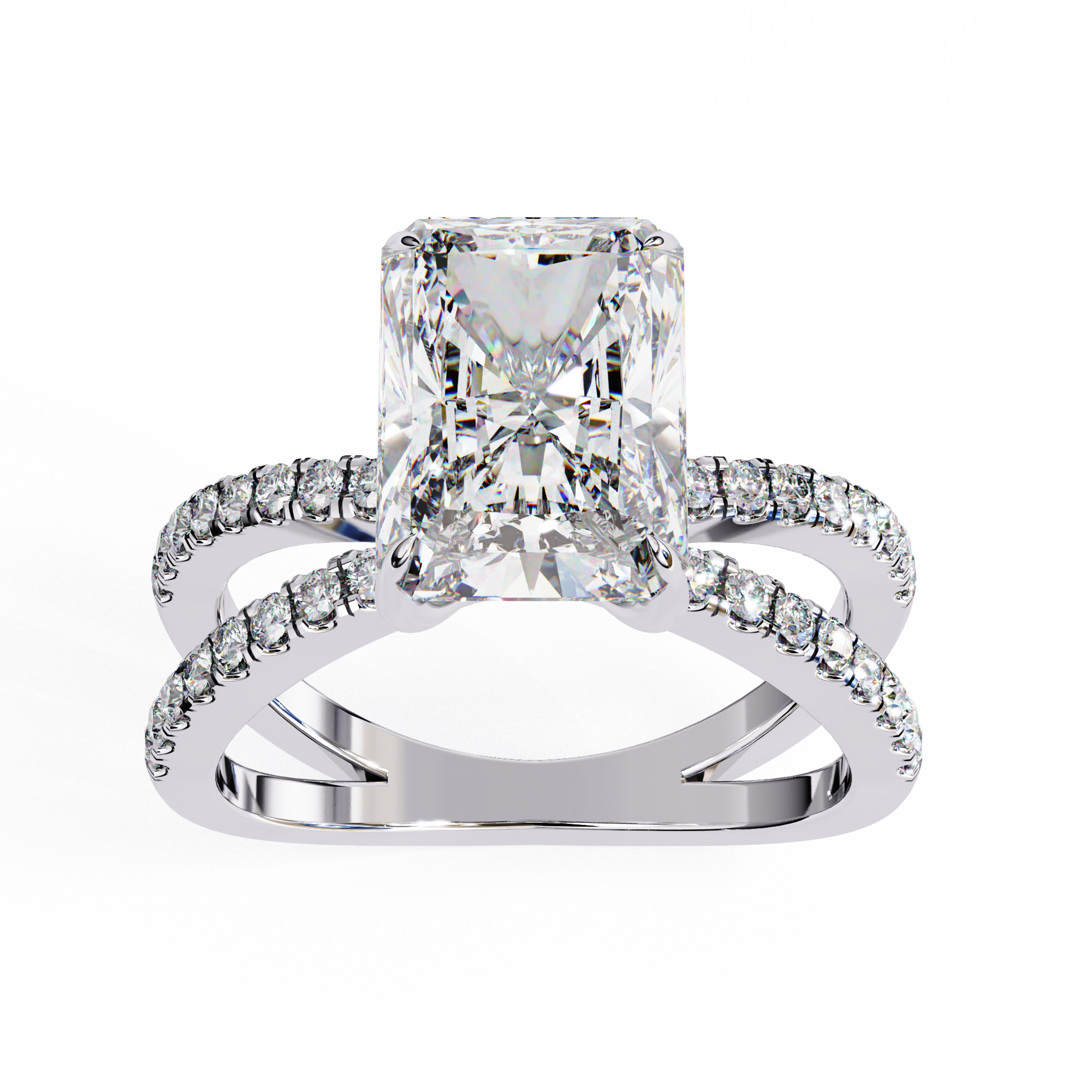 This exquisite ring showcases a radiant-cut diamond at its center, shimmering with intense brilliance and intricate facets that catch the light from every angle. The diamond is set on a sophisticated dual criss-cross band, gracefully split and adorned with a row of perfectly matched round diamonds that enhance its luxurious sparkle. The combination of the warm gold setting with the crisp, luminous center stone creates a striking balance of elegance and modern design, making this piece a standout choice for anyone seeking refined glamour.