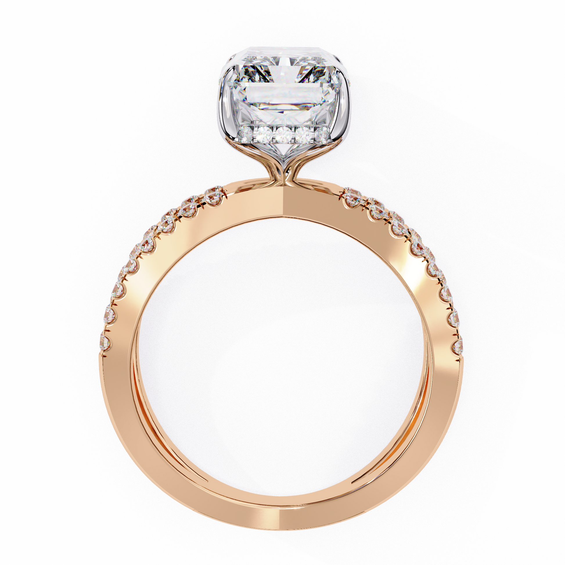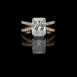 This exquisite ring showcases a radiant-cut diamond at its center, shimmering with intense brilliance and intricate facets that catch the light from every angle. The diamond is set on a sophisticated dual criss-cross band, gracefully split and adorned with a row of perfectly matched round diamonds that enhance its luxurious sparkle. The combination of the warm gold setting with the crisp, luminous center stone creates a striking balance of elegance and modern design, making this piece a standout choice for anyone seeking refined glamour.
