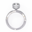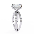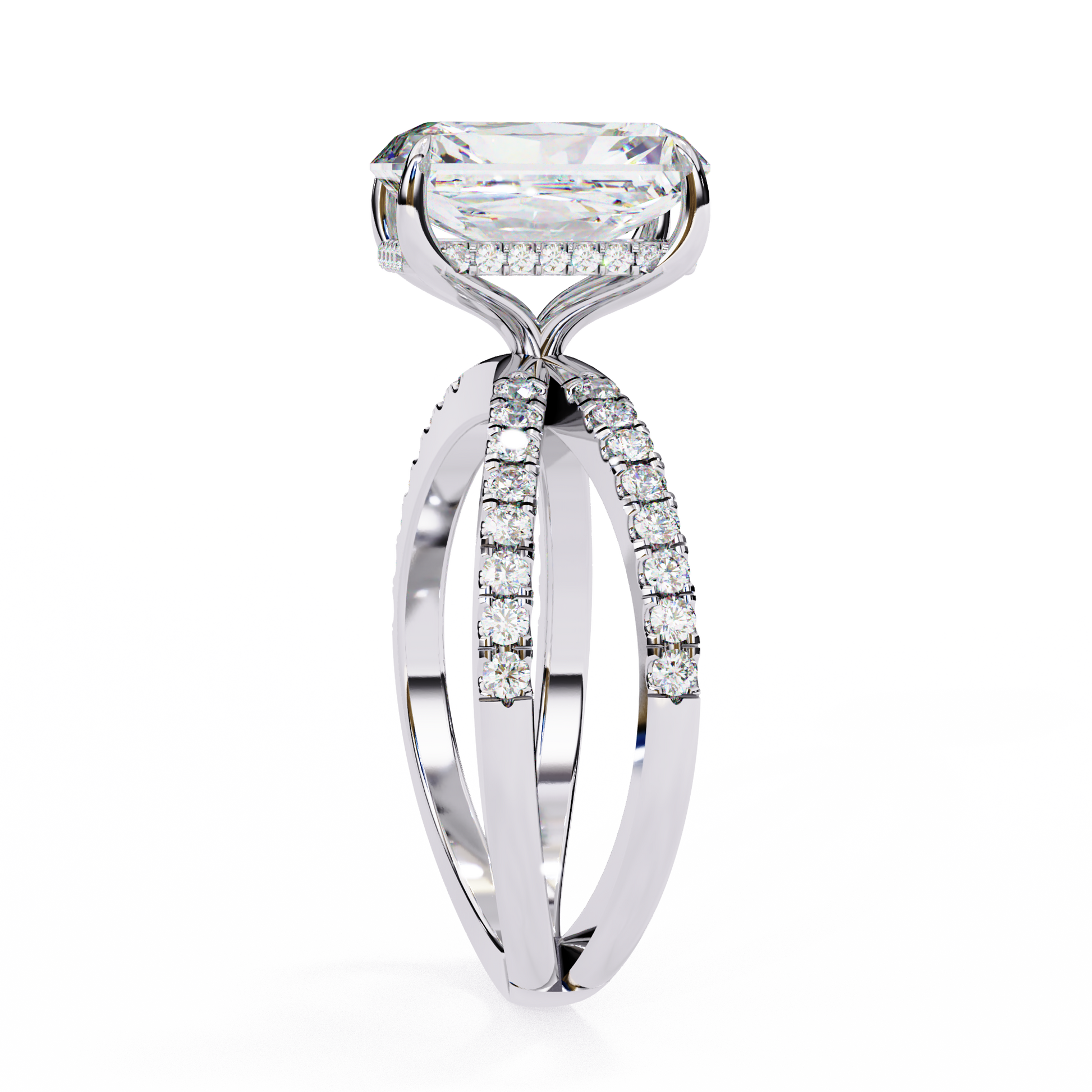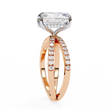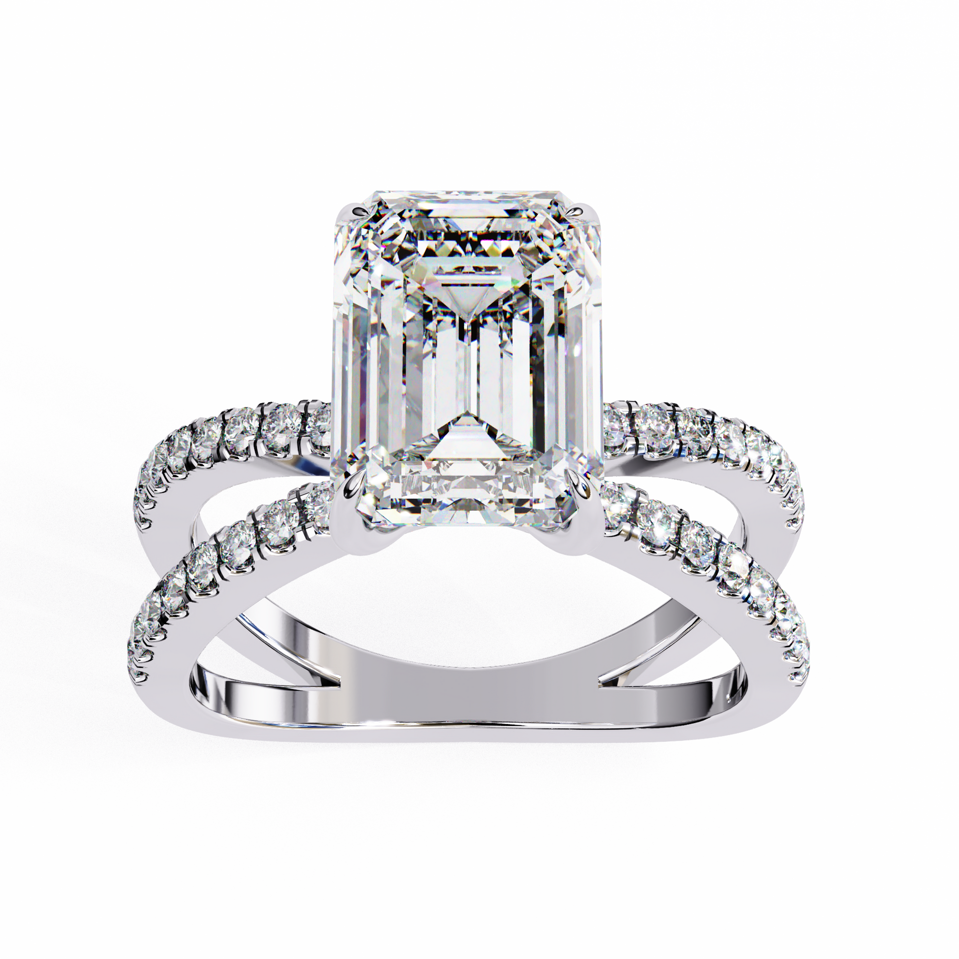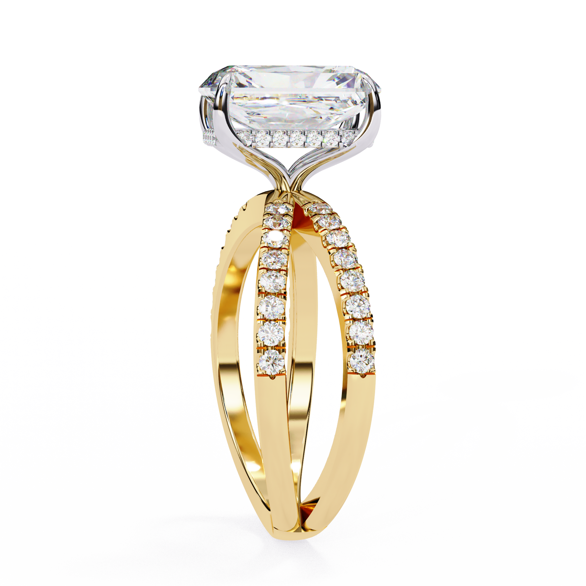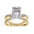 This stunning ring features a bold emerald-cut center diamond that commands attention with its crisp facets and mirror-like depth, set in a warm gold band that enhances its brilliance. Two parallel, round diamond-studded bands embrace the centerpiece, adding layers of sparkle and a modern, luxurious aesthetic. The sleek symmetry and radiant contrast between gold and diamonds create an impression of refined elegance, making this ring a striking expression of sophistication and timeless beauty.