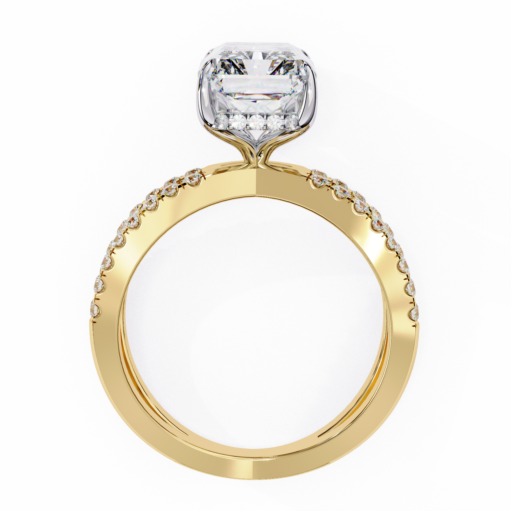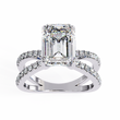 This stunning ring features a bold emerald-cut center diamond that commands attention with its crisp facets and mirror-like depth, set in a warm gold band that enhances its brilliance. Two parallel, round diamond-studded bands embrace the centerpiece, adding layers of sparkle and a modern, luxurious aesthetic. The sleek symmetry and radiant contrast between gold and diamonds create an impression of refined elegance, making this ring a striking expression of sophistication and timeless beauty.