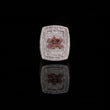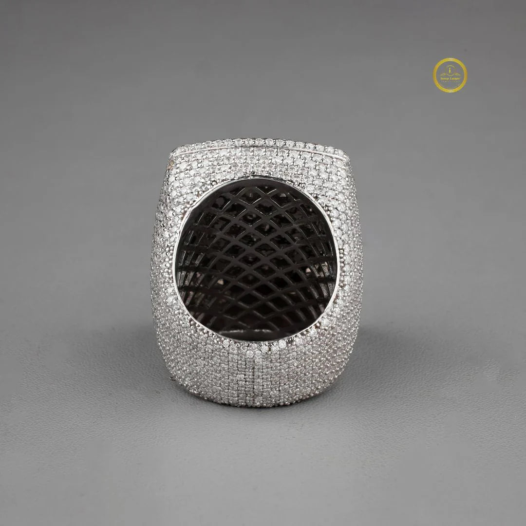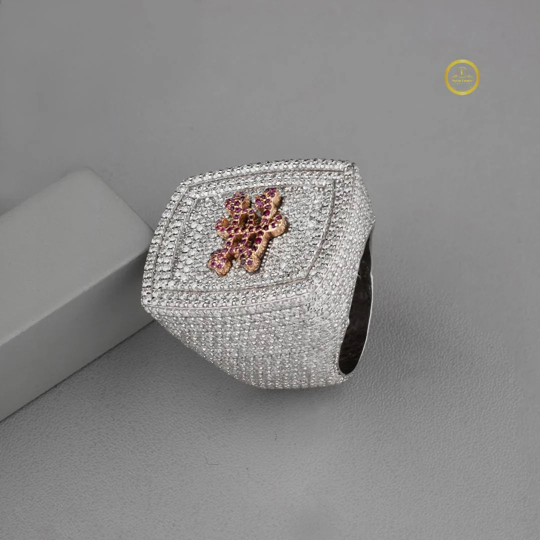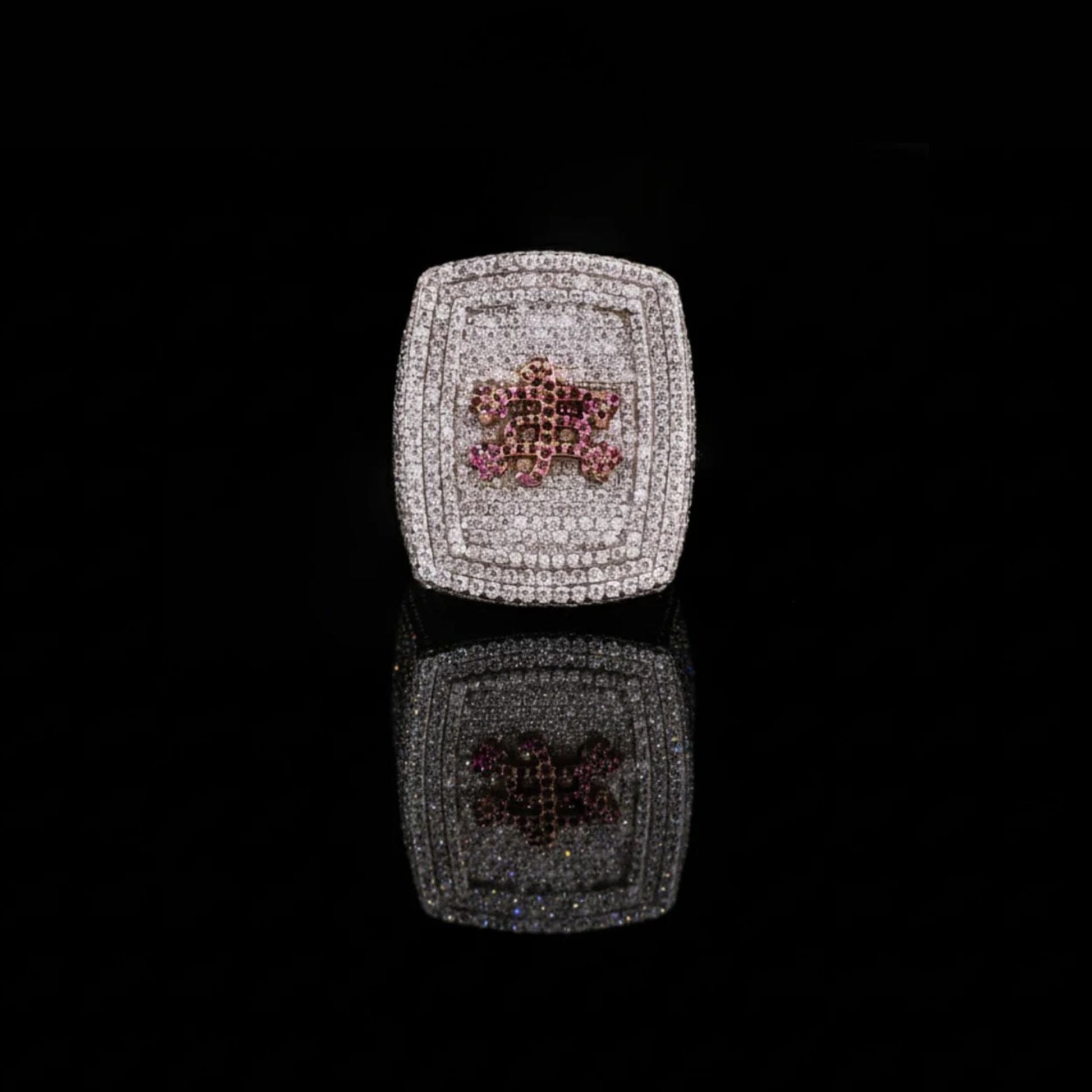 This exquisite ring showcases a bold rectangular design fully encrusted with shimmering white stones, creating a luxurious, high-impact sparkle from every angle. At its center, a striking floral motif crafted from rich pink gemstones adds a vibrant touch of color and elegance, standing out beautifully against the brilliant round pavé background. The combination of geometric structure and delicate artistry gives the piece a refined yet eye-catching presence, making it a perfect statement accessory for those who appreciate intricate detail and sophisticated glamour.