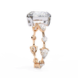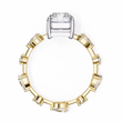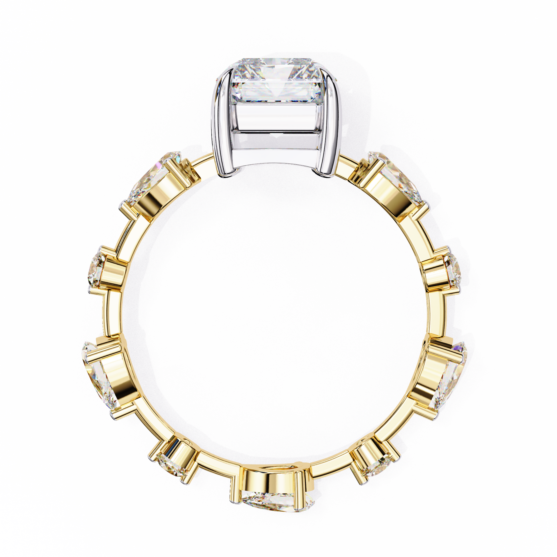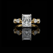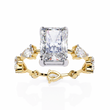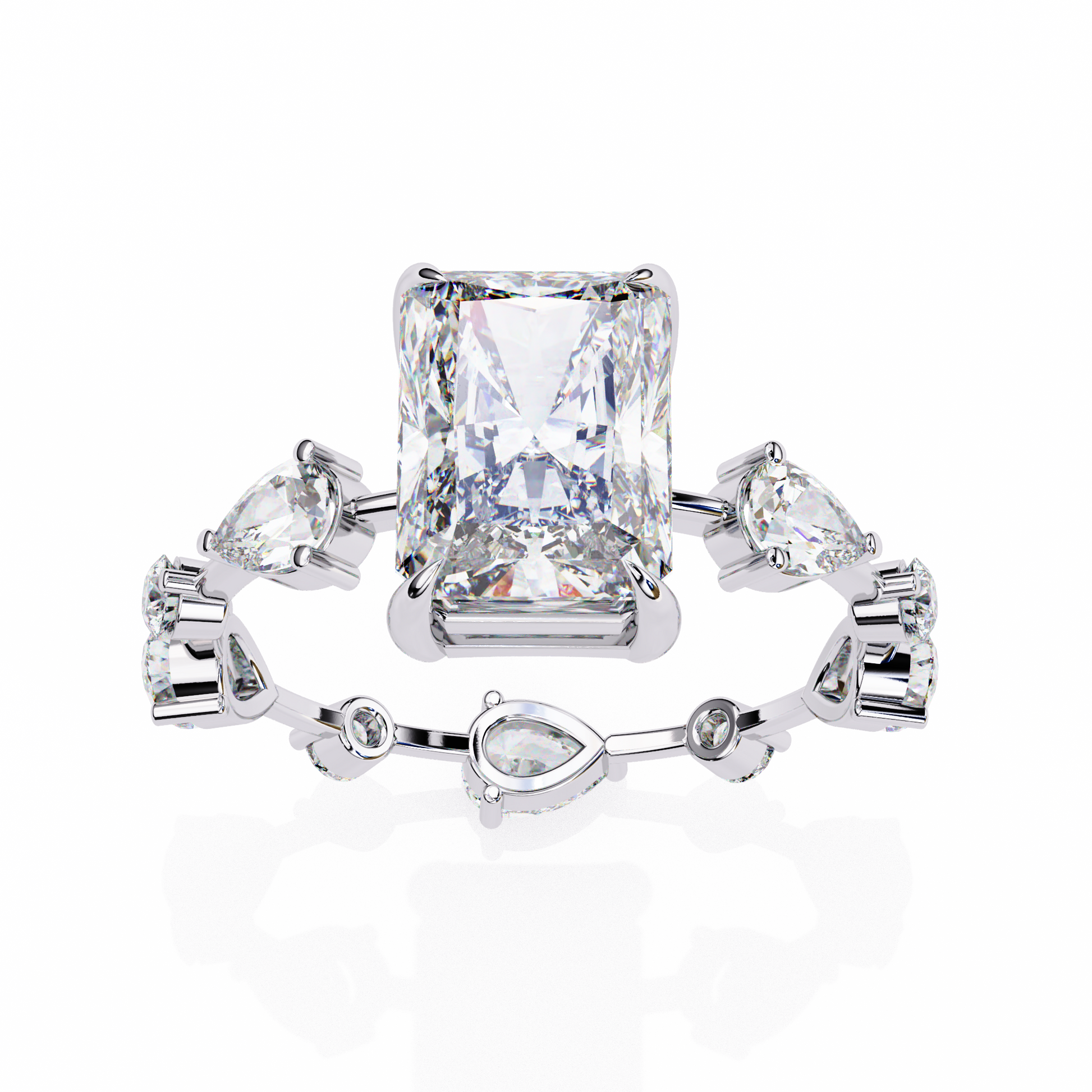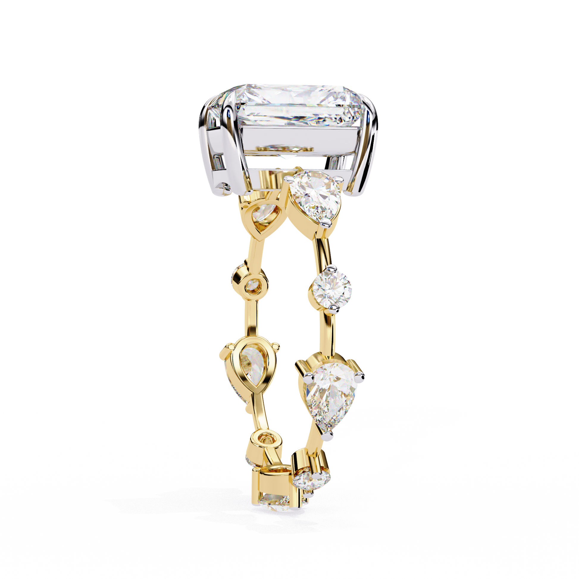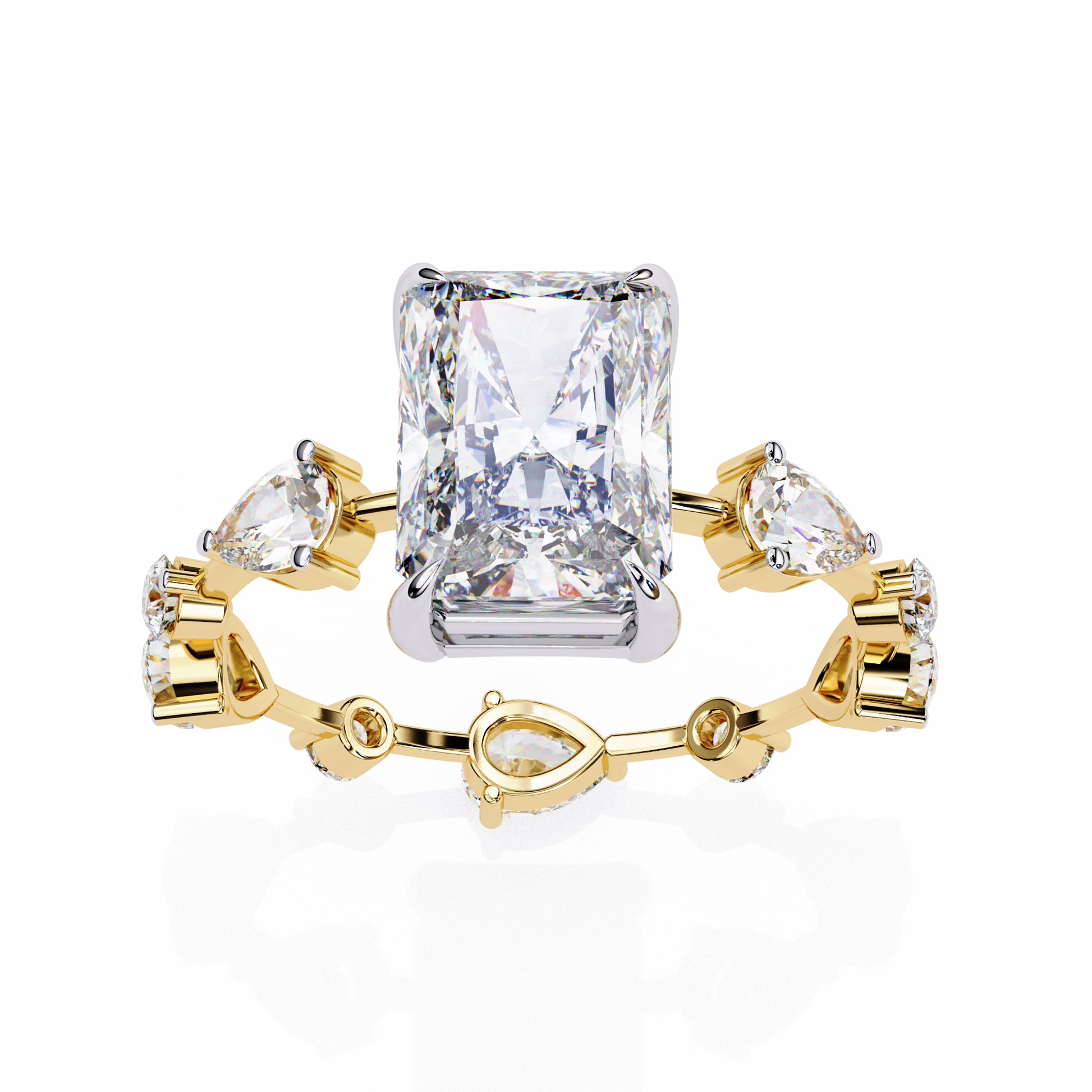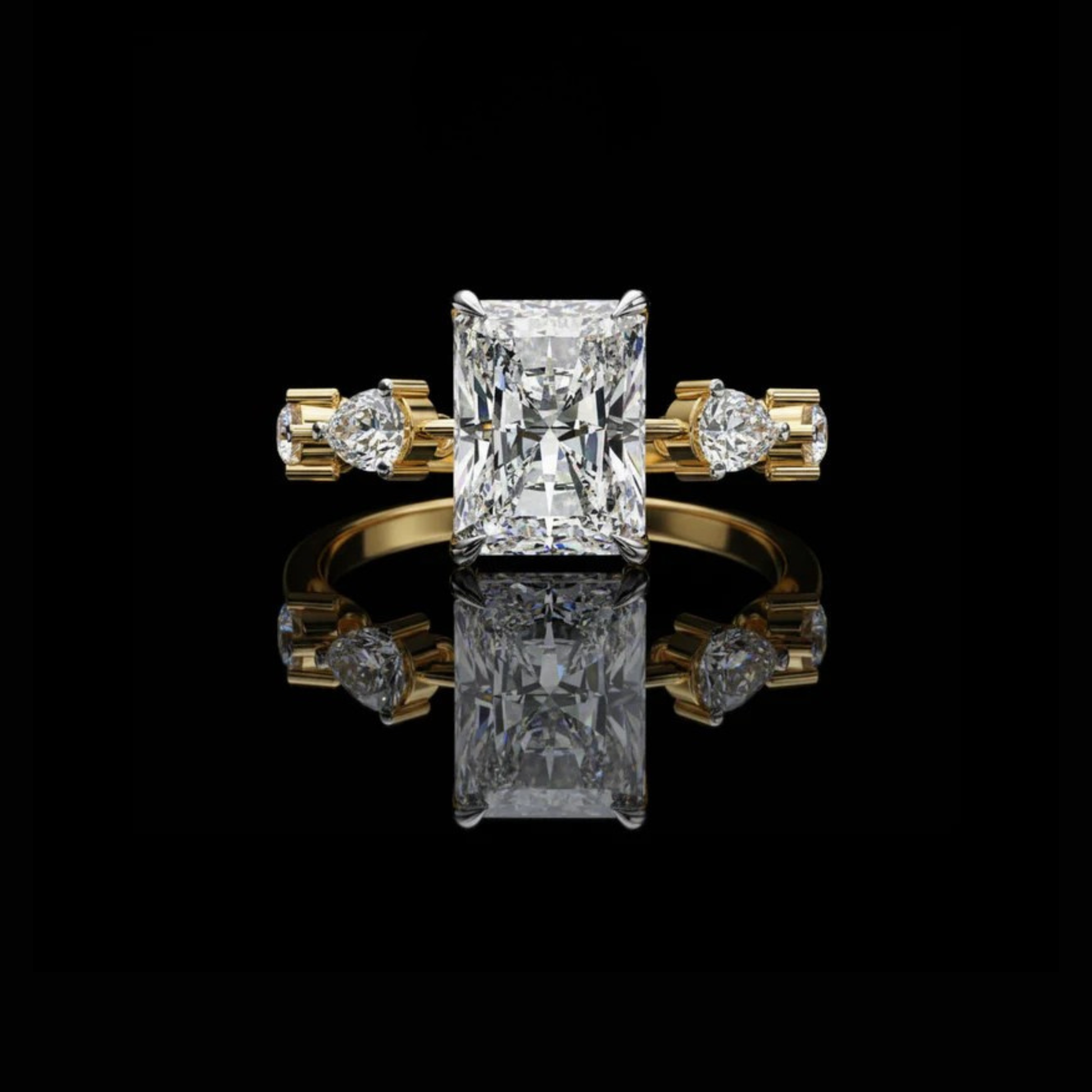 This ring features a striking stunning radiant cut center diamond set in a warm gold band, flanked by two intricately cut pear and round side diamonds that add symmetry and brilliance. Its clean geometric lines contrast beautifully with the rich gold setting, creating a luxurious, modern-classic aesthetic. The mirror-like black background highlights the exceptional clarity and fire of the stones, giving the piece an elegant, high-end presentation.