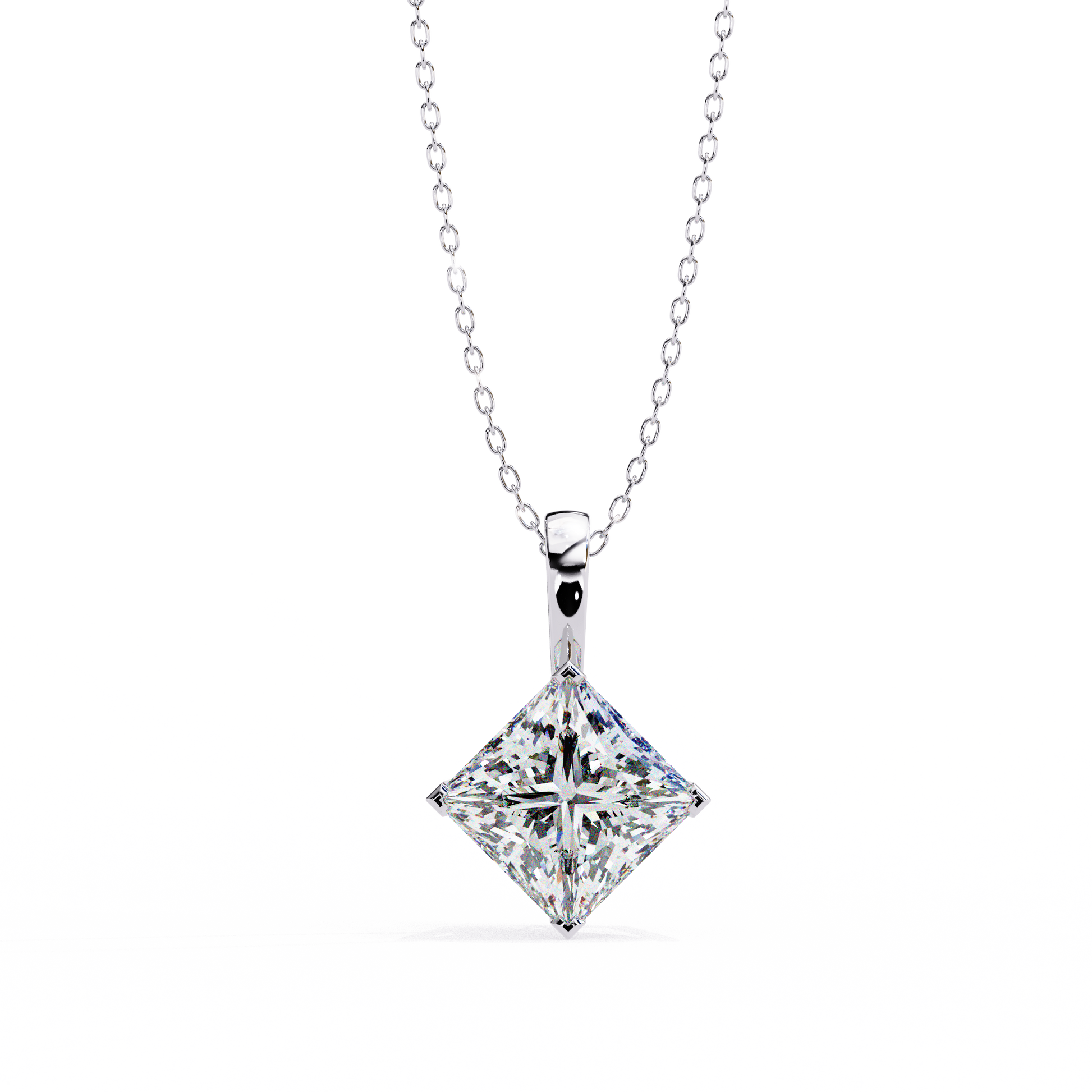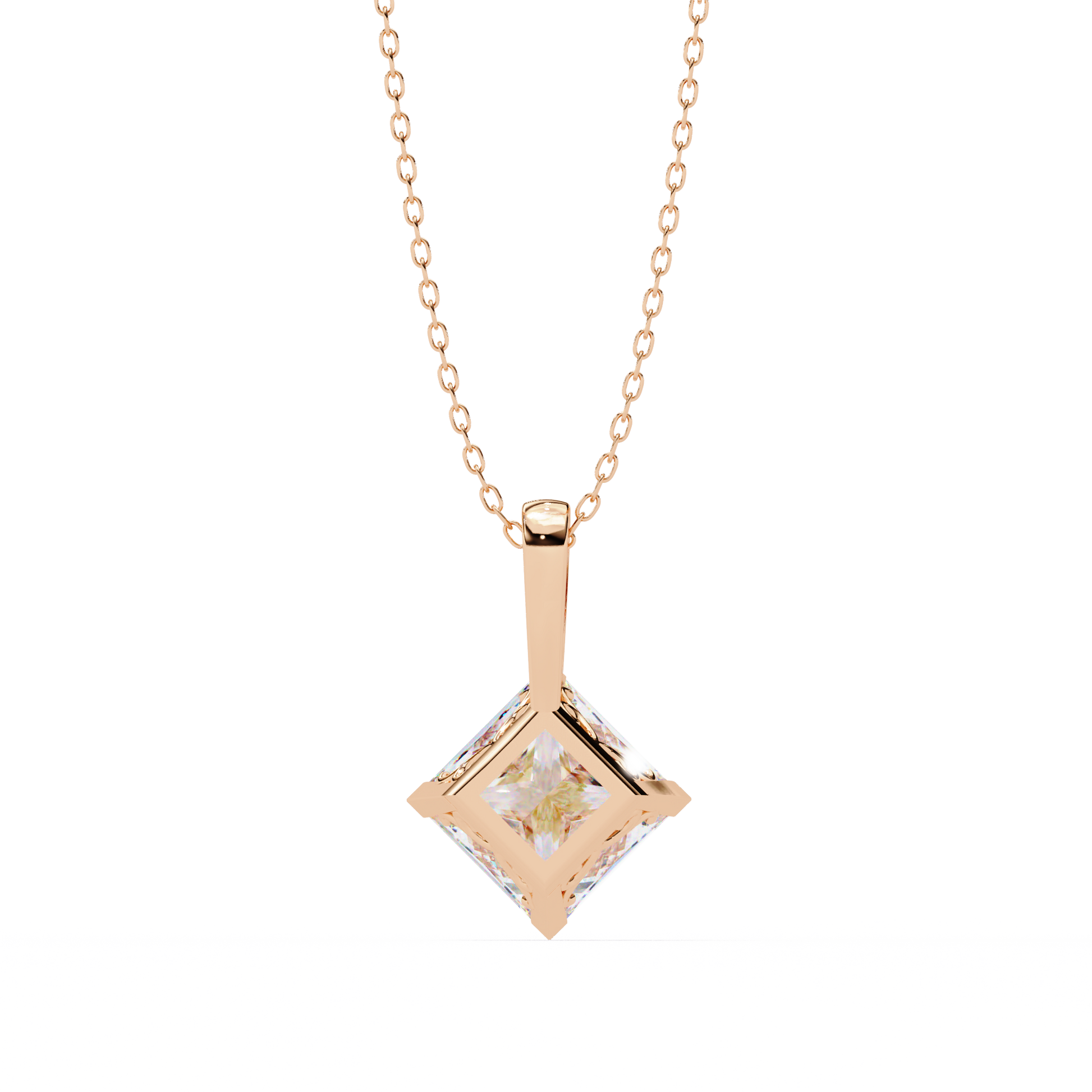 This pendant displays a captivating Princess Cut Moissanite Diamond within an elegant gold, rose gold and silver frame, exuding both contemporary grace and timeless charm. The precise, symmetrical edges of the Princess-cut stone catch and refract light brilliantly, amplifying its radiant sparkle from every perspective. Completed with a sleek gold bail and a minimalist silhouette, this piece epitomizes refined sophistication and effortless versatility—an ideal statement accessory for both daily elegance and special occasions by Ivevar Luxury.