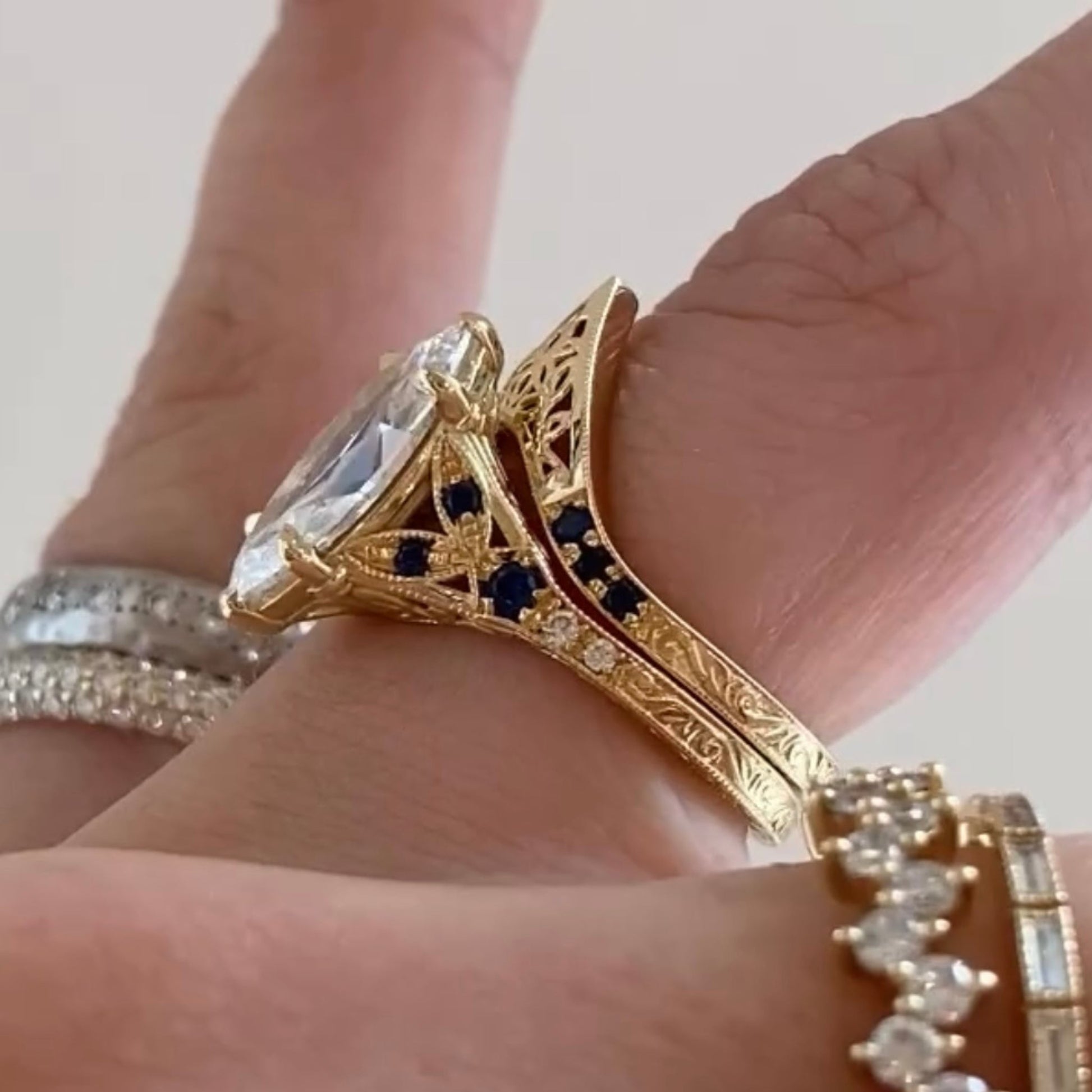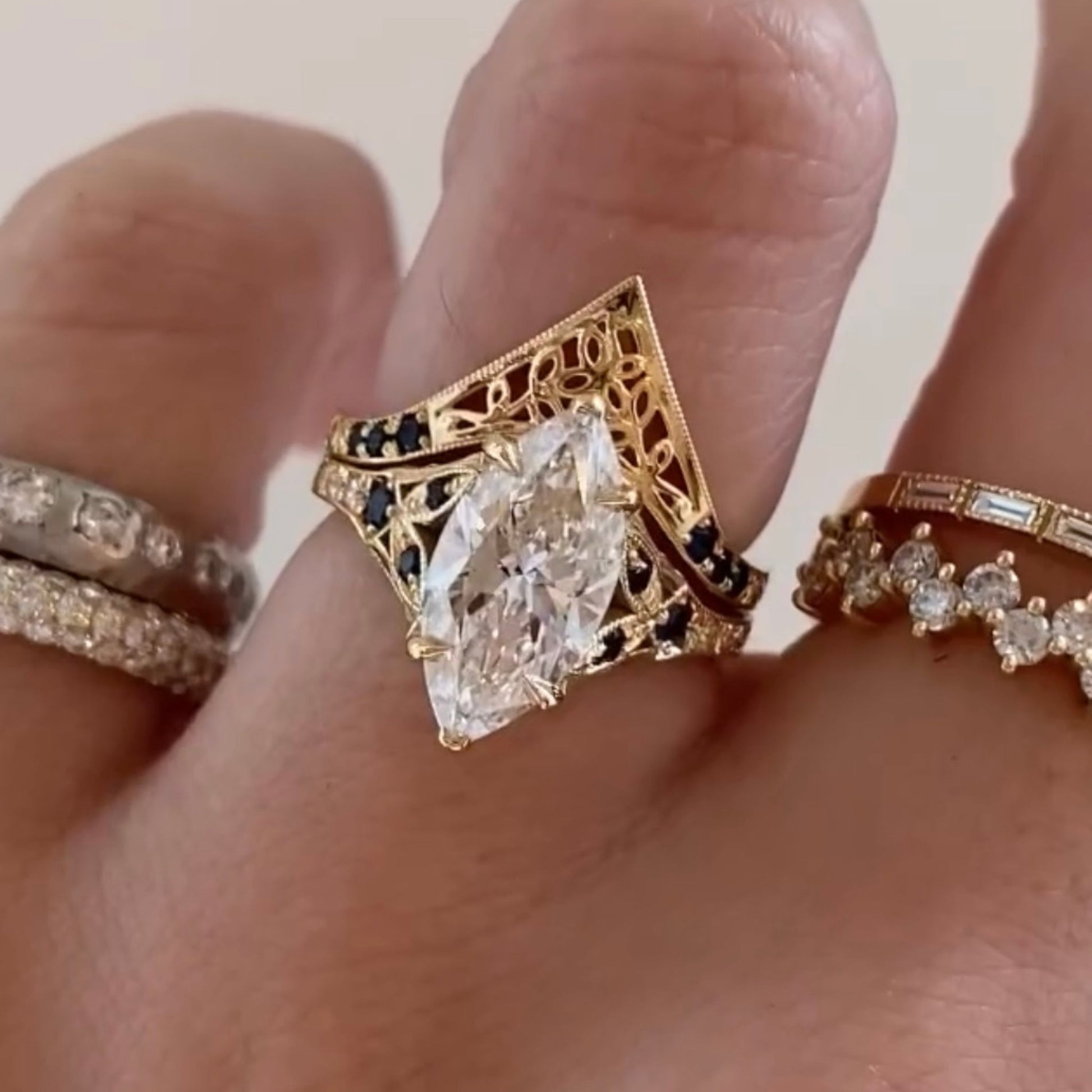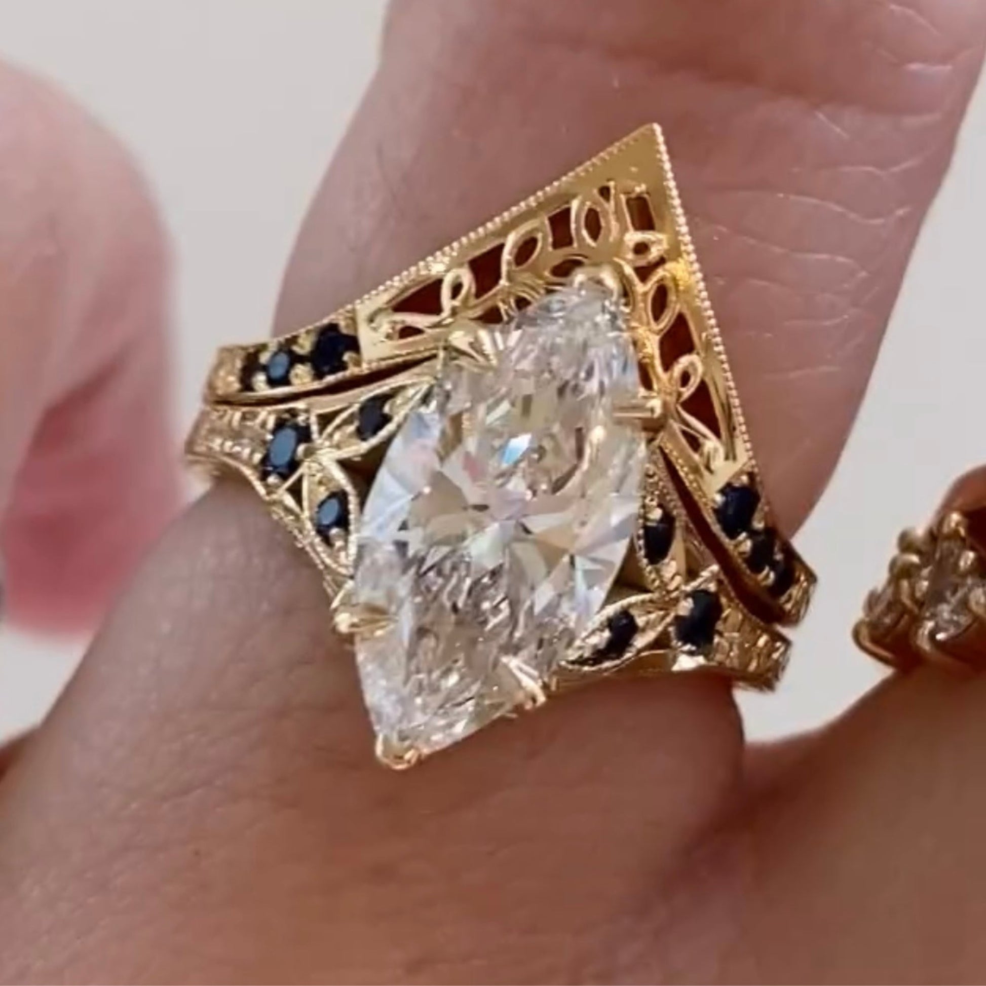 This luxury marquise cut diamond ring features a brilliant elongated center stone set in rich gold with deep black sapphire accents. The intricate vintage-inspired filigree design adds character, elegance, and timeless charm. Crafted for those who appreciate heritage craftsmanship and bold luxury, this ring is perfect for engagements, anniversaries, or statement fine jewelry collections.