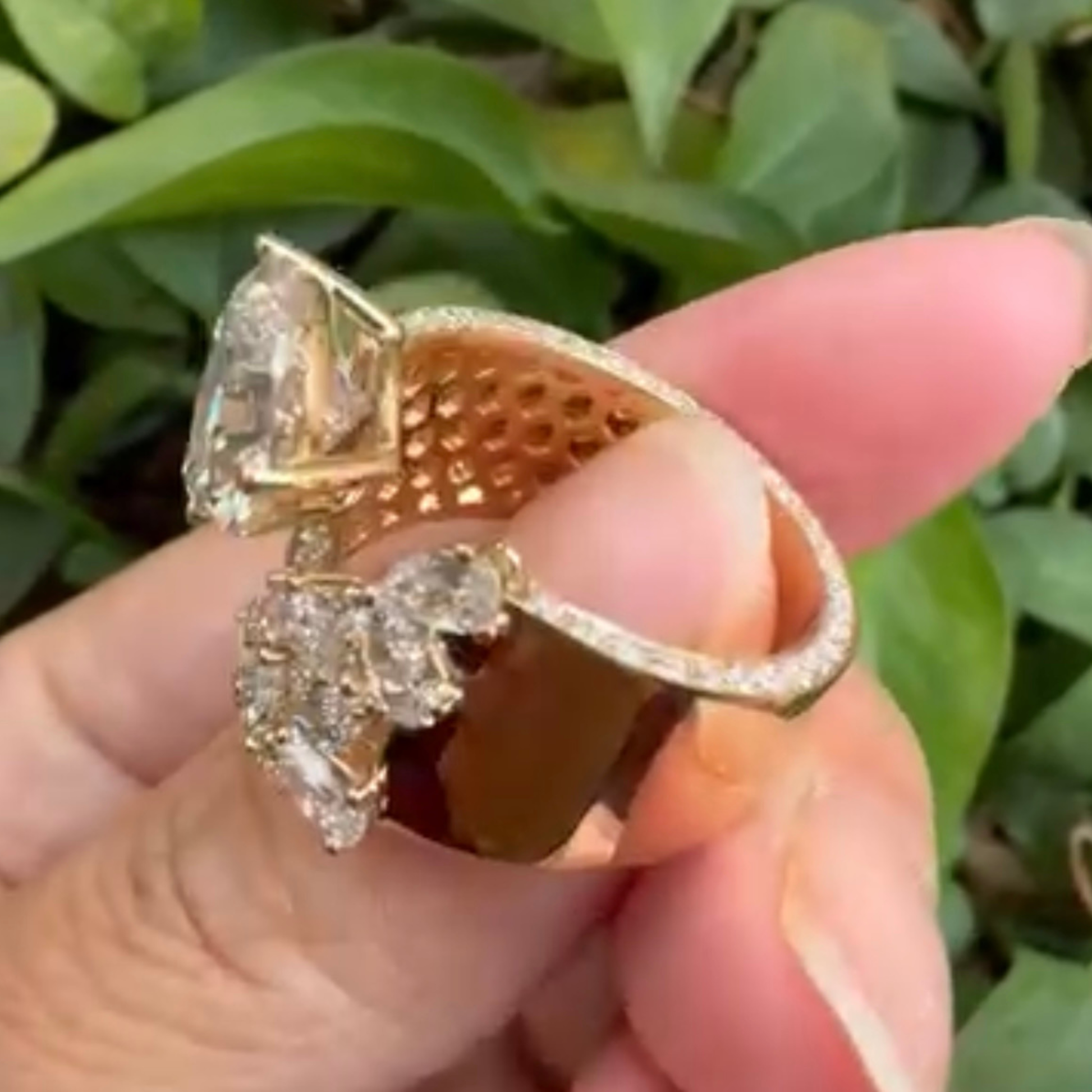At Ivevar Luxury, this ring is designed as a bold expression of artistry and modern elegance. Showcasing a striking pear cut diamond, the open-band structure creates a powerful visual balance between the center stone and the intricate floral cluster of marquise and round diamonds on the opposite side. the sculptural shank features a polished high-gloss finish with delicate pave detailing that enhances brilliance from every angle. The asymmetrical silhouette gives this ring a contemporary, high-fashion appeal while maintaining refined craftsmanship.