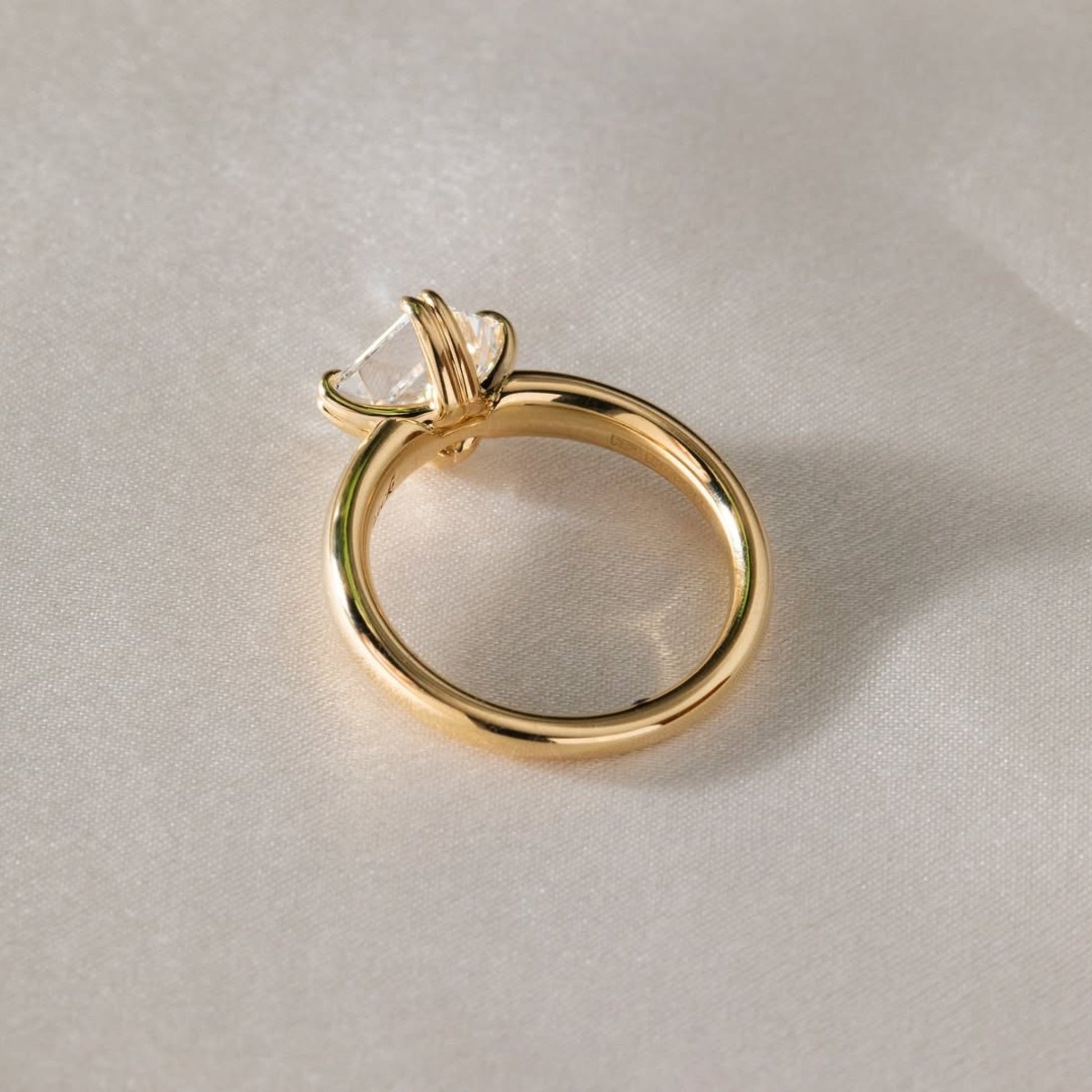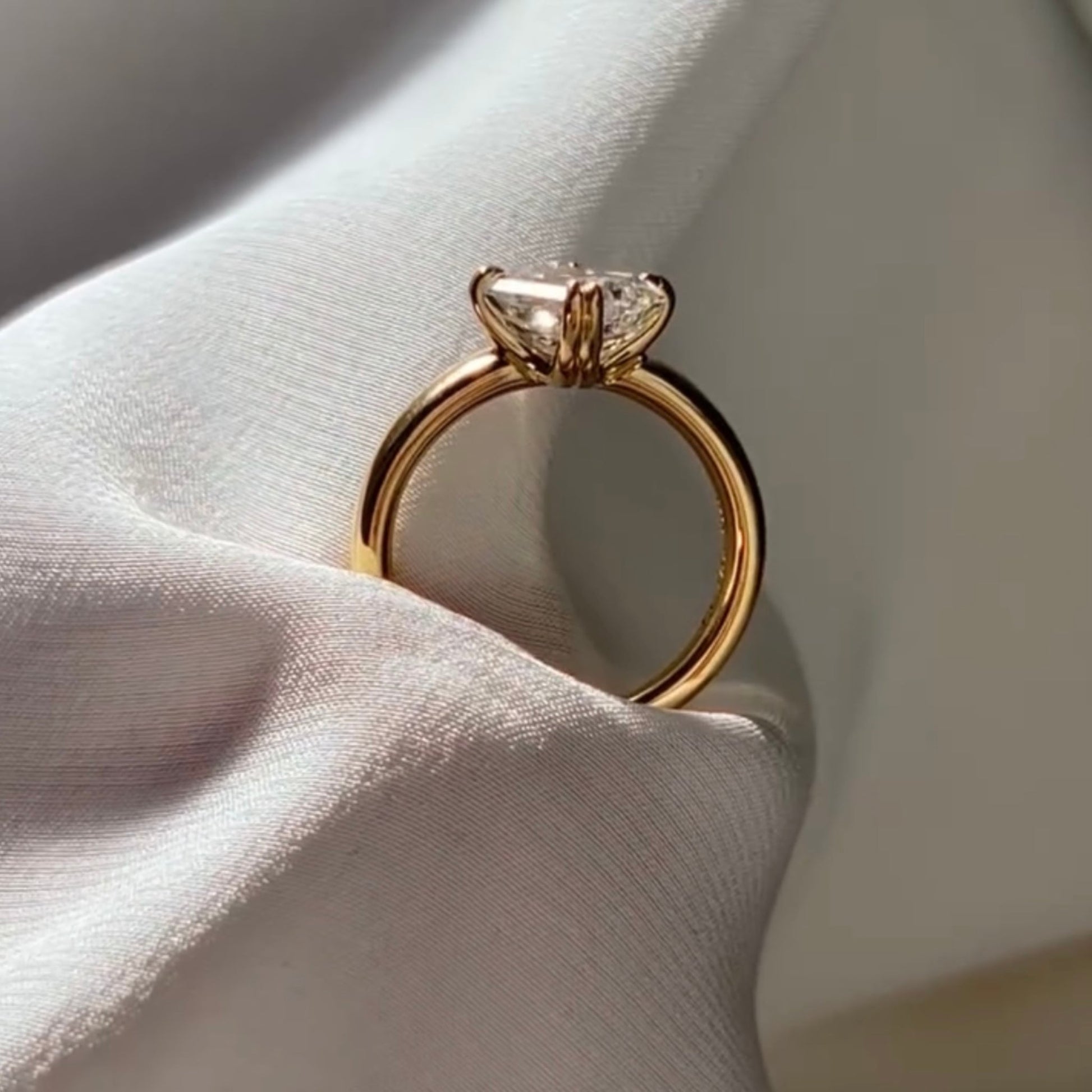 This refined solitaire ring showcases a striking Asscher-cut center stone, celebrated for its geometric step-cut facets and captivating depth. Set in a classic four-prong gold setting, the stone is perfectly balanced by a smooth, rounded band that enhances comfort and timeless appeal. Minimal yet sophisticated, this design is ideal for those who appreciate clean lines, vintage influence, and understated luxury.