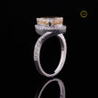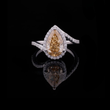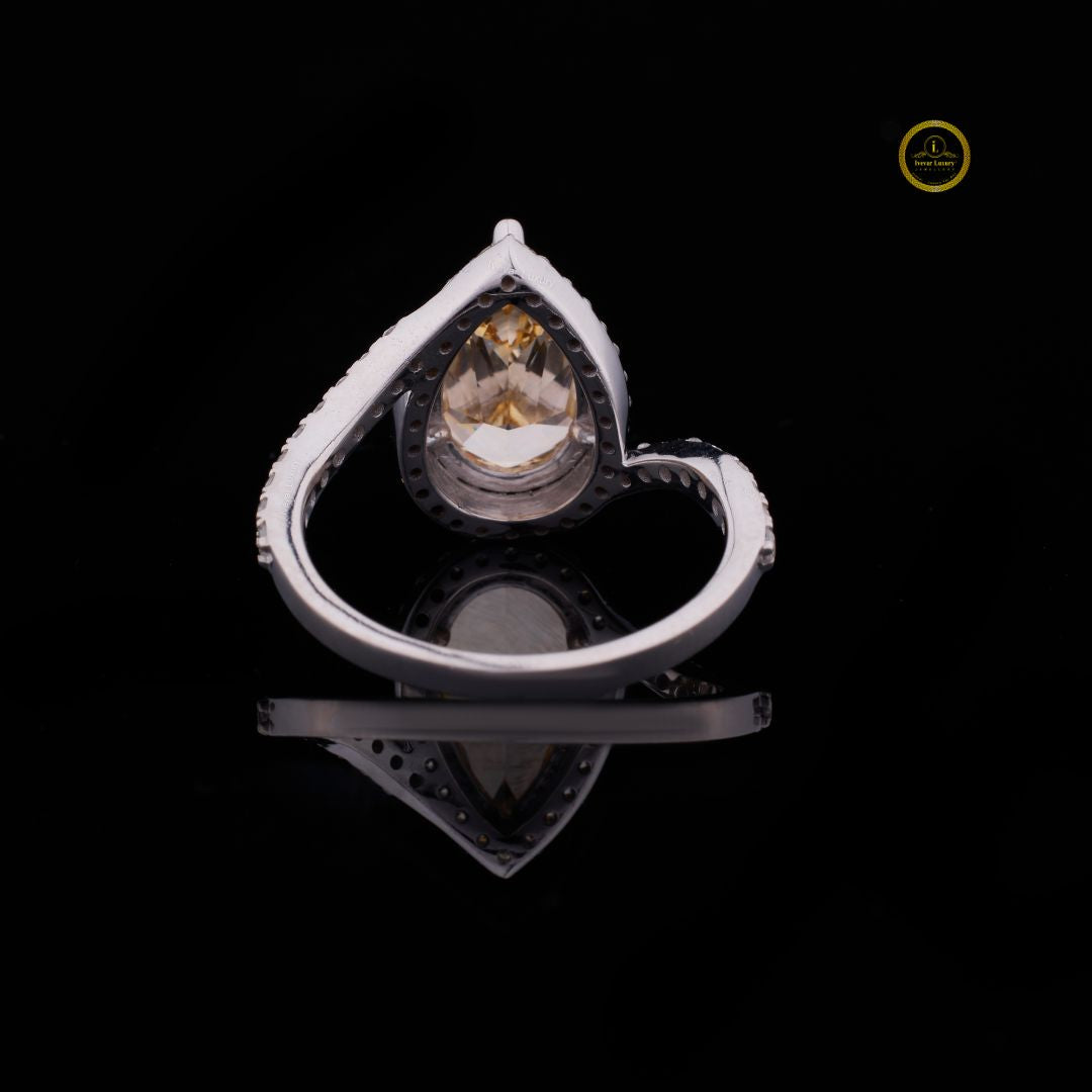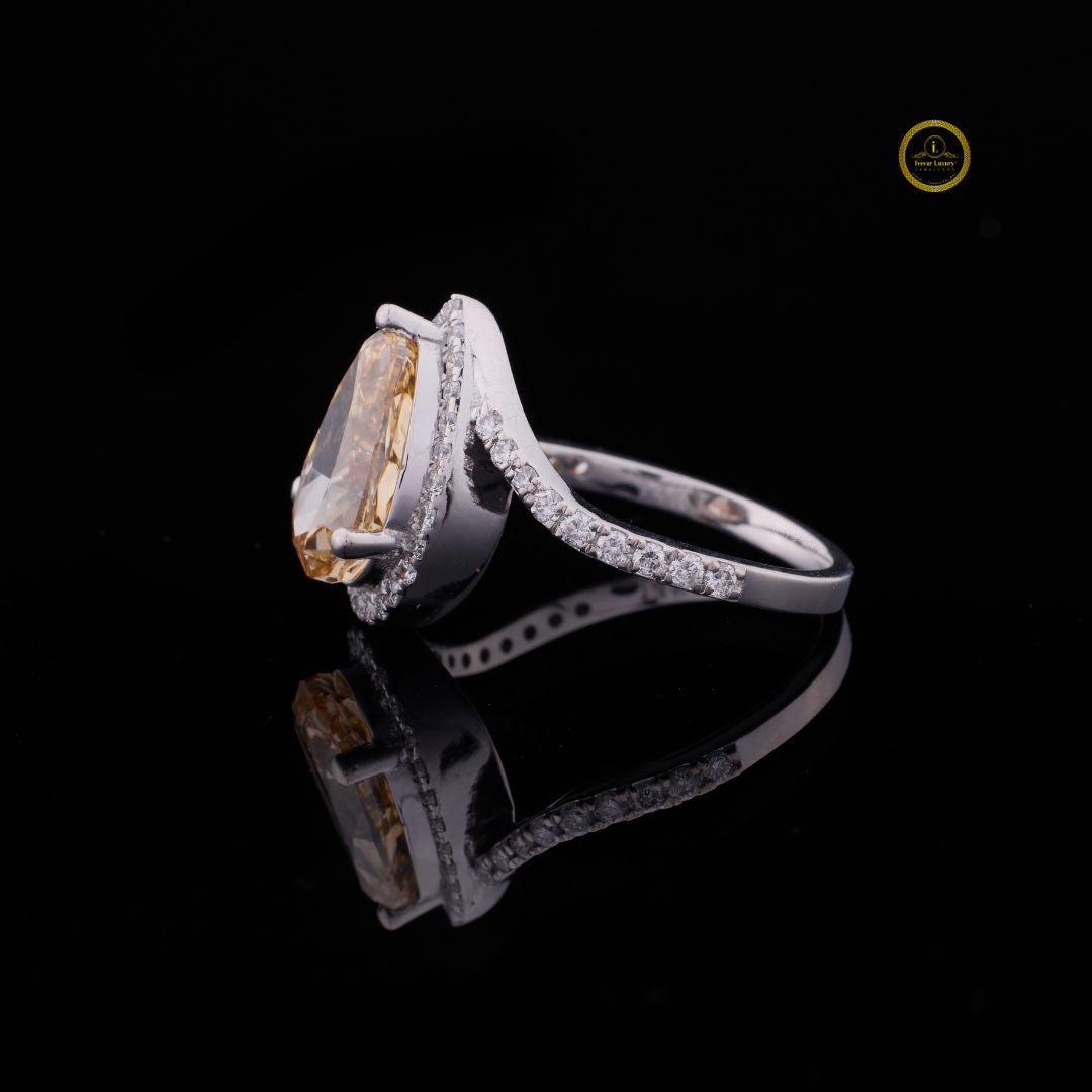 This exceptional ring features a striking, substantial pear-cut diamond exhibiting a rich, warm fancy vivid yellow hue. The beautiful teardrop stone is outlined by a delicate halo of micro-pave set round diamonds, which provides a crisp contrast and enhances the center stone's vibrant color. The setting is highly contemporary, featuring a bypass or tension-style shank crafted from white precious metal. The band splits as it approaches the center, with one side of the split shank also fully set with pave diamonds from Ivevar.