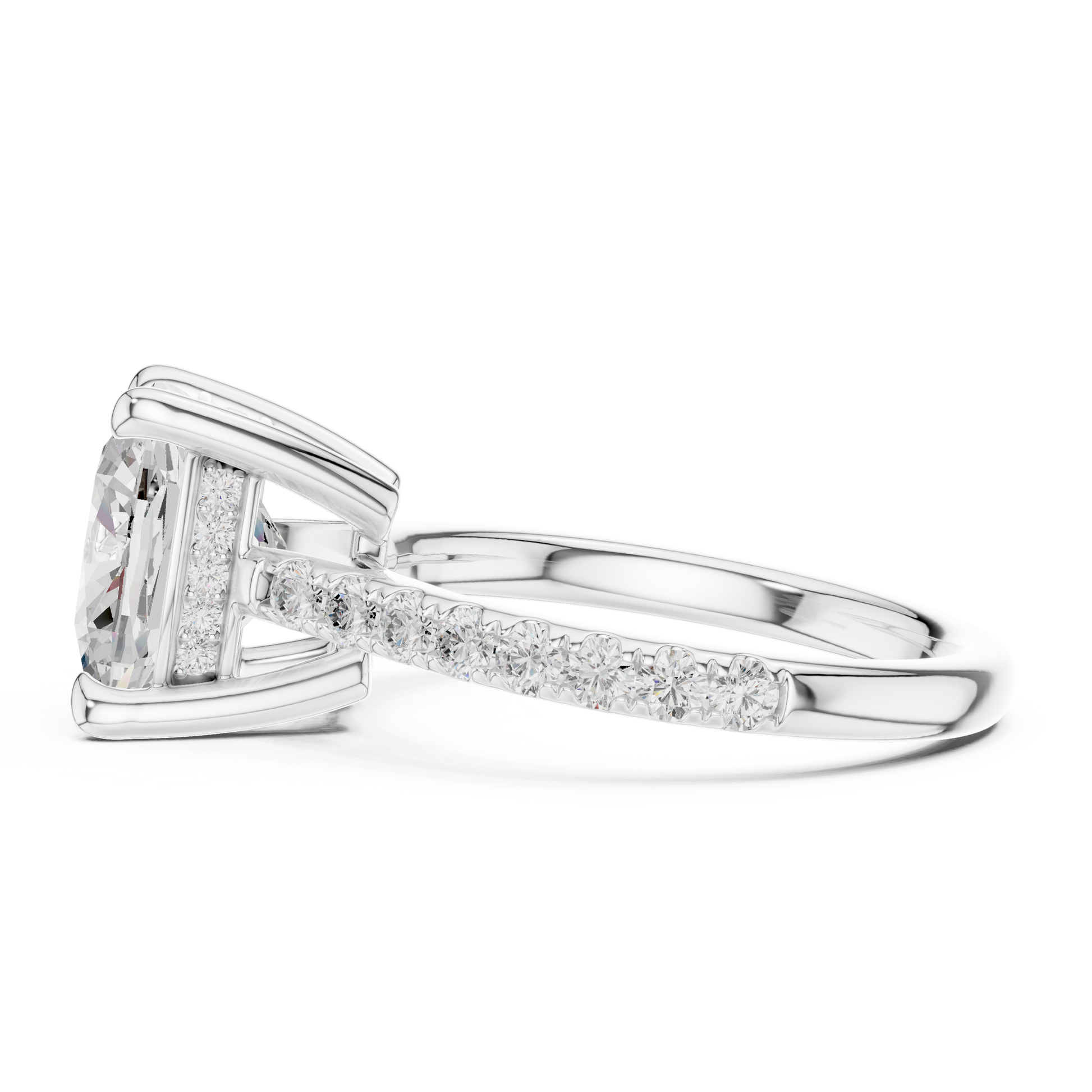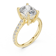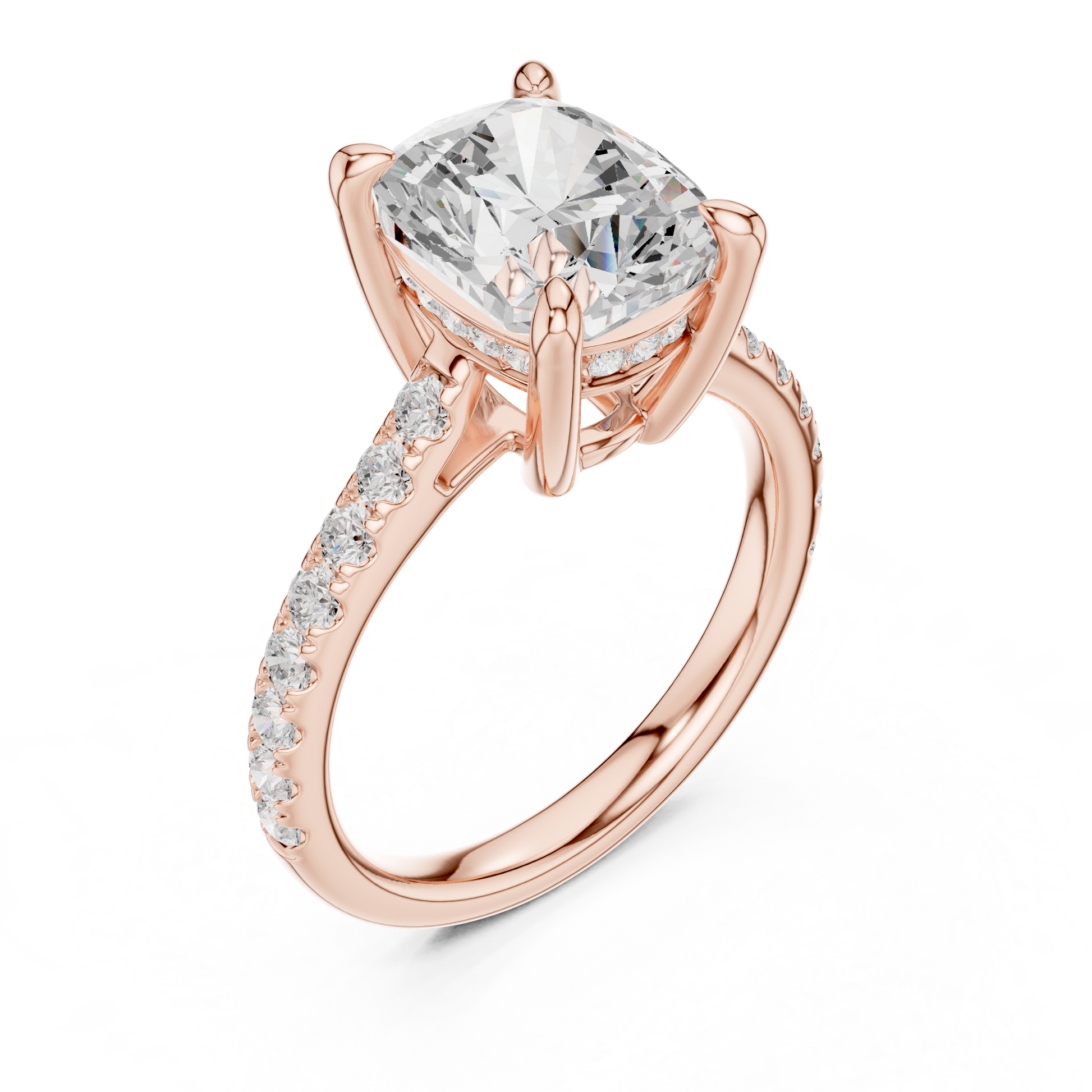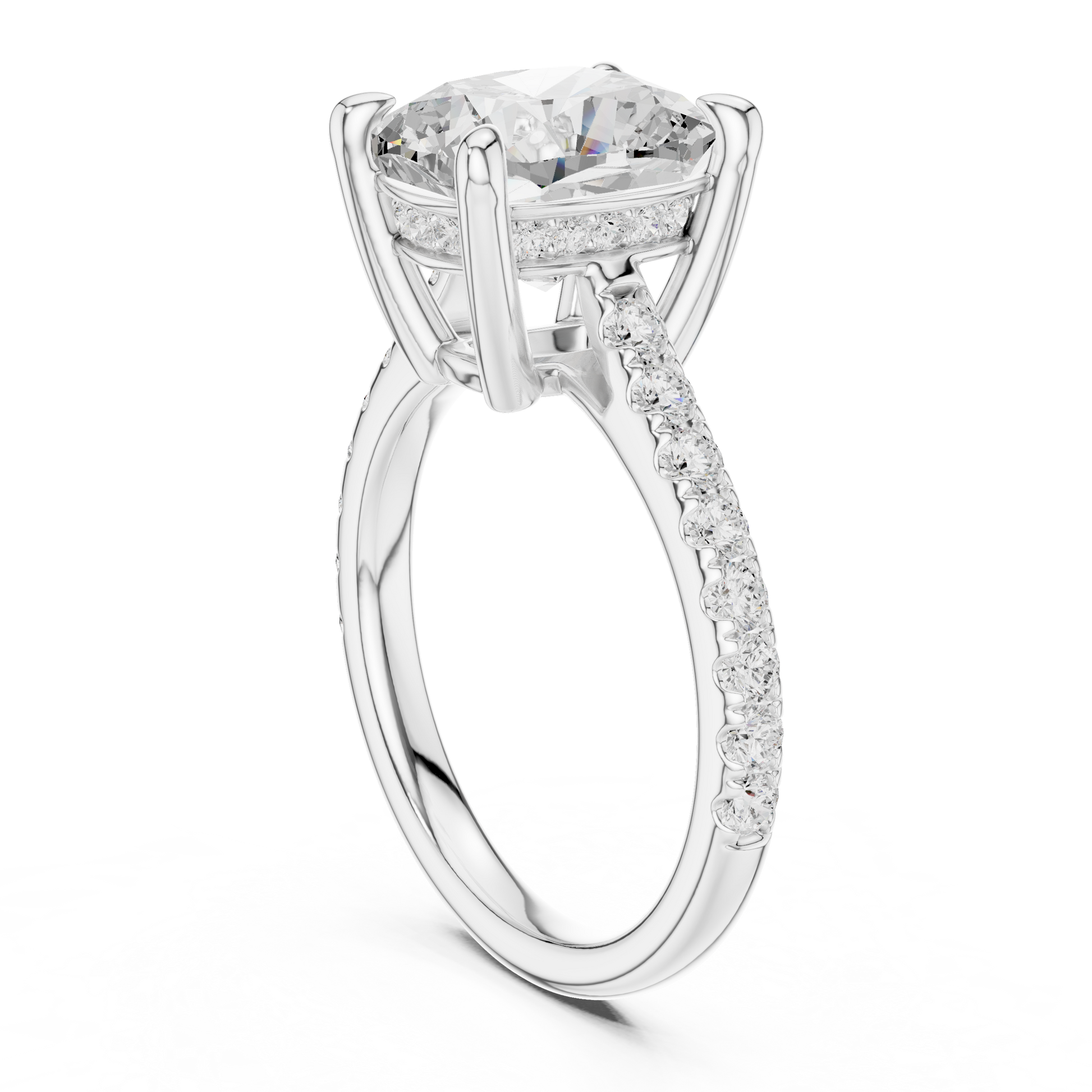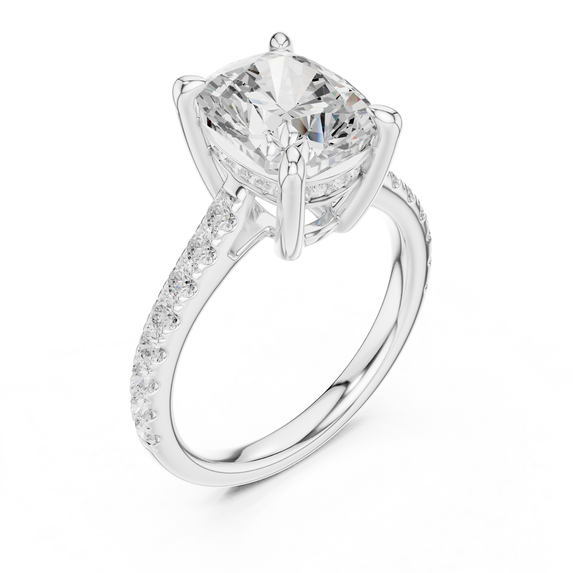 Crafted with exceptional precision, this cushion-cut diamond engagement ring by Ivevar Luxury radiates timeless brilliance and refined elegance. The design features a four-prong cushion solitaire, elevated by a hidden diamond halo that adds sparkle beneath the center stone. A pavé-set diamond band in polished gold enhances its graceful profile while maintaining a delicate silhouette.