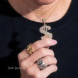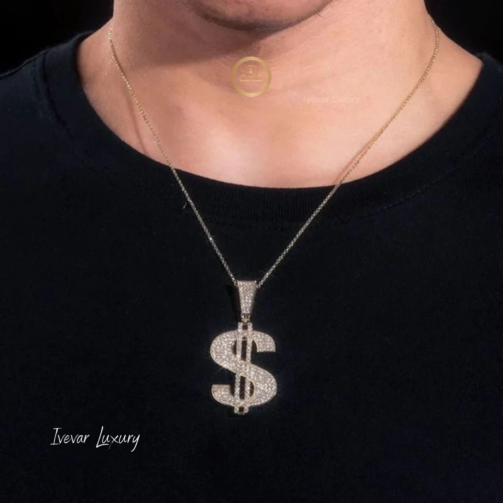 This stunning pendant is crafted from a yellow metal, likely gold, and completely covered with meticulously set lab-grown diamonds (pave setting). The iconic dollar sign motif suggests a theme of wealth, success, and statement luxury. Lab-grown diamonds offer a brilliant, ethically sourced, and cost-effective alternative to natural diamonds, ensuring maximum sparkle. The piece is clearly branded with a logo for Ivevar Luxury Jewellers. Its large size and high-shine finish make it a bold, high-end accessory, often associated with hip-hop culture and personalized style.