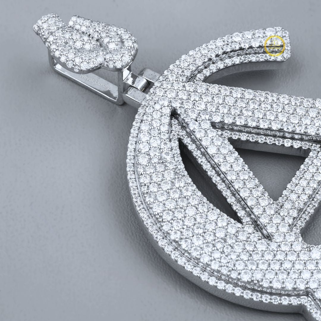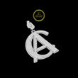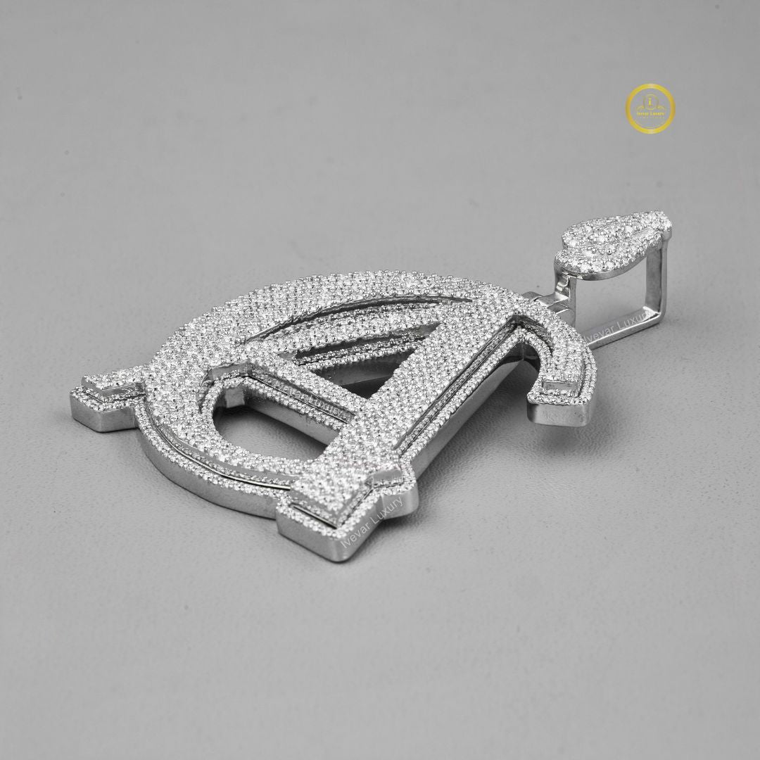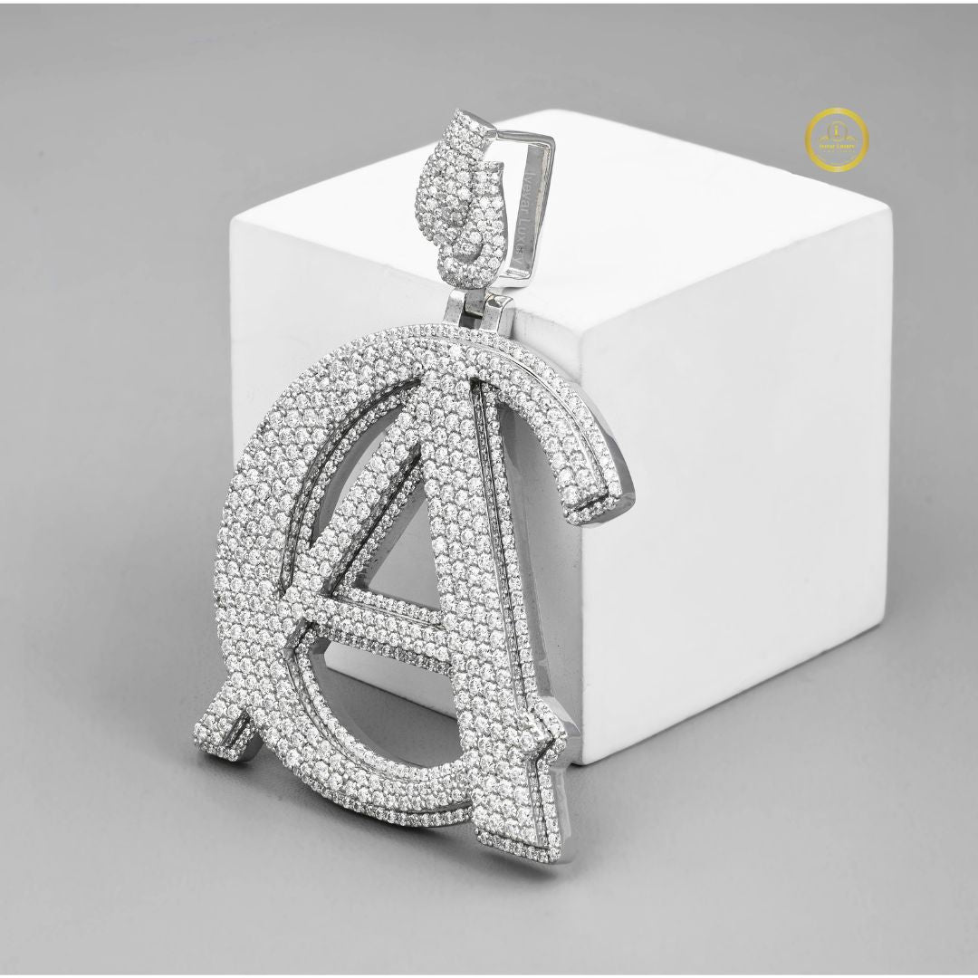 This stunning piece is completely "iced out," meaning its entire surface is covered in a dense pave setting of brilliant-cut, ethically sourced lab-grown diamonds. The design appears to be a stylized combination of two or more letters, most prominently a large 'A' crossed with a 'C' or a similar curved element, forming a unique logo. A diamond-set bail, shaped like a horseshoe or 'U', allows it to be worn on a chain. The piece is crafted in a single white metal tone, providing a bright, uniform sparkle. This pendant is a high-impact, custom statement piece, showcasing personalized luxury and maximalist style popular in modern jewelry.