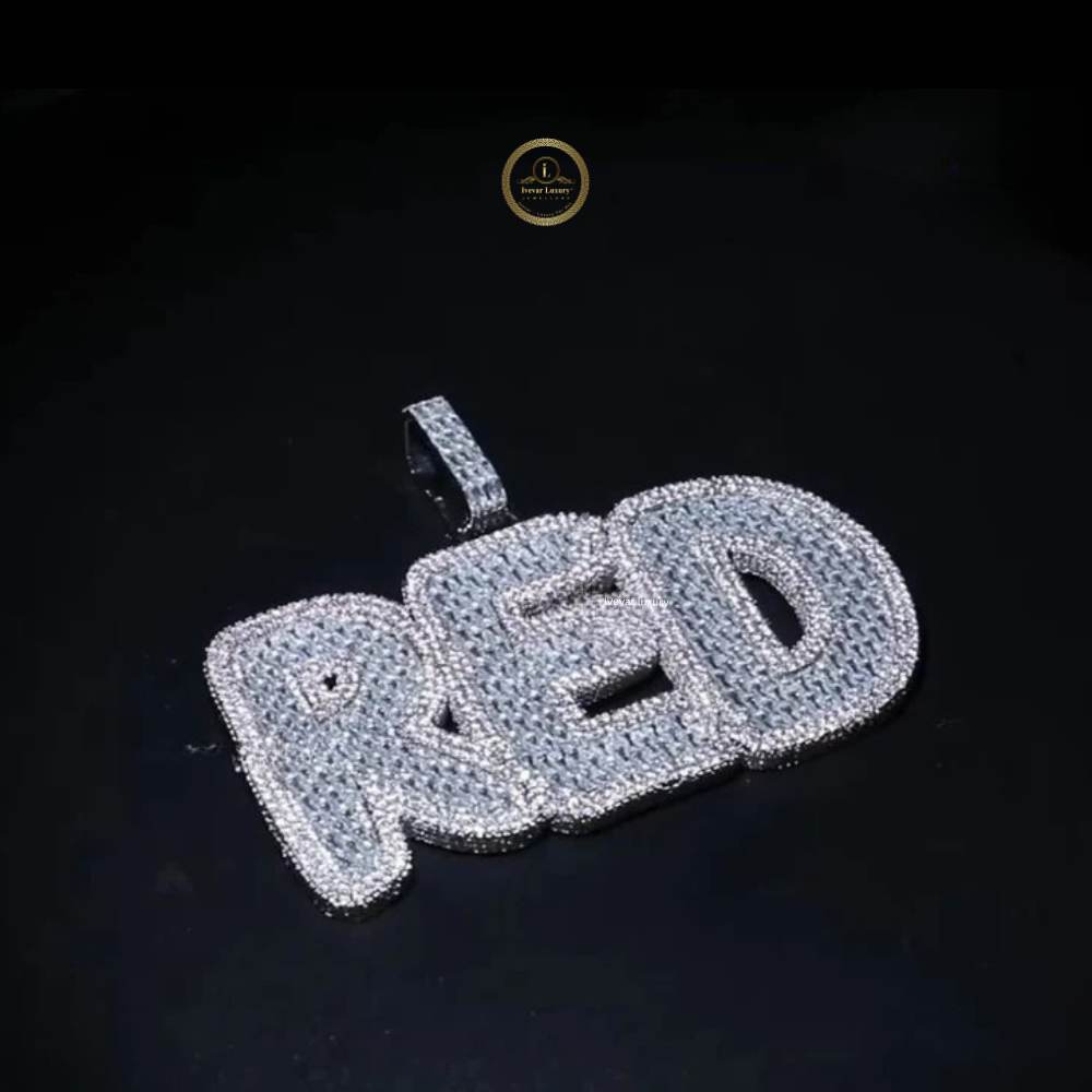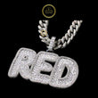 Custom-made pendant spelling out "RED," heavily iced with lab-grown diamonds. The piece features a prominent, three-dimensional bubble letter design where the surfaces are meticulously covered in brilliant, small, round-cut diamonds, complemented by larger, channel-set baguette-cut diamonds within the letters for maximum sparkle and depth.