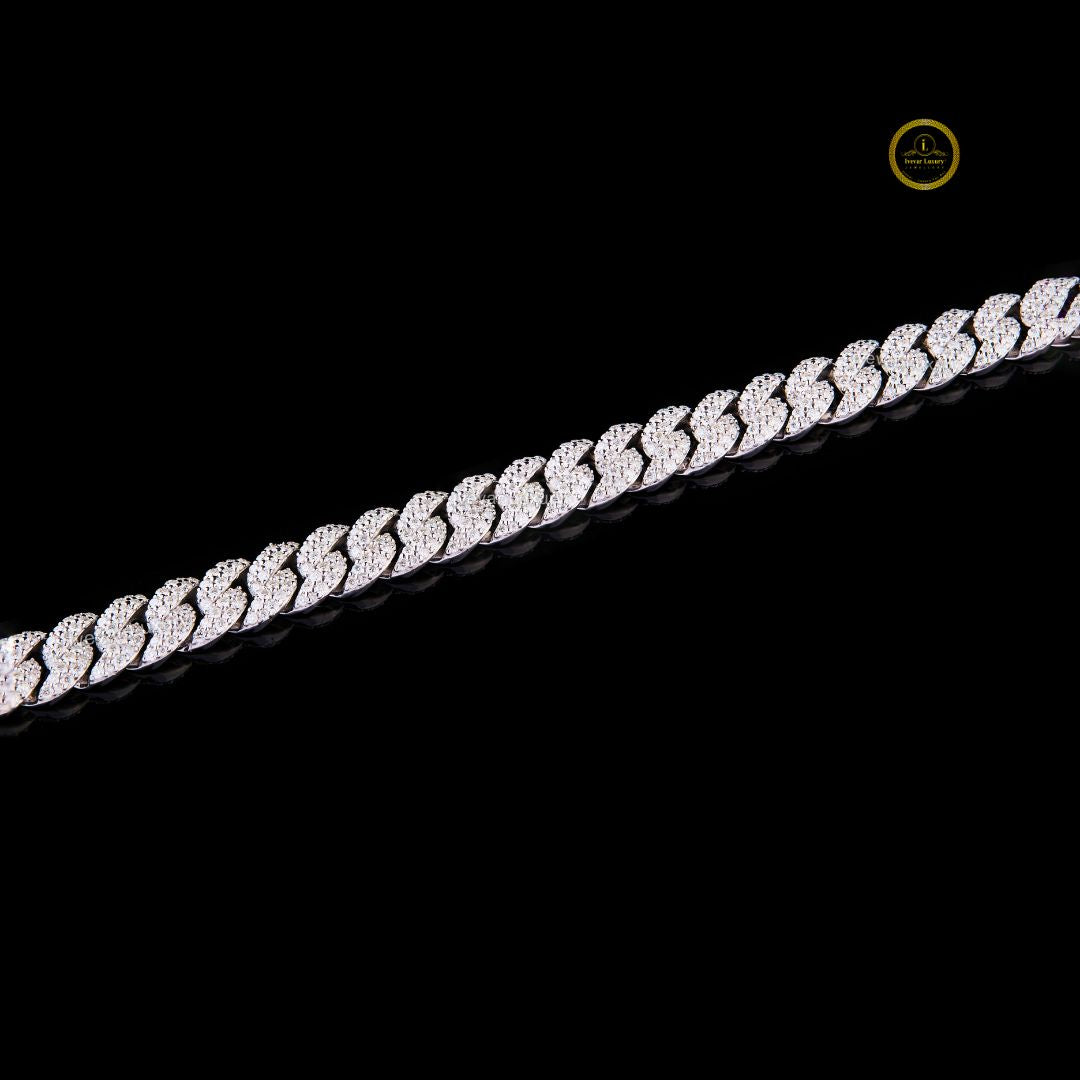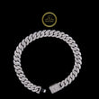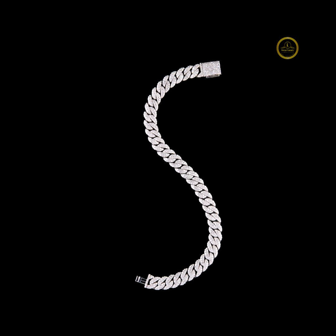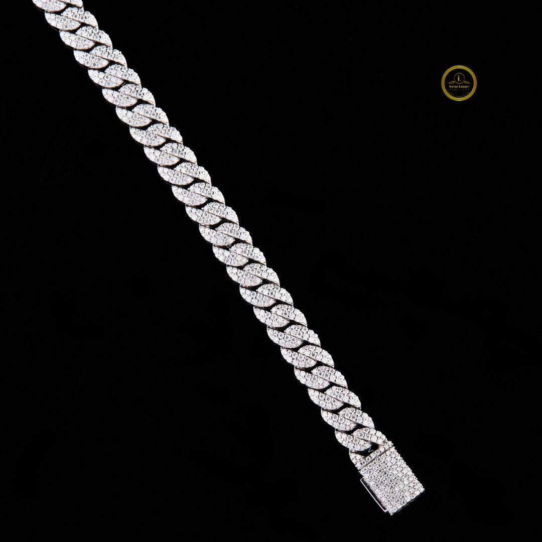 This bracelet features the iconic Cuban link design, characterized by interlocking, thick links that lie flat. The entire surface is meticulously covered, or "iced out," with brilliant lab-grown diamonds, giving it an intense and continuous sparkle. The metal appears to be white, likely white gold or sterling silver with a white gold finish. It is a bold, unisex statement piece often associated with modern, upscale hip-hop fashion or simply a desire for maximum luxury. The bracelet is secured by a box clasp, which is also paved with diamonds for a seamless, high-end look. Lab-grown diamonds offer the same physical and optical brilliance as mined diamonds, providing an ethical and durable piece of high-quality jewelry.