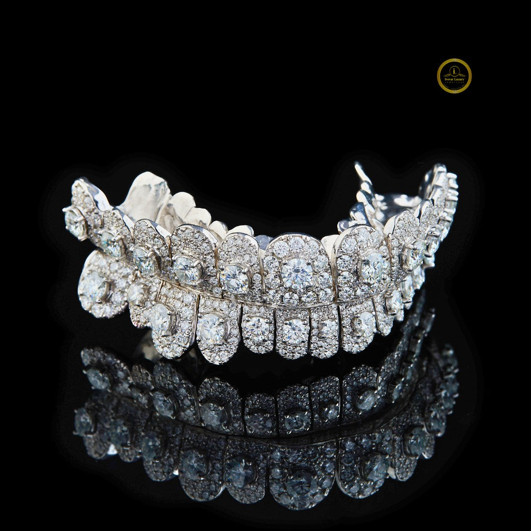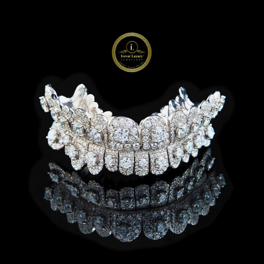 This piece is a magnificent example of "iced out" custom grillz, designed for luxury street style. It features brilliant, high-quality Moissanite stones, a popular and more affordable diamond alternative known for its exceptional fire and sparkle (often surpassing that of natural diamonds).