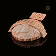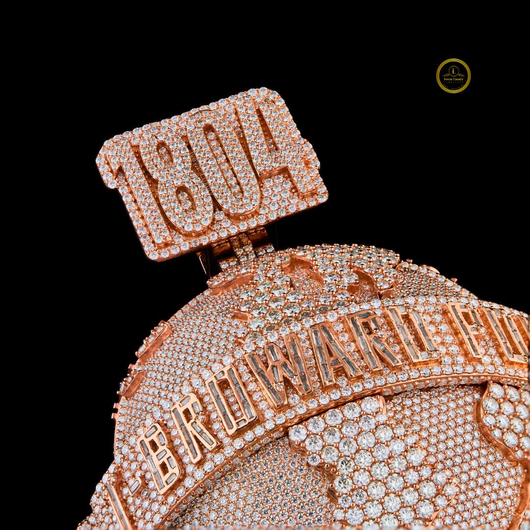 This is a spectacular custom pendant featuring a large diamond-encrusted globe design, likely made with lab-grown diamonds and set in rose or yellow gold-plated metal. The spherical design is completely paved with brilliant round stones, highlighting the continental outlines in a contrasting texture or setting.