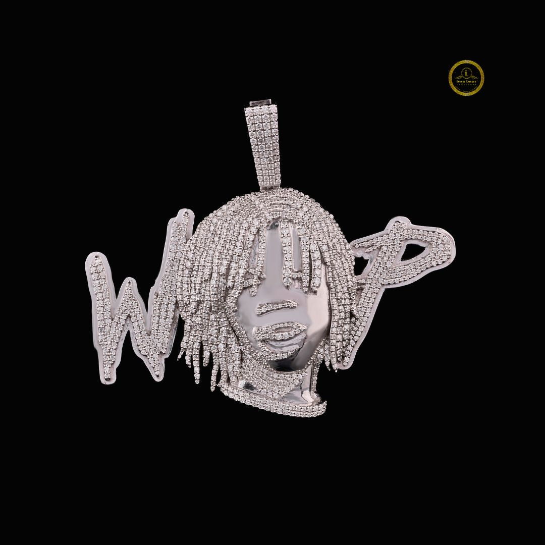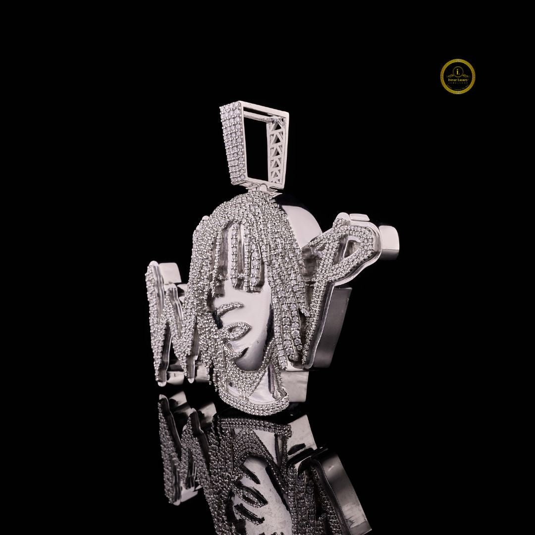 This is a large, highly personalized pendant featuring the stylized bust and hair of an individual, likely a rapper or musical artist, with letters or a name surrounding the head—perhaps spelling "WRLD" or a similar word. It is clearly a piece of custom celebrity or tribute jewelry from Ivevar Luxury Jewelers, as marked by the logo.
