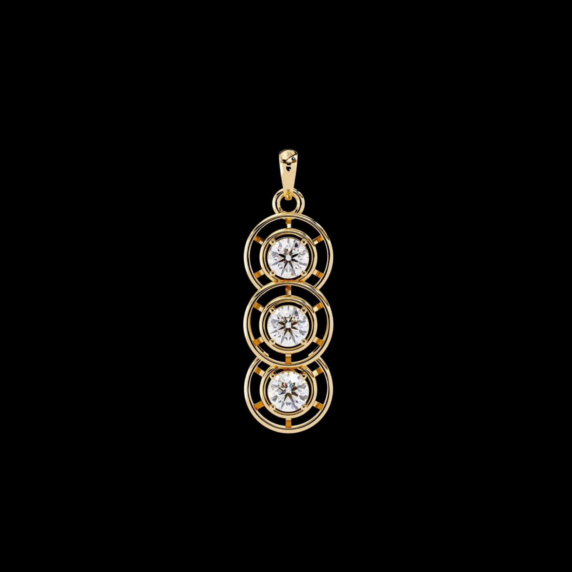 This exquisite pendant showcases timeless elegance with its luxurious design, featuring three Brilliant Round Cut gemstones set vertically within gleaming concentric gold circles. The radiant stones capture and reflect light beautifully, creating a dazzling effect that enhances the pendant’s sophistication. Ivevar Crafts in polished gold, the piece exudes refined charm and balance, making it a perfect statement accessory for both formal and everyday wear.