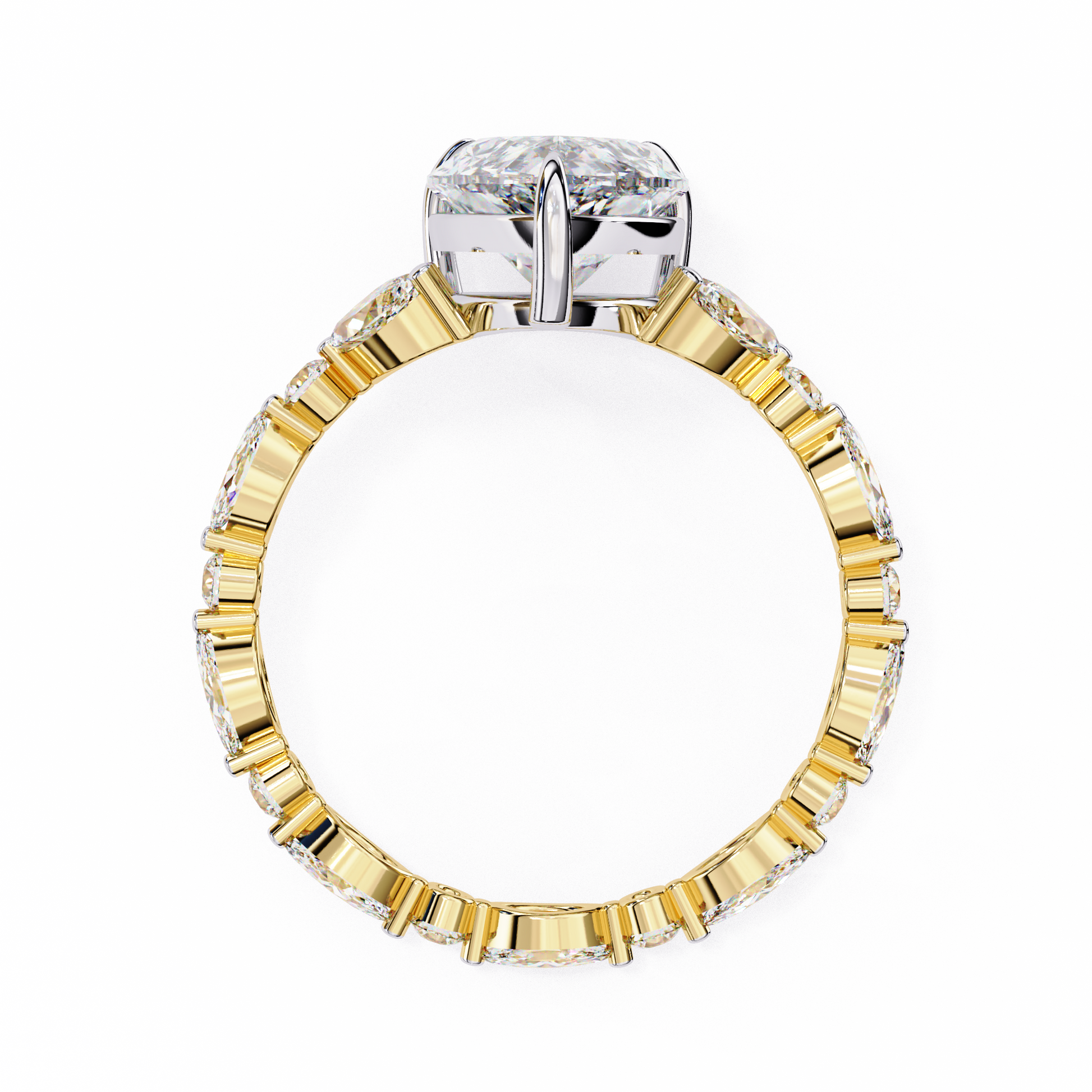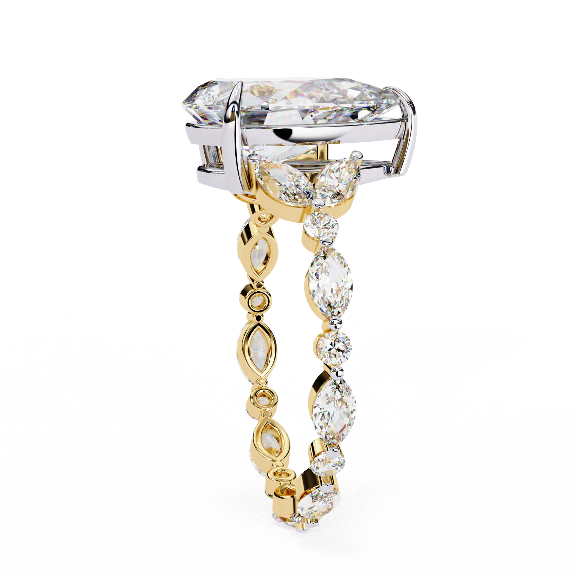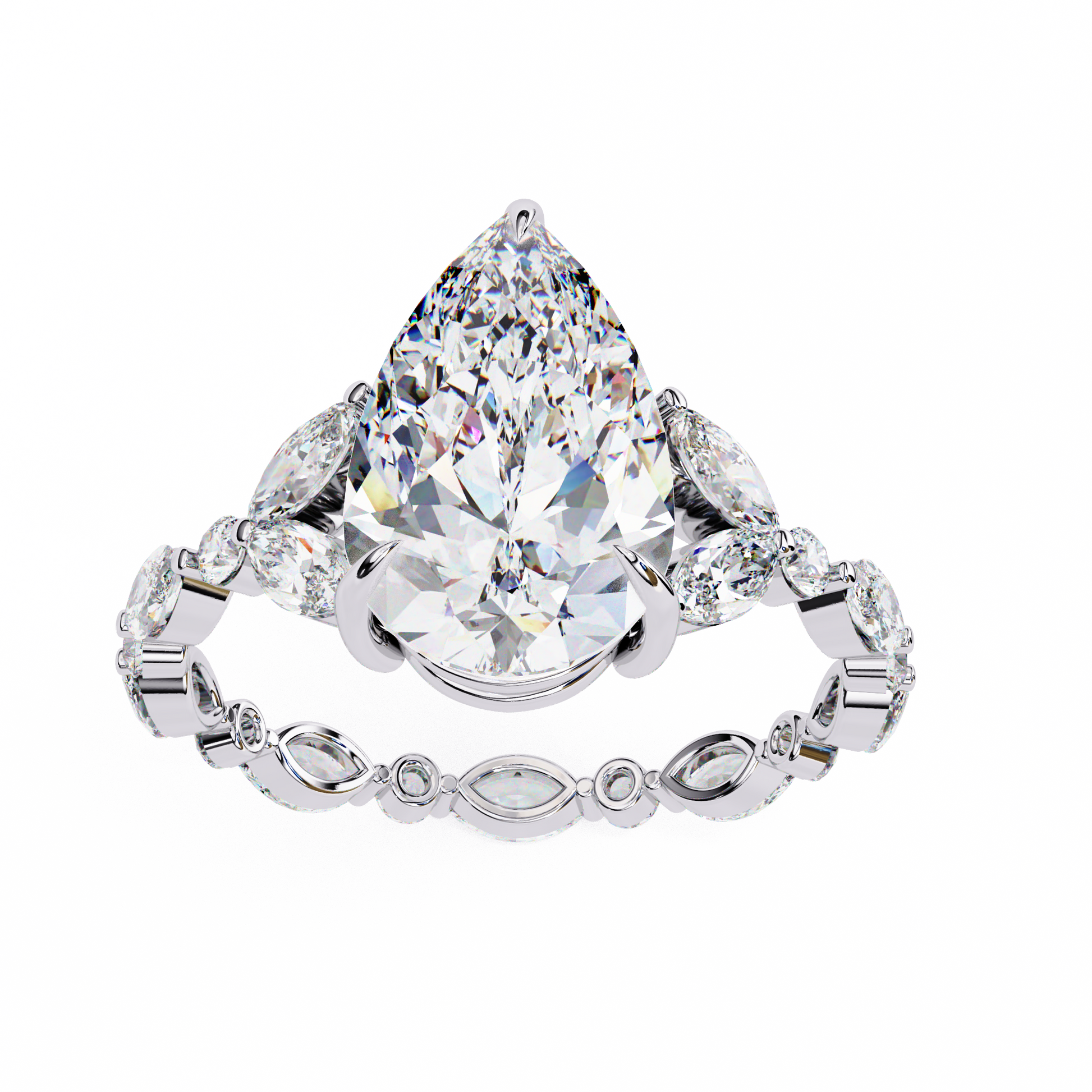 This exquisite Pear Cut Diamond Ring embodies elegance and natural beauty through its vine-inspired design. The centerpiece an impressive pear cut diamond radiates brilliance with every facet, drawing the eye instantly. Flowing from the central stone, marquise and round diamonds form an intricate vine motif along the gold ring, adding depth, dimension, and organic charm.