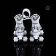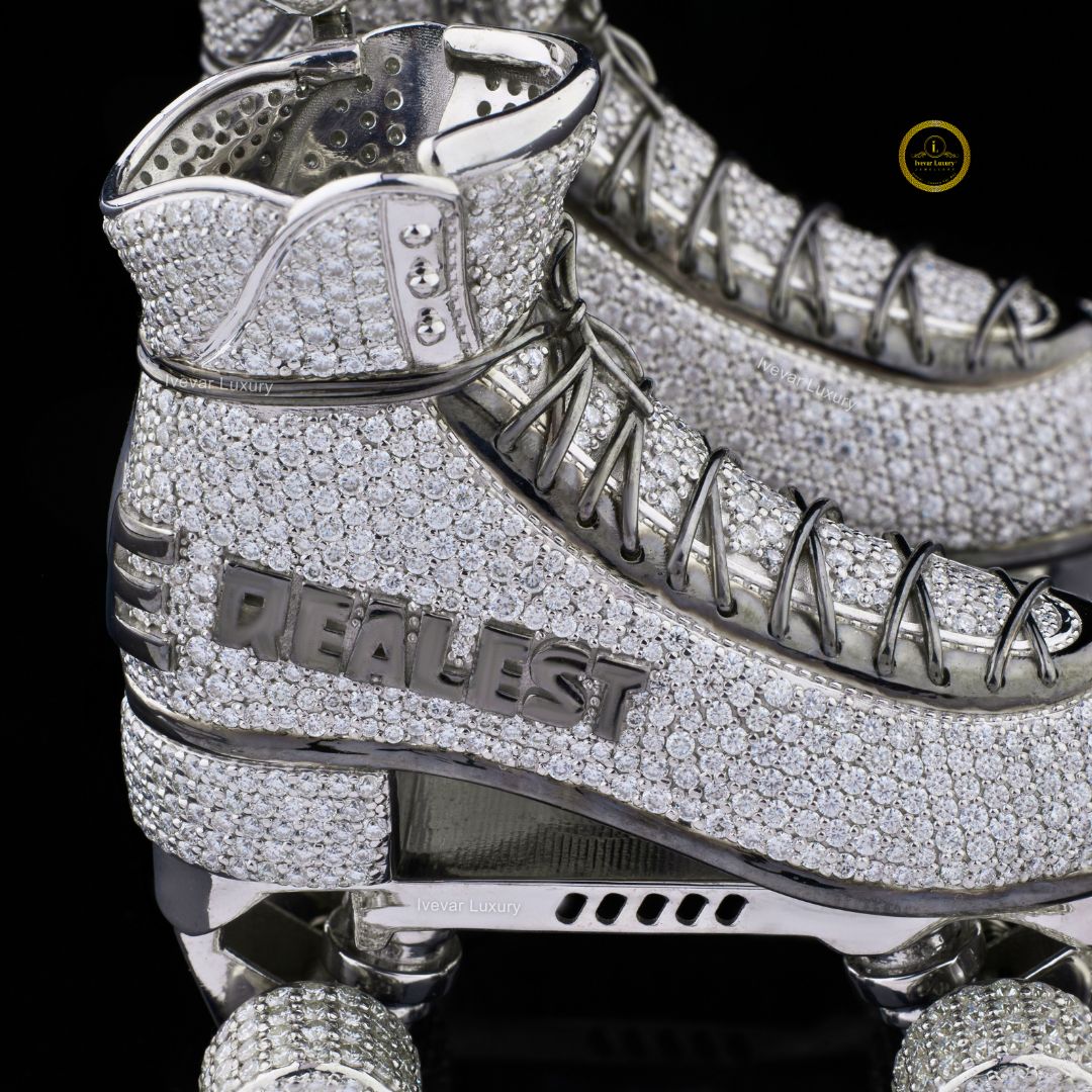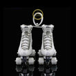 This striking piece is a detailed miniature of a pair of roller skates, completely encrusted with lab-grown diamonds for maximum sparkle and luxury. The design features realistic boot detailing, including laces and eyelets, all meticulously paved with brilliant stones. The wheels are also fully covered in diamonds, ensuring 360-degree shine. The pendant is crafted from a high-quality metal, likely white gold or sterling silver, providing a sleek, reflective backdrop. The bail connecting the skates to the chain is oversized and appears to be a separate, complementary design element. It’s a bold, custom statement piece perfect for someone with a passion for skating or unique, eye-catching jewelry.