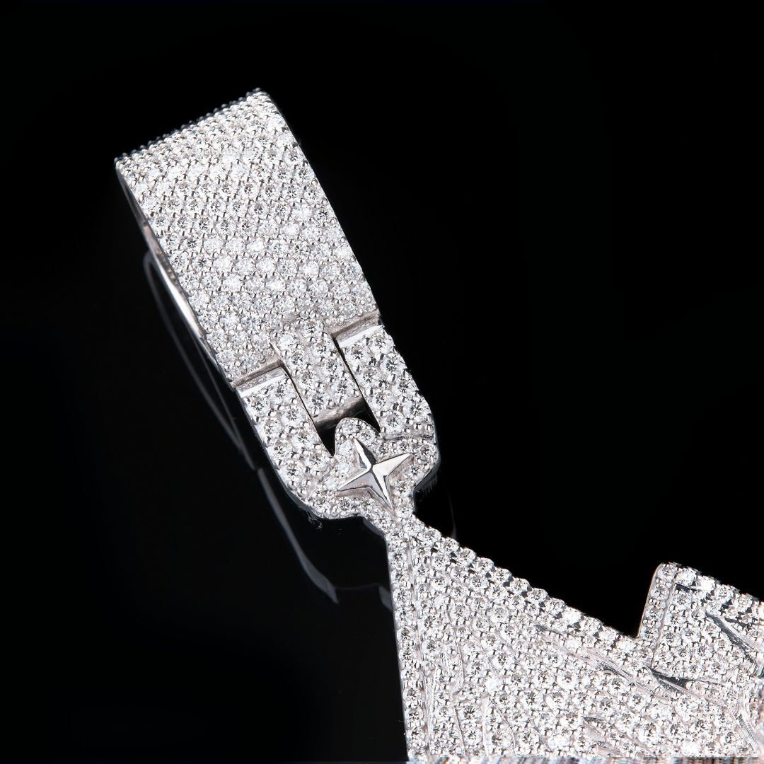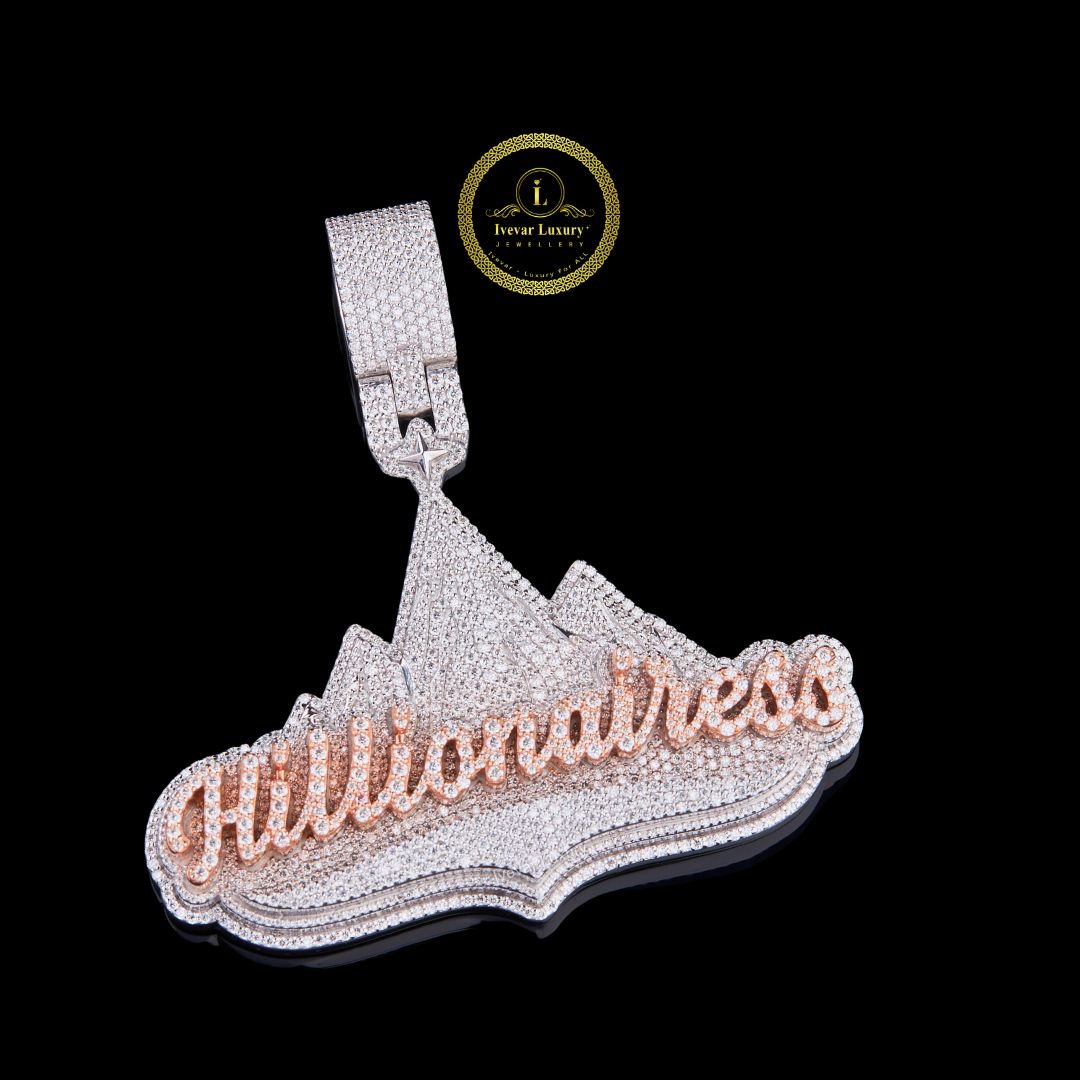 This extraordinary custom pendant is a statement piece featuring the word "Hillionairess" set against a dramatic, snow-capped mountain backdrop.