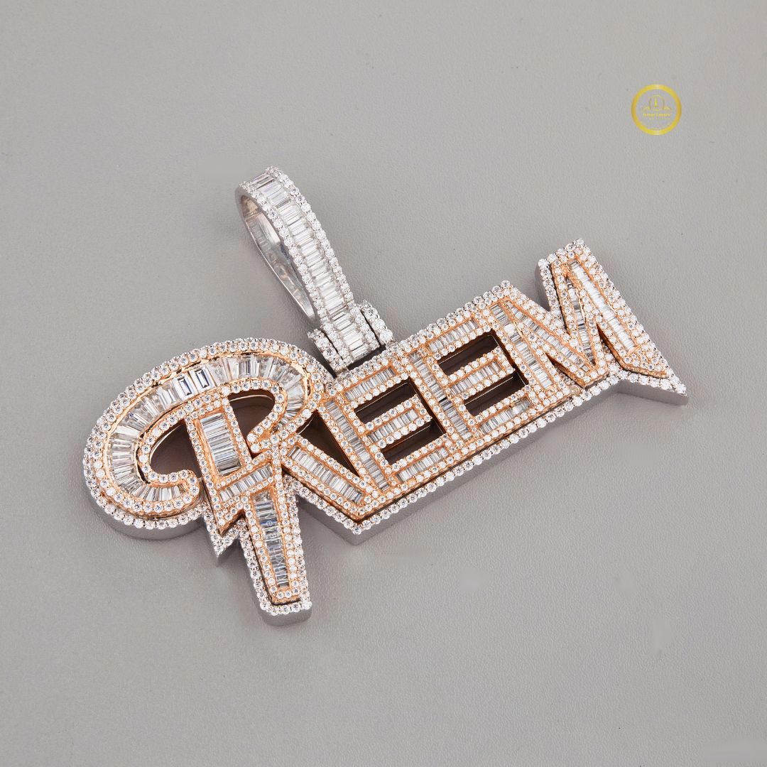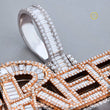 The design showcases a sophisticated use of two different stone cuts: the prominent capital 'R' and the main body of the letters are filled with large, horizontal baguette-cut Moissanite diamonds. This gives the lettering a clean, brilliant, and linear flash. The edges of the letters are outlined with smaller, brilliant round-cut Moissanite diamonds, enhancing contrast and visibility. The bail (attachment loop) is also fully paved with baguettes, making this an opulent and personalized statement piece designed for maximum visibility.