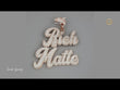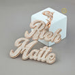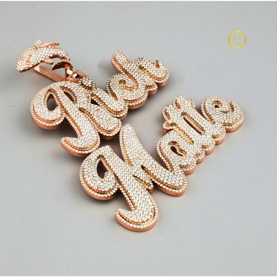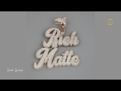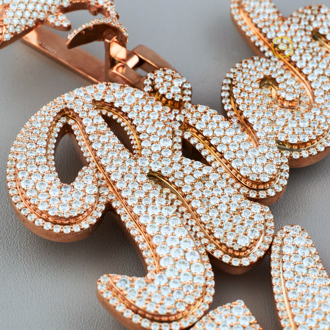 This is an opulent and detailed custom script pendant spelling out "Rich Matte," likely made with lab-grown diamonds set in rose gold. The cursive font is bold and fully covered in brilliant-cut stones, creating a dazzling, unified display.