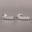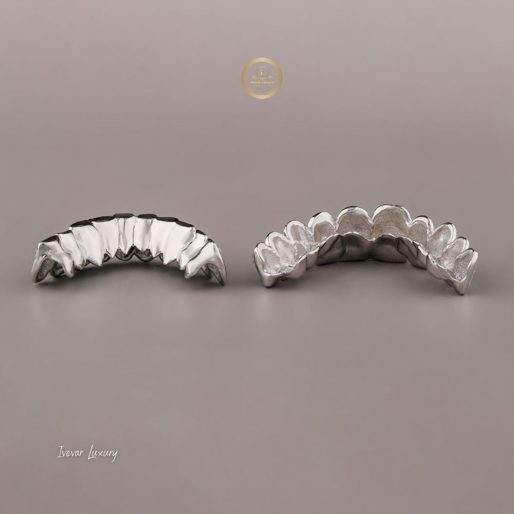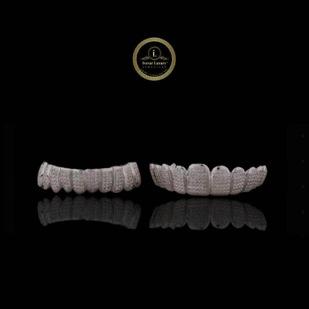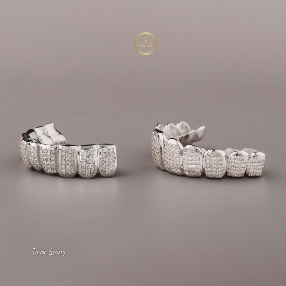 These are high-end, bespoke dental accessories designed to cover the teeth, made from an undisclosed precious metal (likely white gold or silver) and heavily encrusted with Moissanite stones. Moissanite is a popular diamond alternative known for its exceptional brilliance, fire, and durability, offering a luxurious look at a lower cost than natural diamonds.