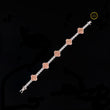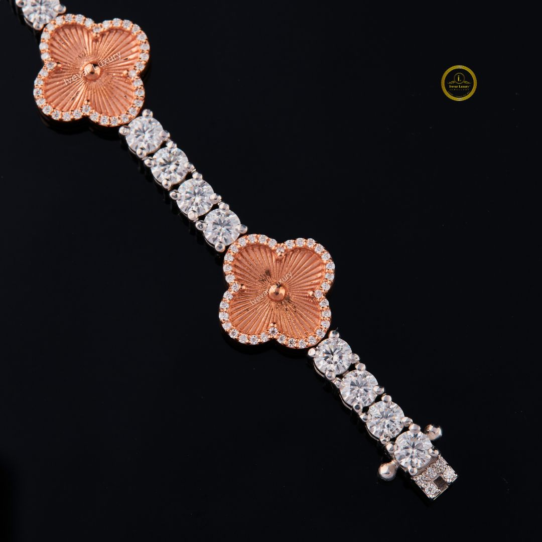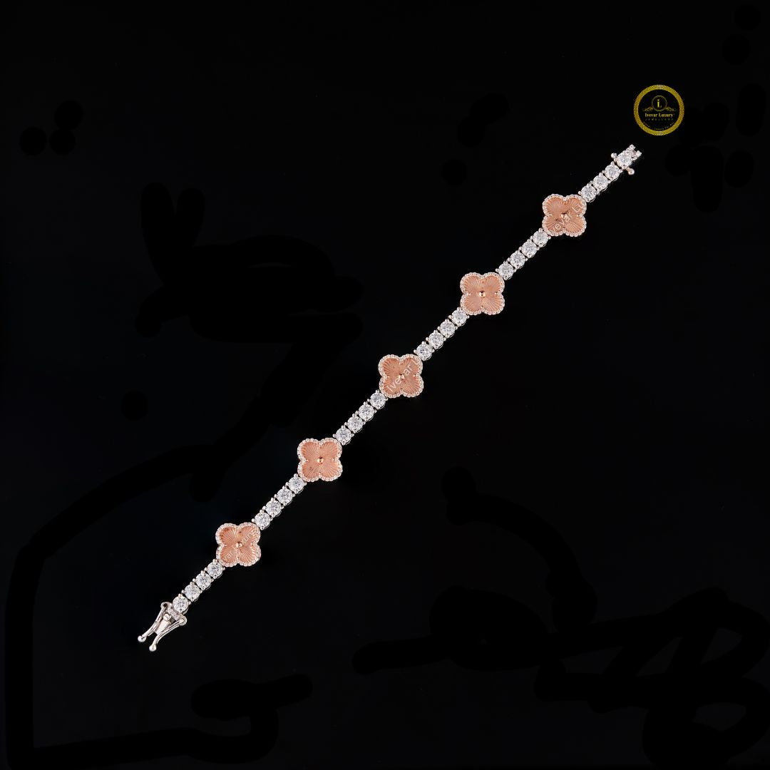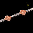 What makes it unique is the incorporation of polished rose gold clover or quatrefoil motifs that are spaced evenly along the main diamond band, adding a romantic and elegant flair. The combination of the white diamonds/metal and the rose gold accents creates a striking two-tone effect. It's a sophisticated, feminine piece that merges the timeless appeal of a diamond line bracelet with a fashionable, decorative element.