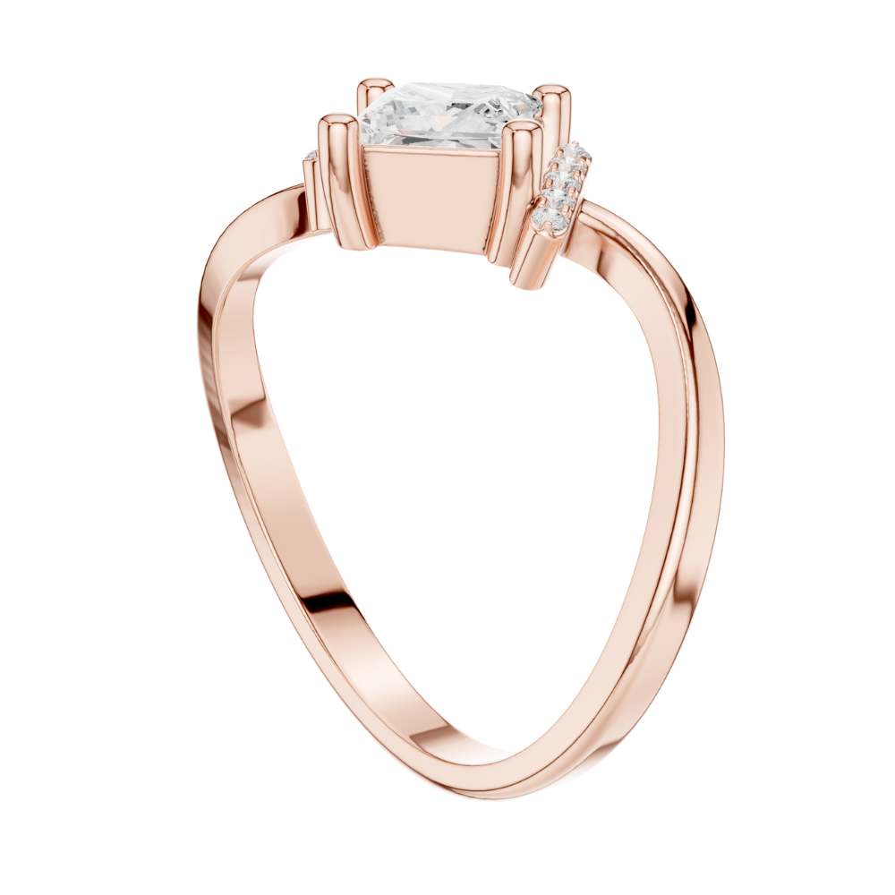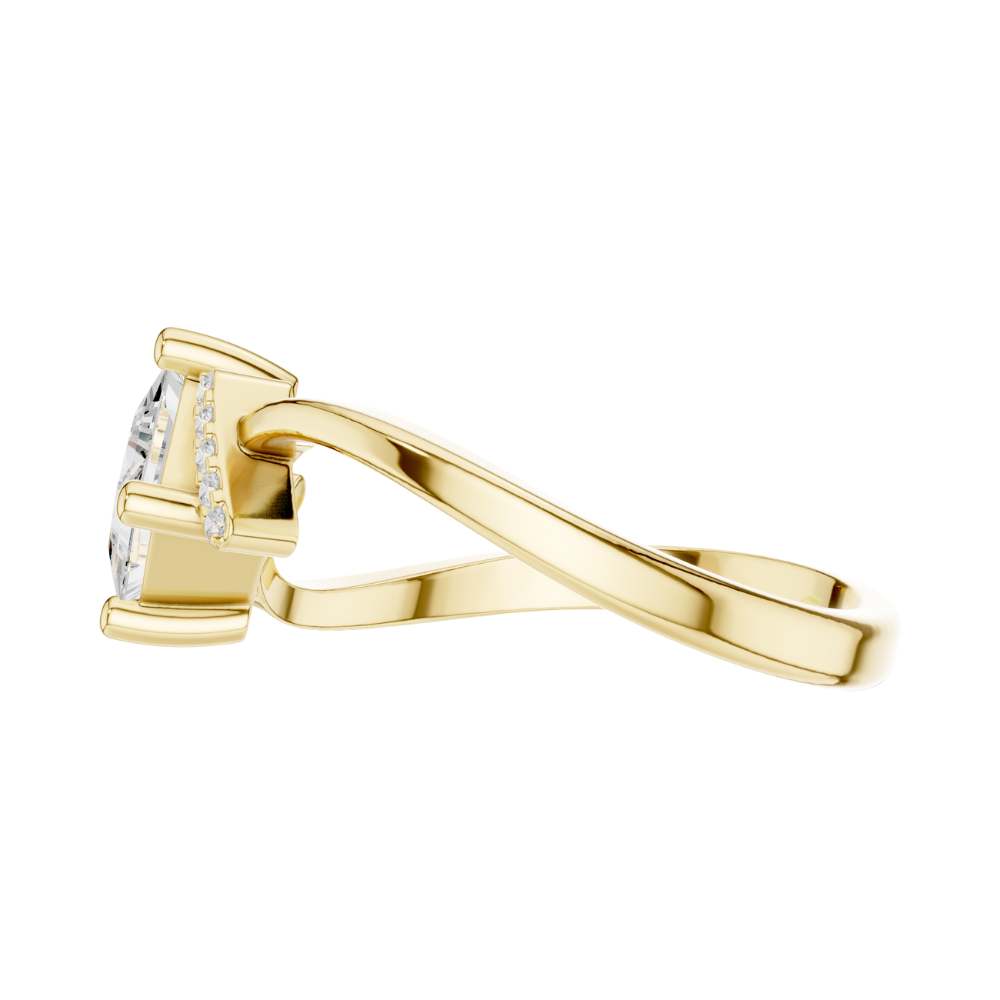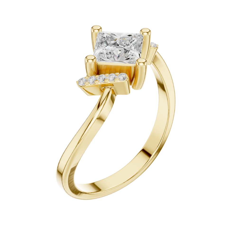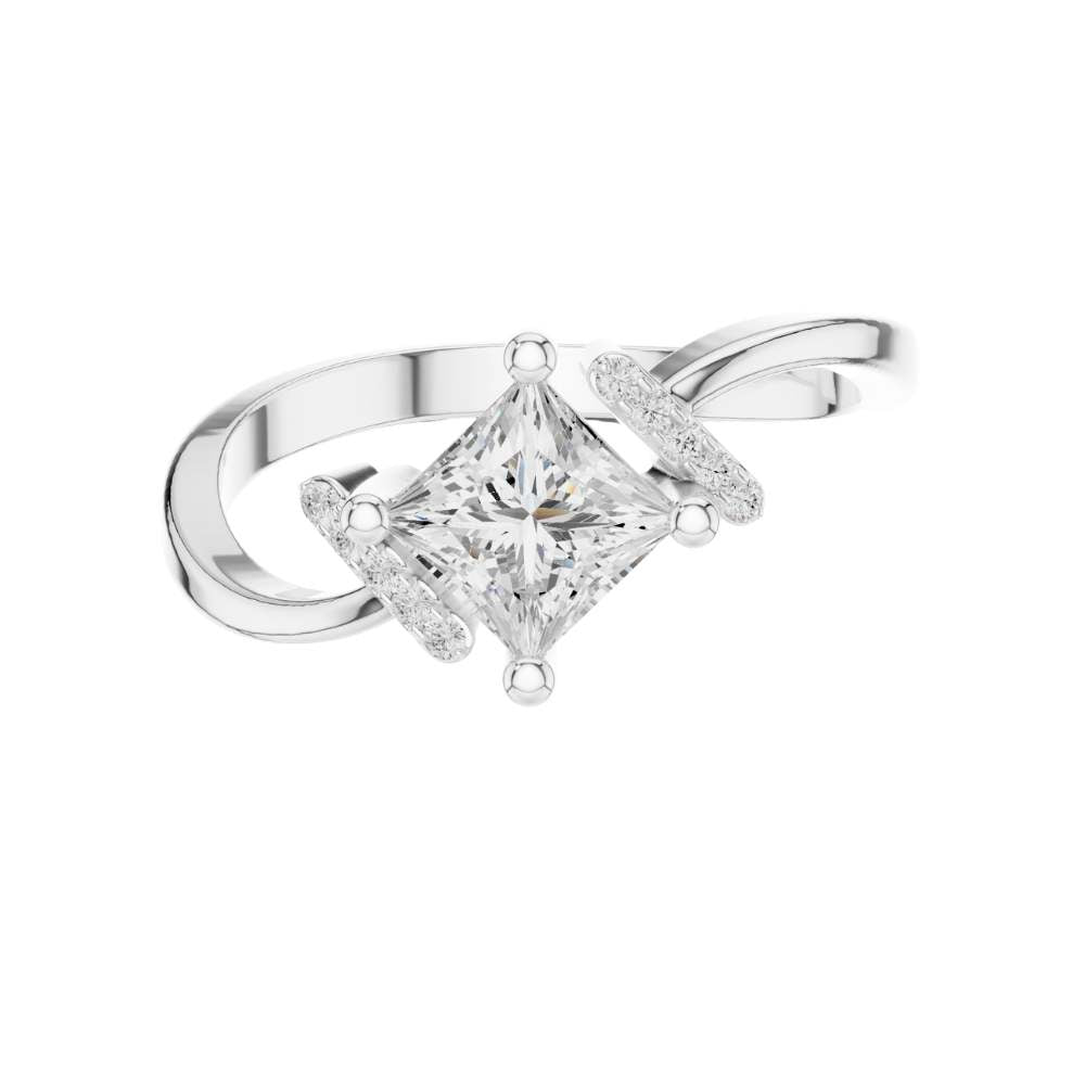 This captivating ring showcases a brilliant princess-cut center diamond set within a unique twisted gold band, blending elegance with contemporary flair. The diagonal orientation of the center stone adds a striking geometric touch, while pave-set accent diamonds on each side enhance its radiance and visual depth. With its graceful curves and bold architectural styling, this piece offers a sophisticated yet modern look—perfect for engagements, anniversaries, or anyone drawn to distinctive, artistic jewelry design by Ivevar.