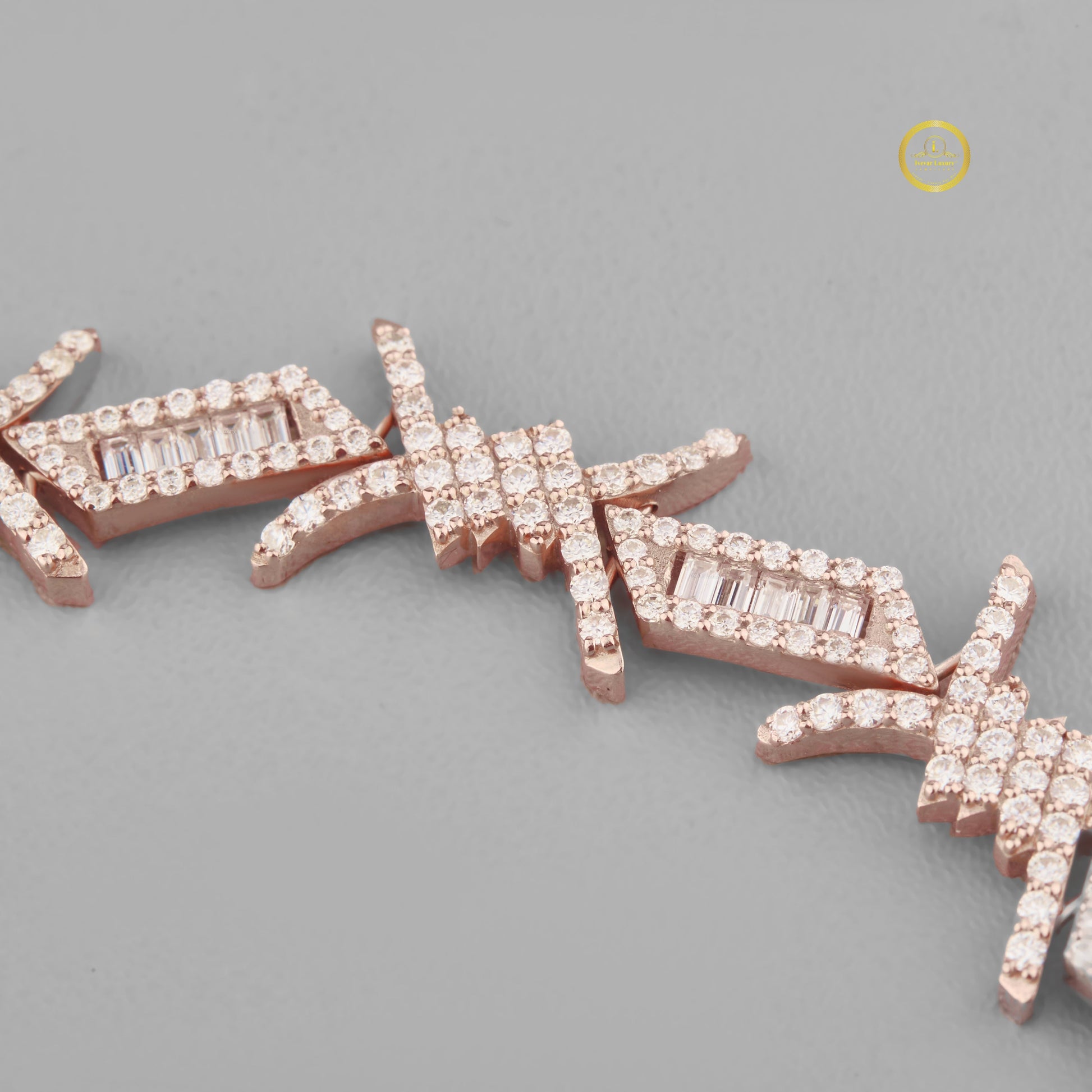 The links are heavily encrusted with sparkling lab-grown diamonds, utilizing a combination of cuts, most notably baguette-cut diamonds set in the center sections and smaller round brilliant-cut diamonds paving the spiky edges. This blend of cuts enhances the texture and light reflection. The overall aesthetic is edgy, hip-hop-inspired, and eye-catching, making a strong fashion statement. As it uses lab-grown diamonds, it offers an ethical and sustainable luxury option for those seeking a modern, standout piece of jewelry.