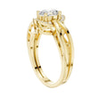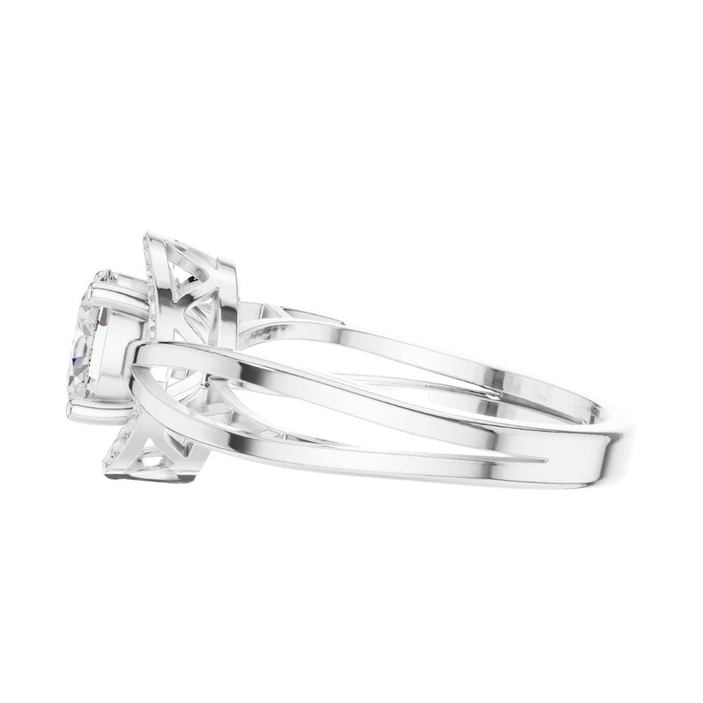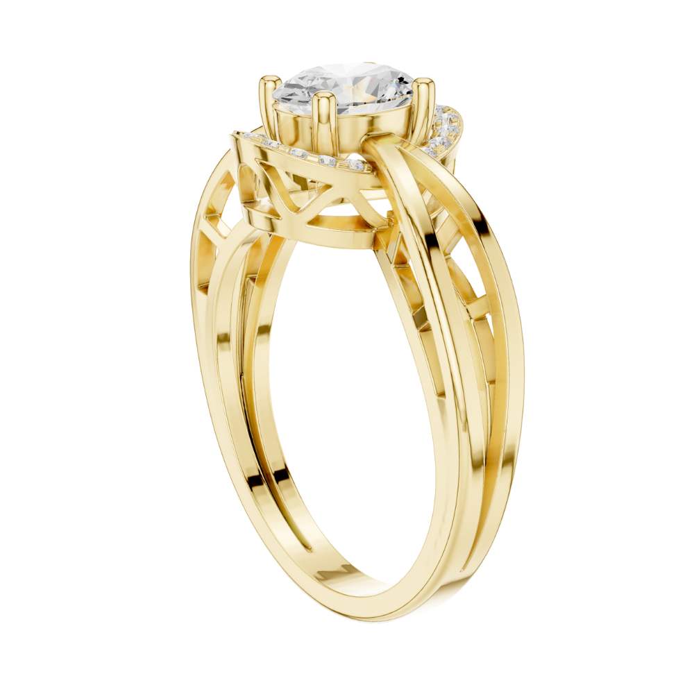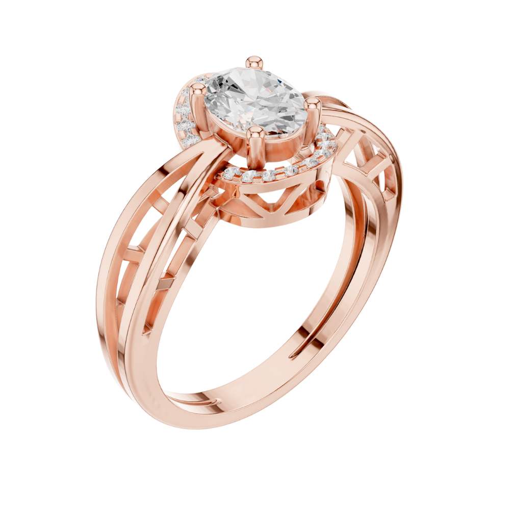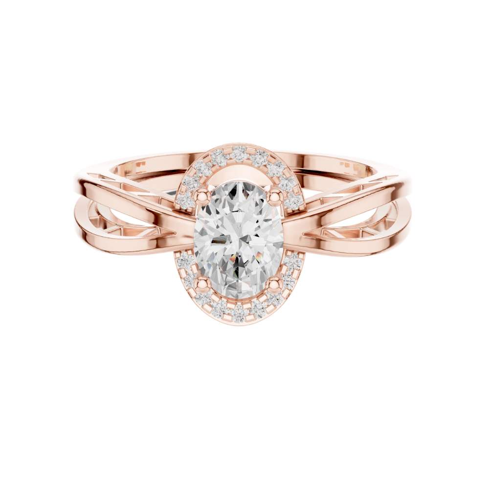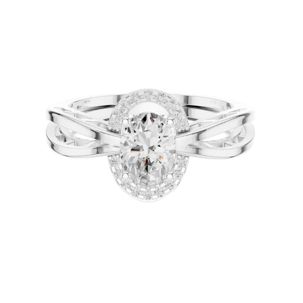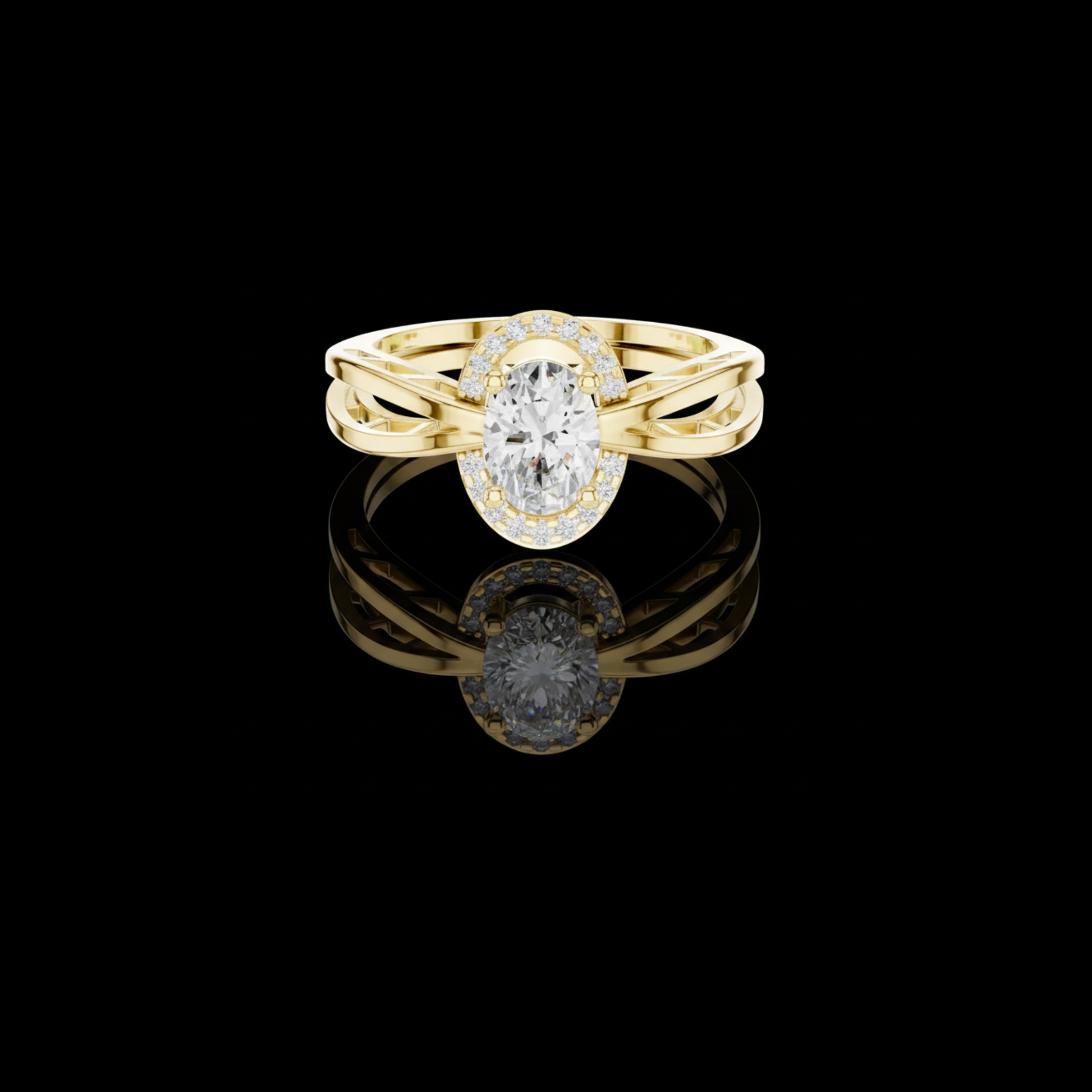 This exquisite engagement ring features a dazzling oval-cut center diamond framed by a radiant halo of smaller round diamonds, creating a luminous and elongated silhouette. Its beautifully crafted split-shank band in polished gold adds a modern, architectural touch while enhancing the ring’s overall brilliance and symmetry. The combination of the graceful oval shape, halo sparkle, and intricate band design makes this ring a captivating expression of elegance, romance, and timeless craftsmanship by Ivevar Luxury.