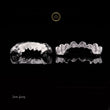 This stunning accessory is a complete set of custom grillz, covering the upper and lower teeth. Crafted from a high-polish white metal, the pieces are completely "iced out" using numerous baguette-cut lab-grown diamonds. This cut is stacked both vertically and horizontally across the teeth to create a brilliant, wall-to-wall shimmer. Unlike traditional pave settings, the baguette stones provide a sleek, stepped, and modern look. As custom-made dental jewelry, these grillz are precision-fitted to the wearer's mold for maximum comfort and an eye-catching, luxurious statement.